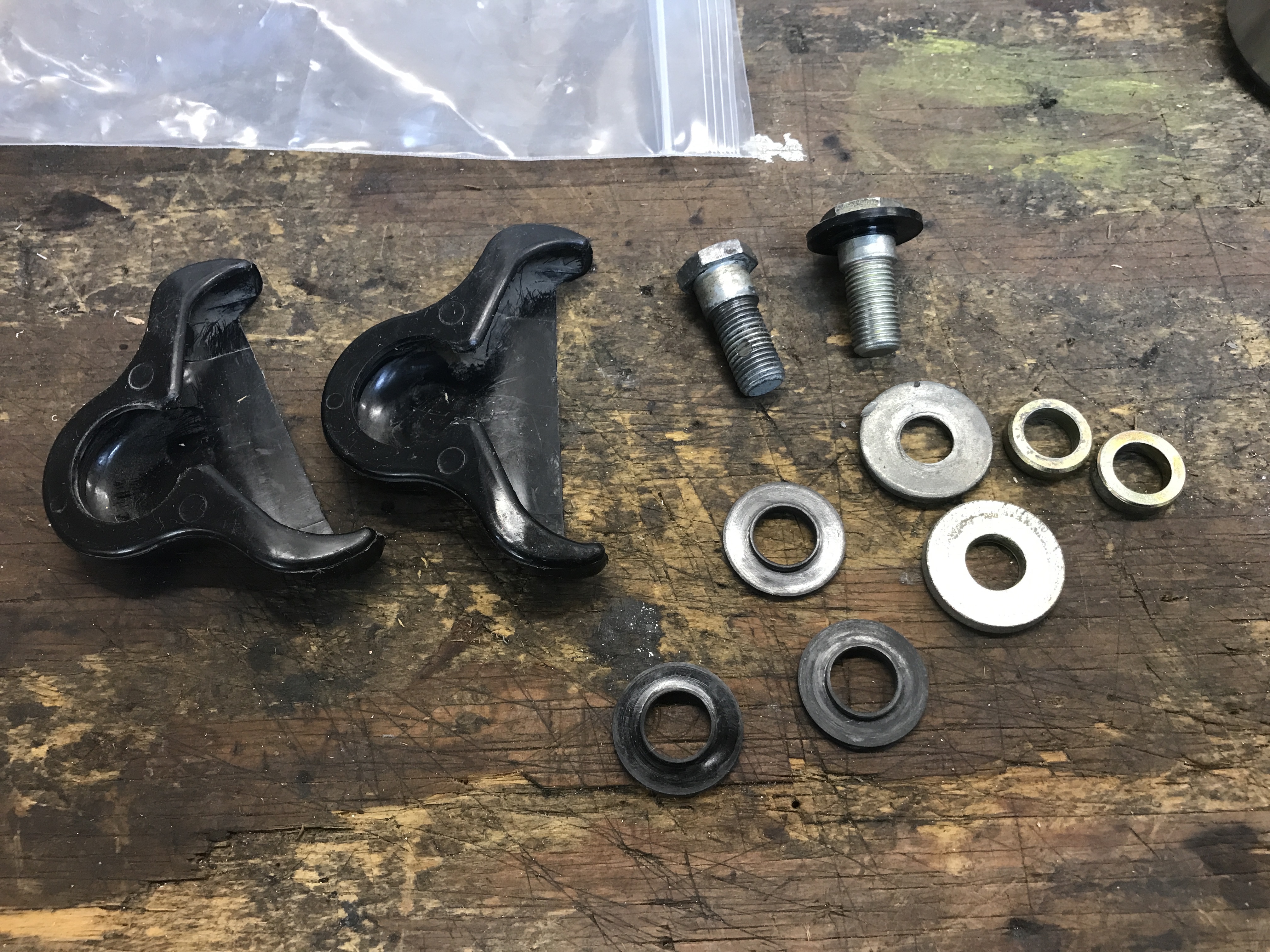 Here's the order: bolt-plastic washer-yoke-plastic washer-large metal washer-metal spacer.