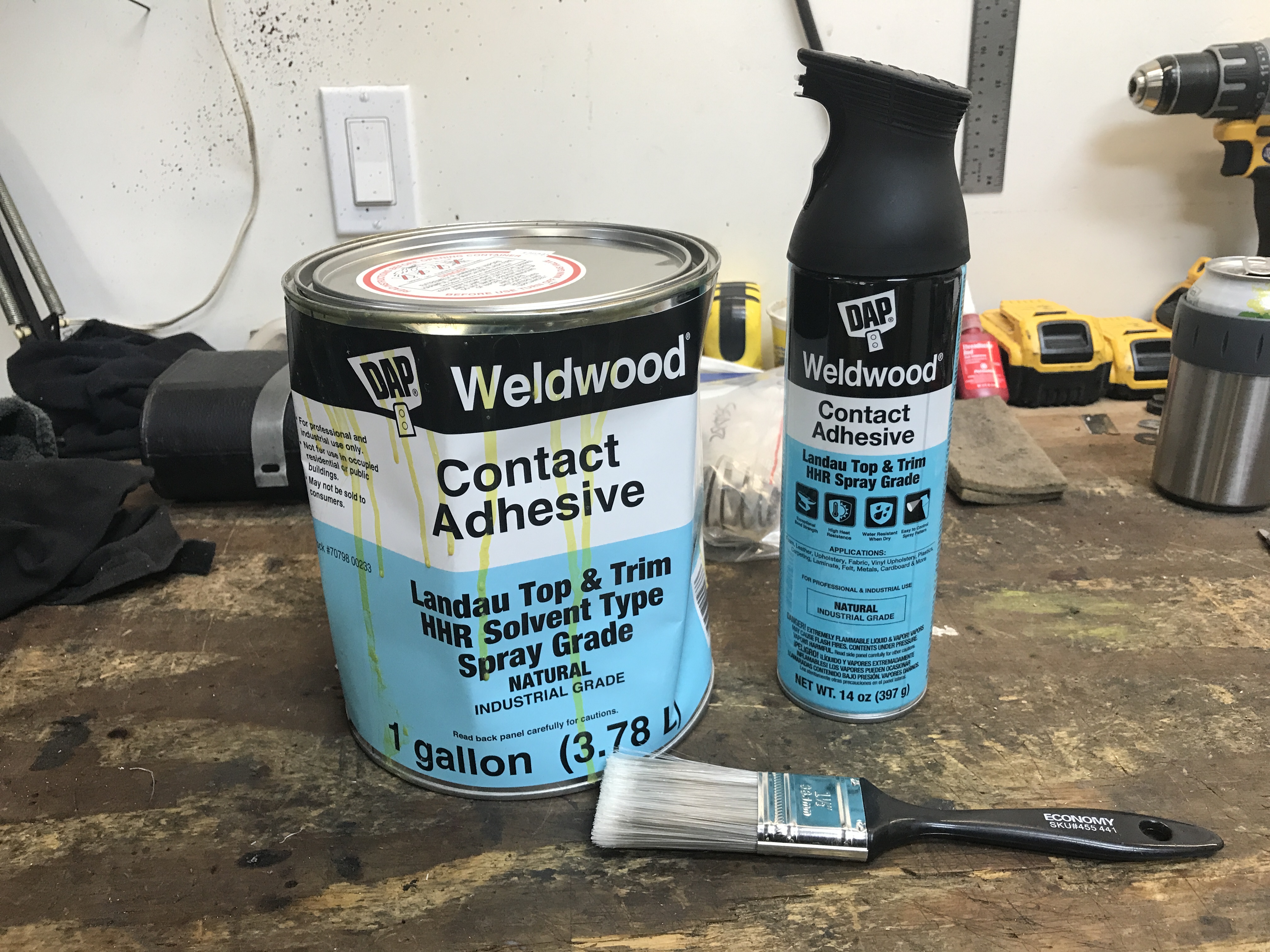 I got out my contact adhesive. Brush-on for the car interior, and spray-on for the back side of the carpet. Attached thumbnail(s) |