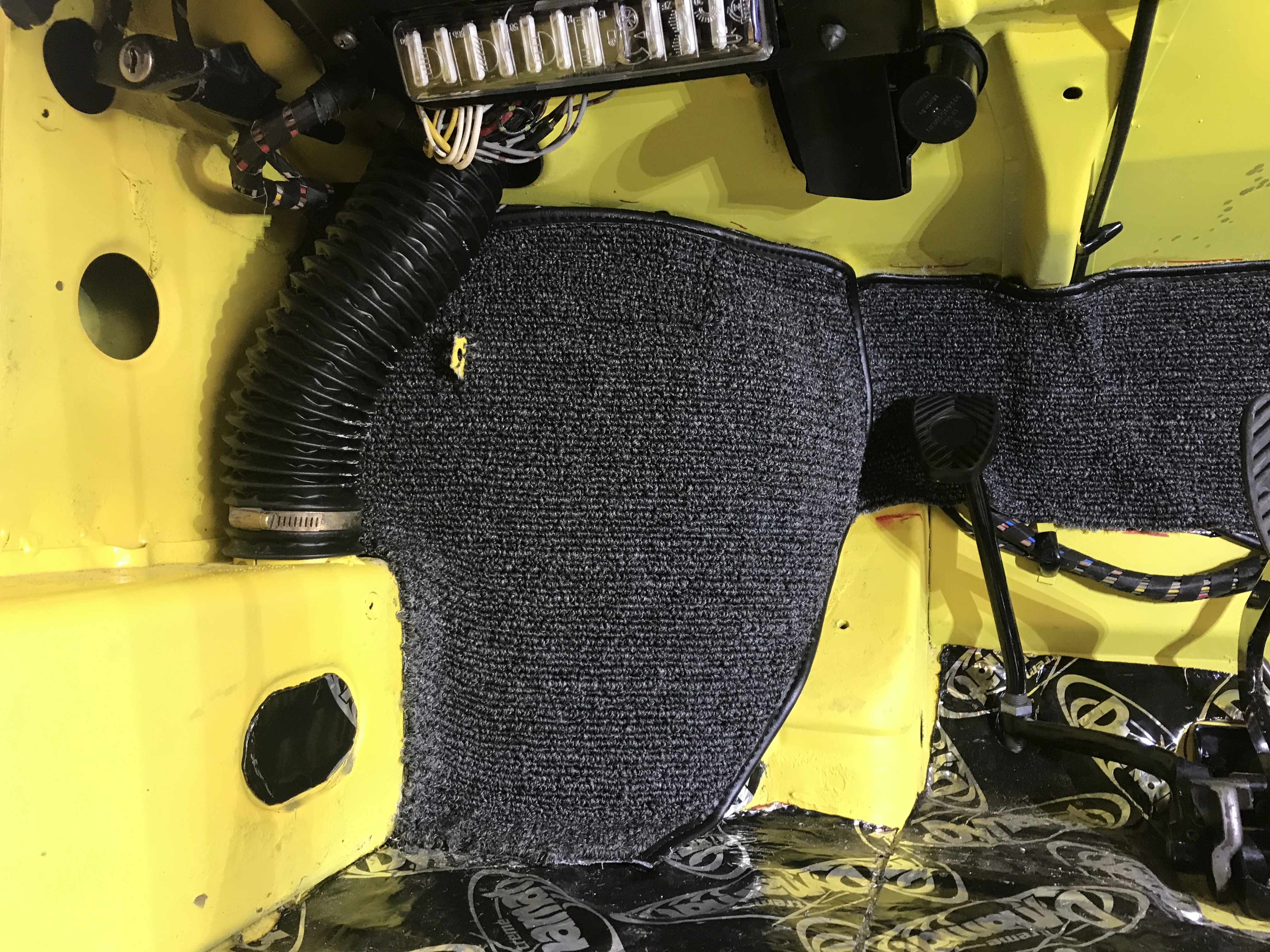 Passenger footwell and right fender well. I cut the opening to mount around the steering shaft.
