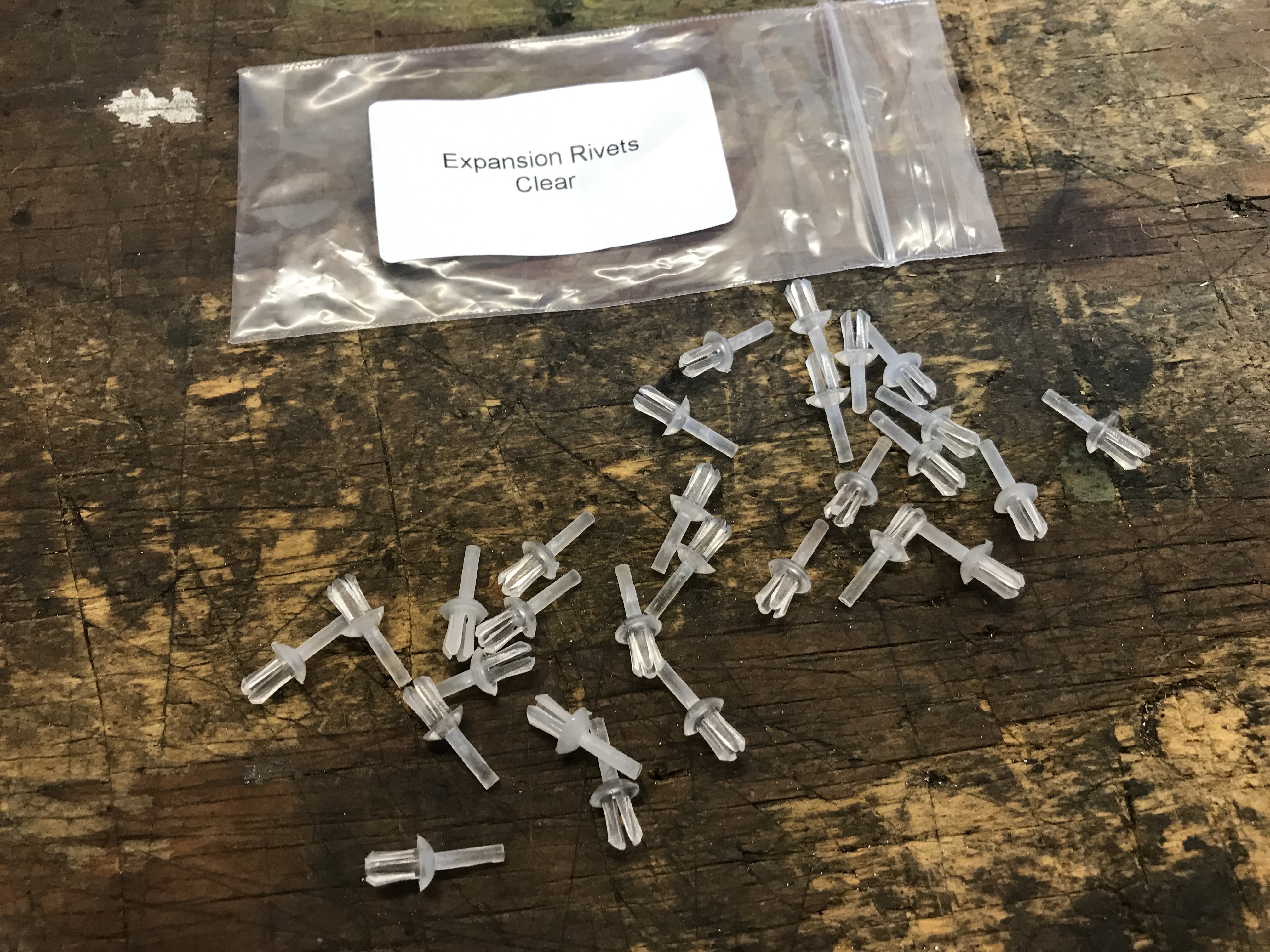 And new plastic rivets. BTW, I did discover that the center stud has to first be snapped off the base, and then inserted into the center hole.