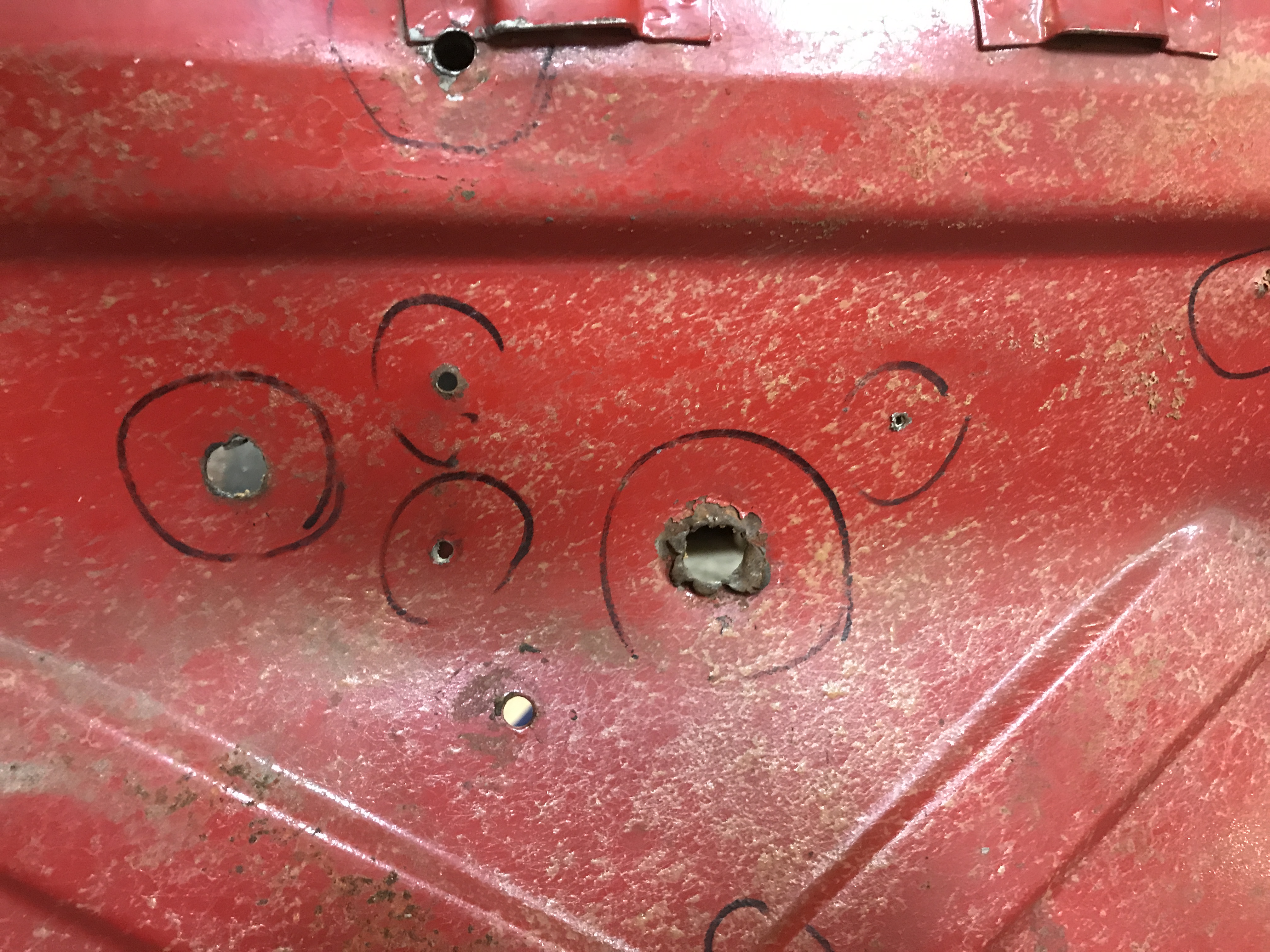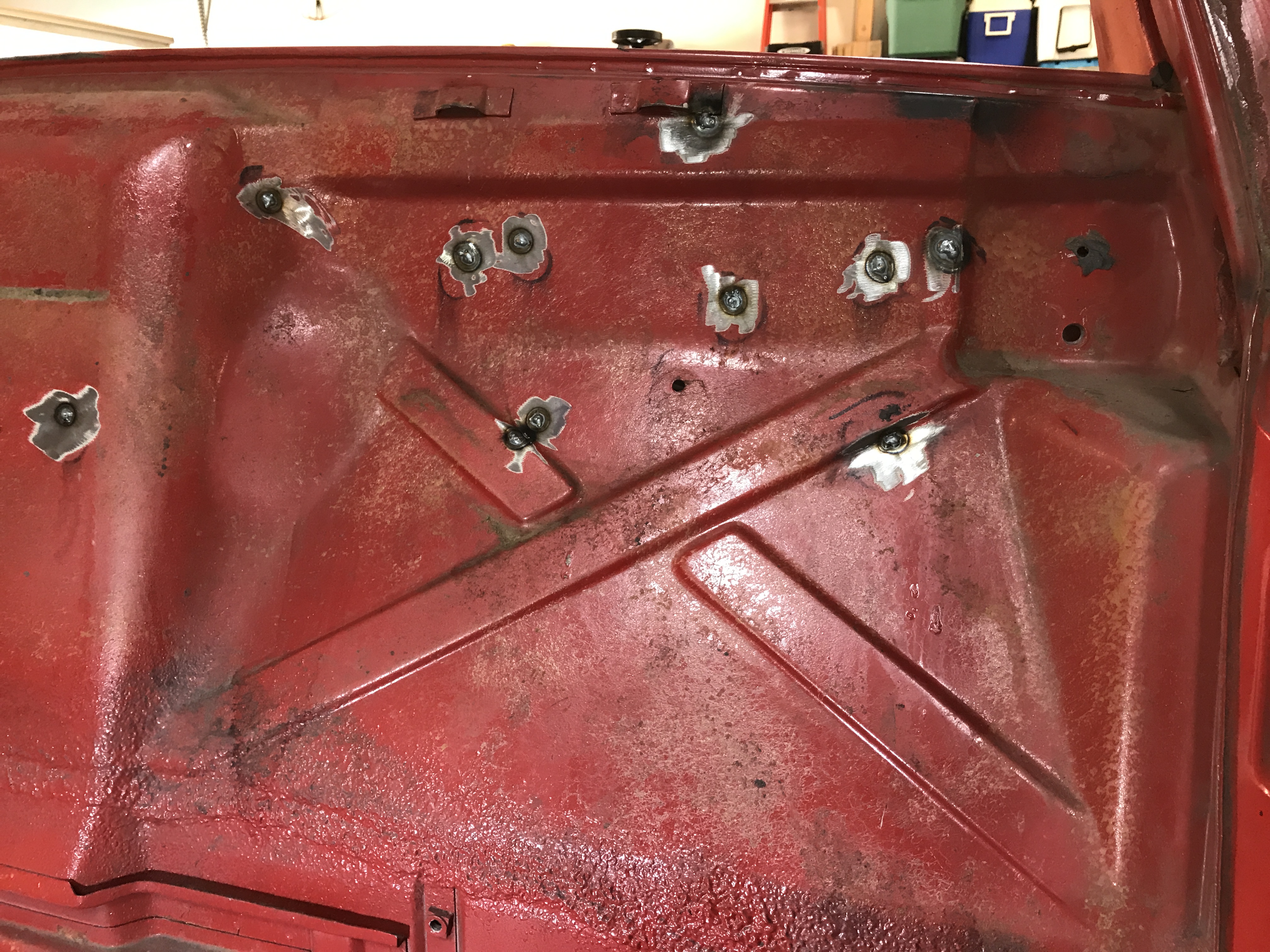 After straightening the sheet metal at some holes, I got the grinder with the paint stripping disk busy.