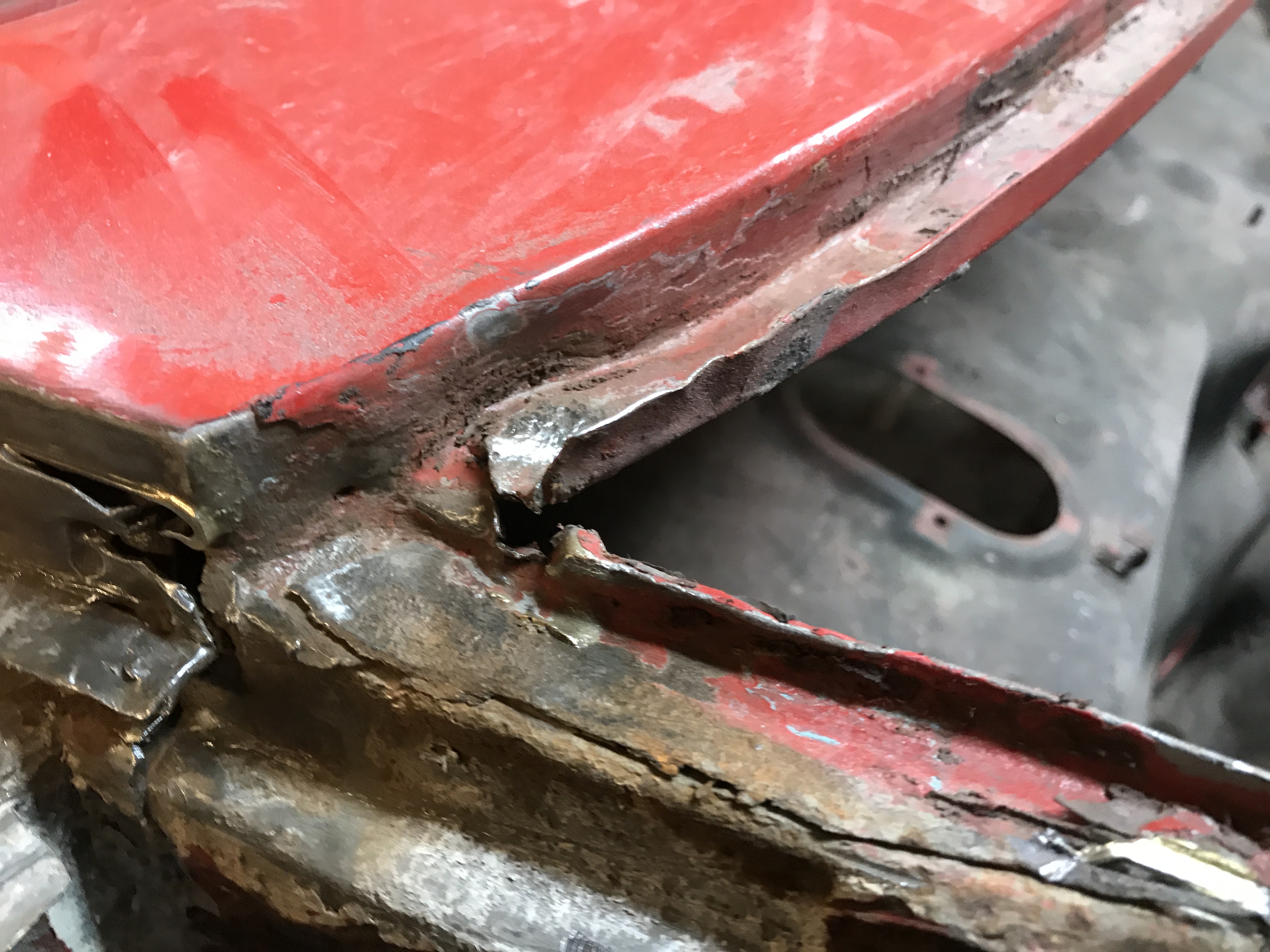 Looking ahead to the next job: repairing the sides of the cowl panel where it meets the tops of the front fenders. The front trunk lid opened too far, probably many times, and made contact with the cowl weatherstrip channel. This deformed the channel and tore the corner joint.