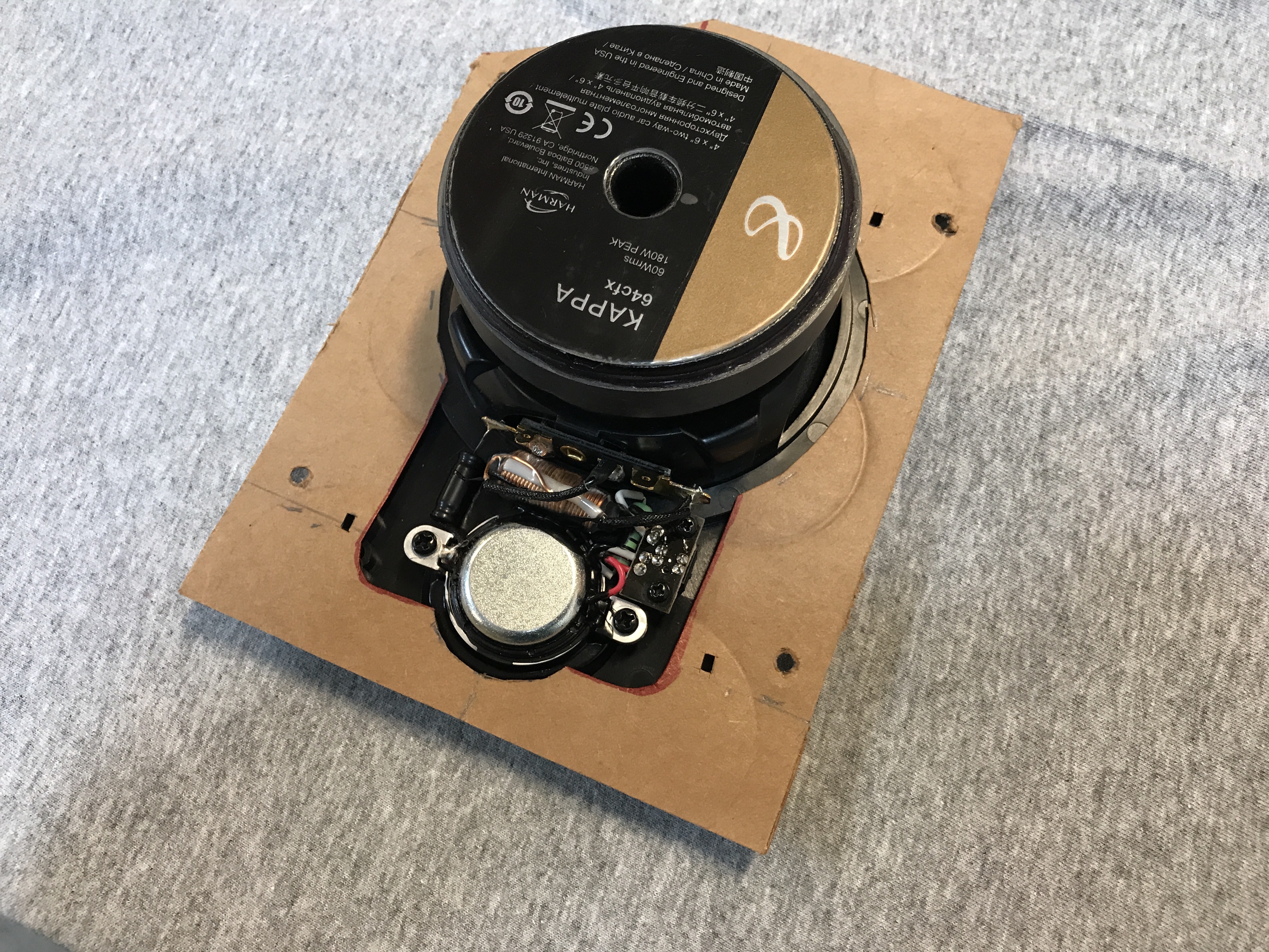 Here is my first version: the mounting board sits between the grill and the speaker.