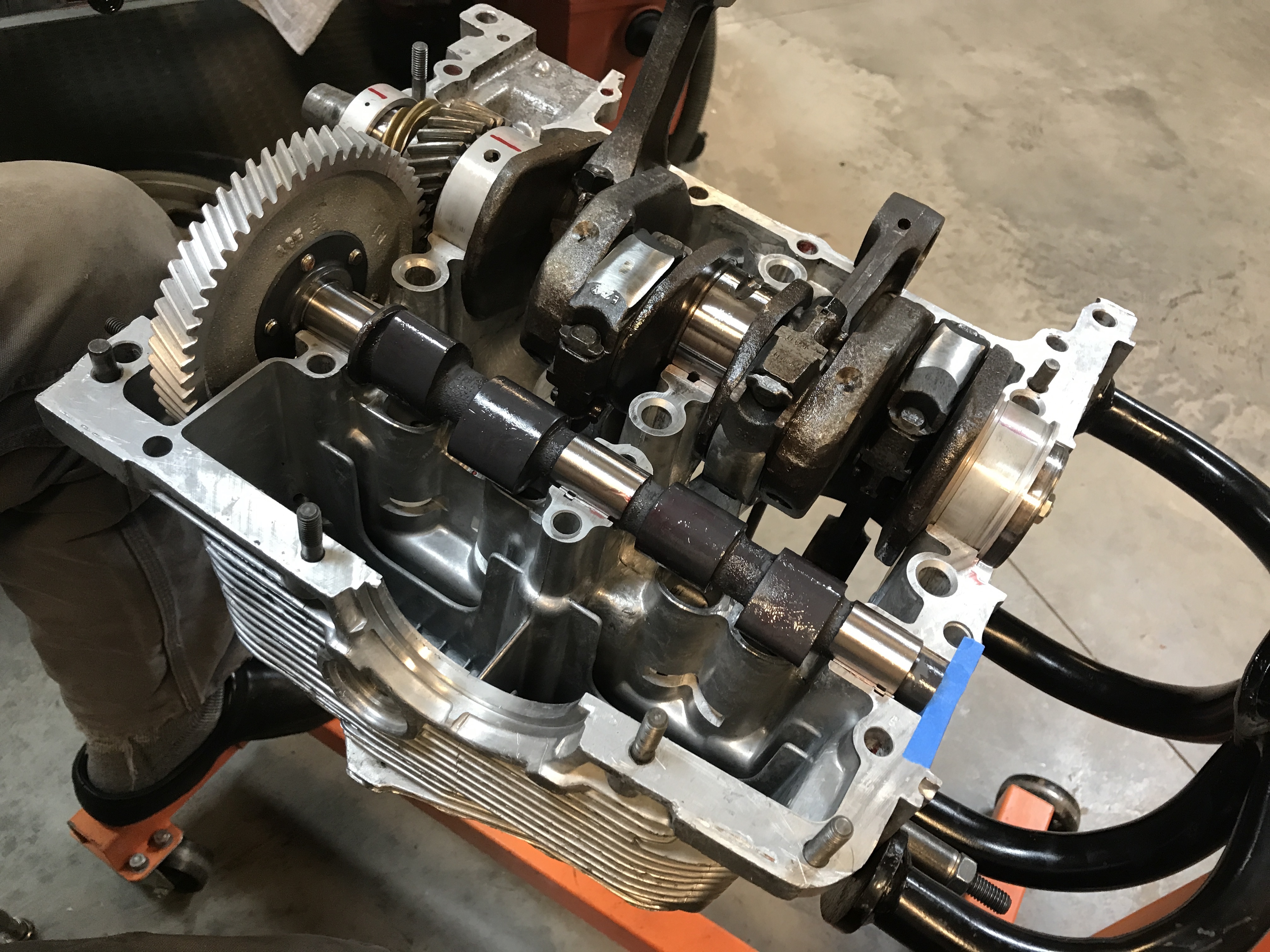 Cam bearings and shaft installed in the right half. The blue tape is a reminder to install the cam plug when I put the case halves together.