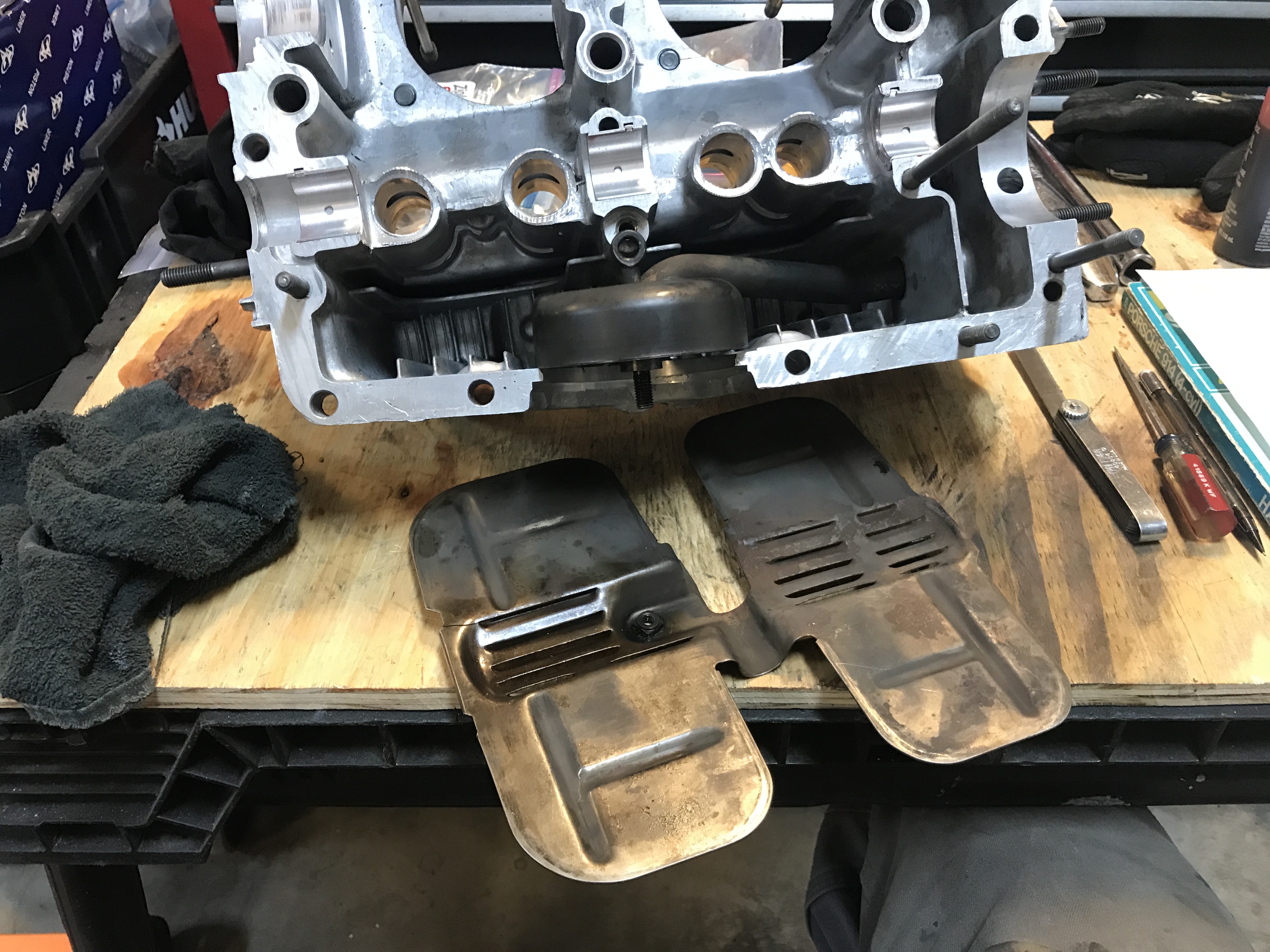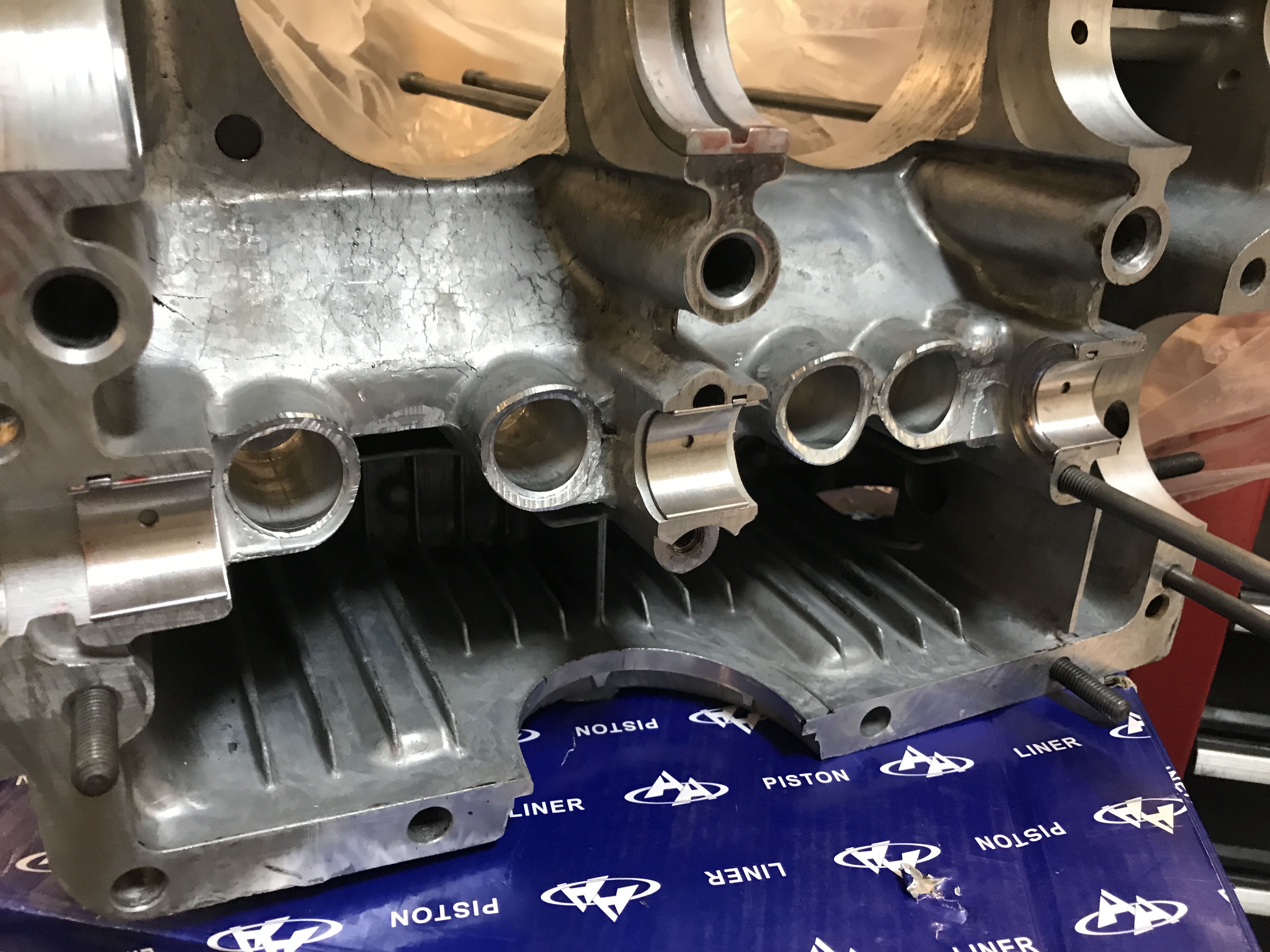 Getting the left half ready. Here are the cam bearings installed.