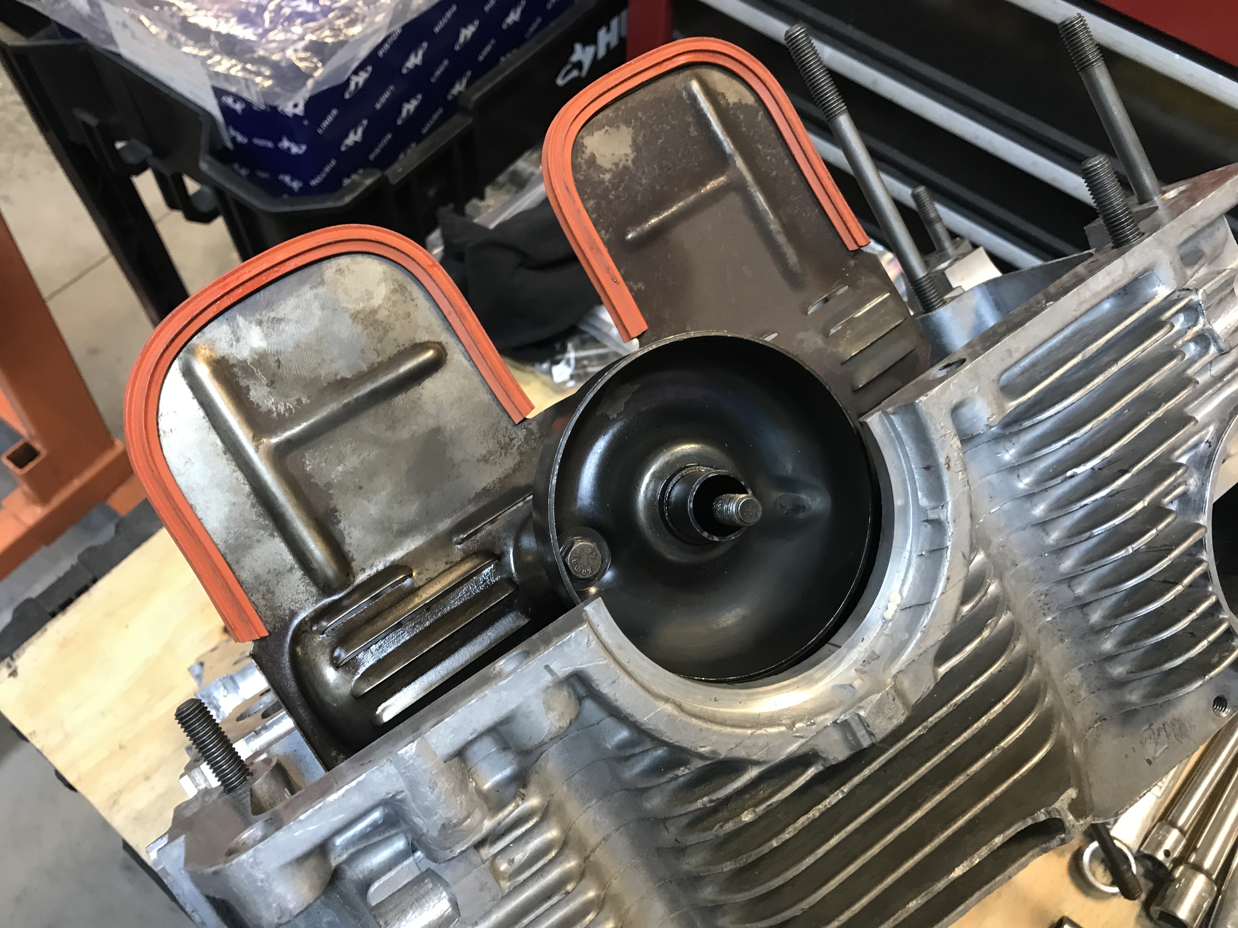 Right case half with a thin smear of sealant, ready for the through-bolts (also with a bit of sealant this time).