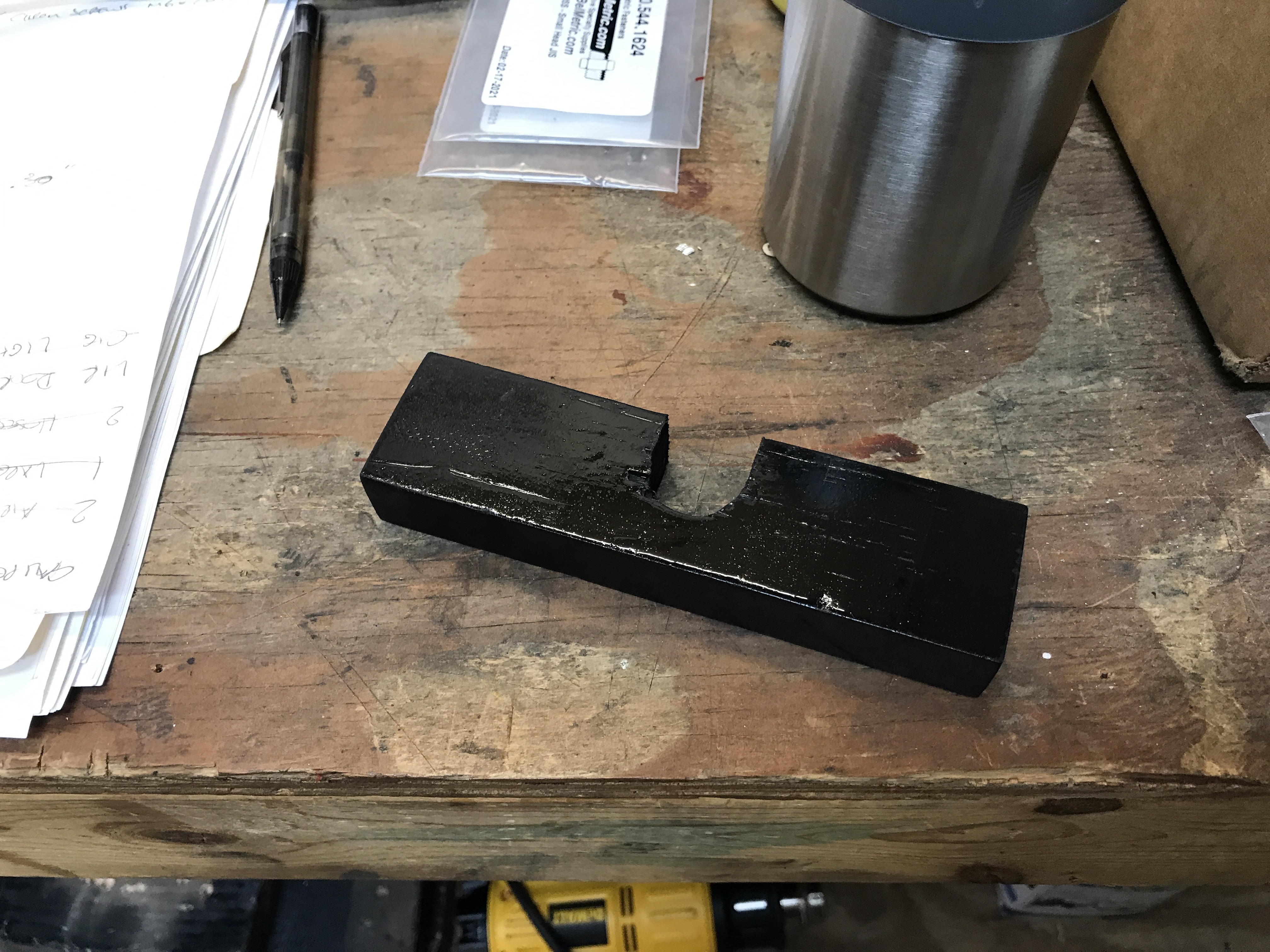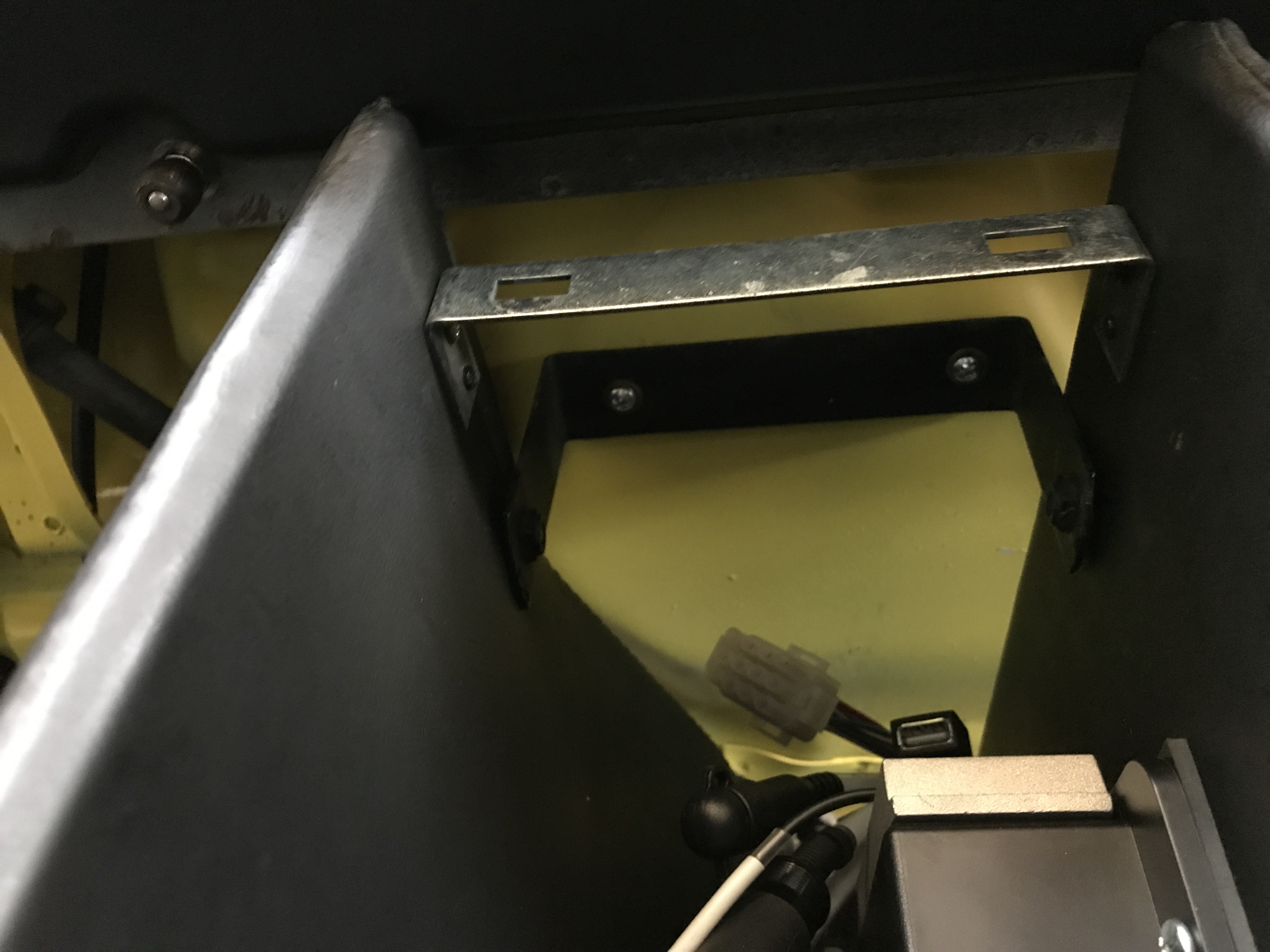 The control box in the arm rest feels a little wobbly, and so I made a brace to support the rear half. This will also keep stuff in the storage area from rolling forward under the control (and falling out of the hole I cut in the bottom). The quick "satin" paint job turned out too shiny. I need to find a scrap of black vinyl.