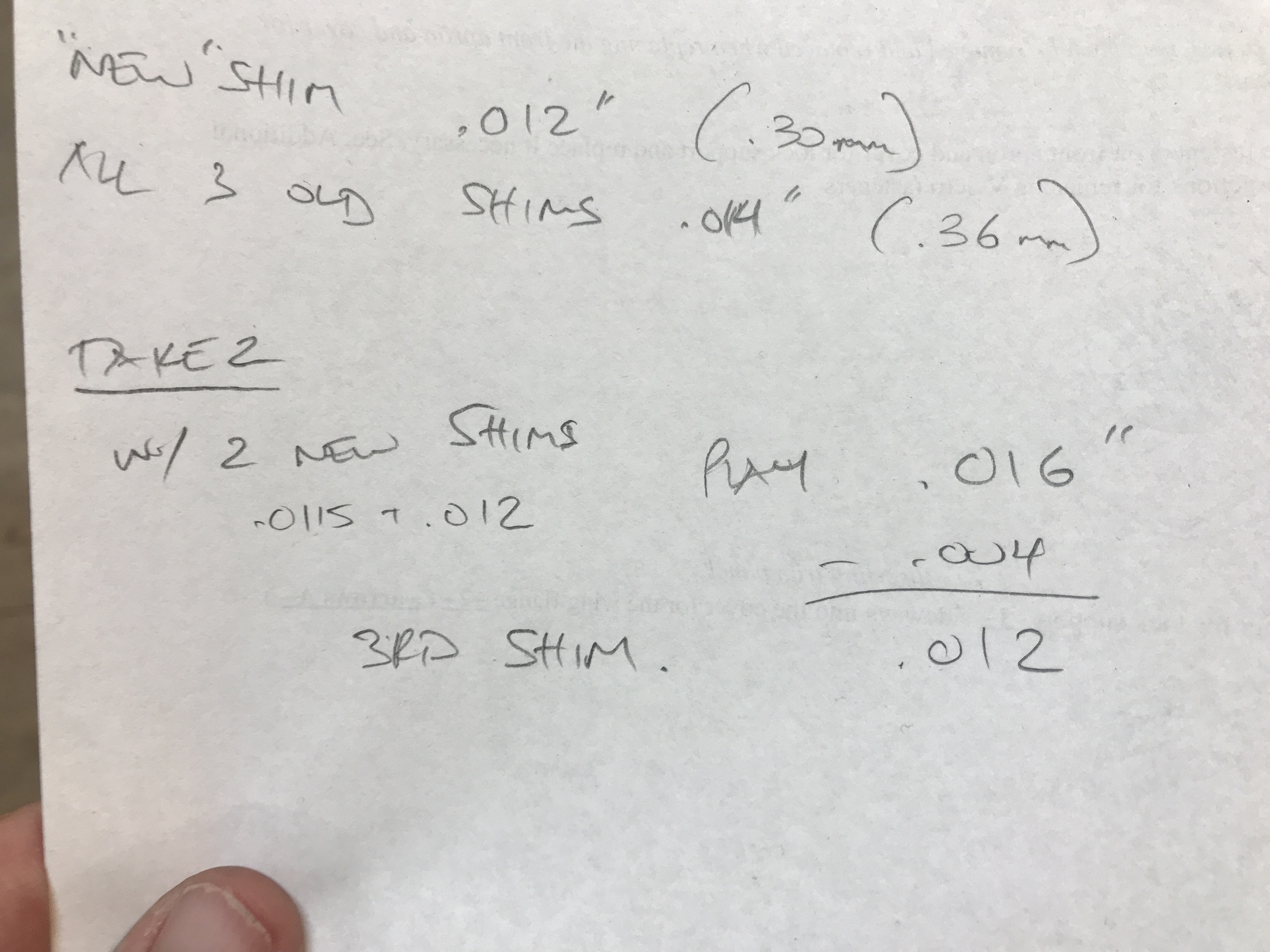 So I switched to the two new shims I have, that are the thinnest in my collection. I measured .016" of play, so I need a .012" shim.