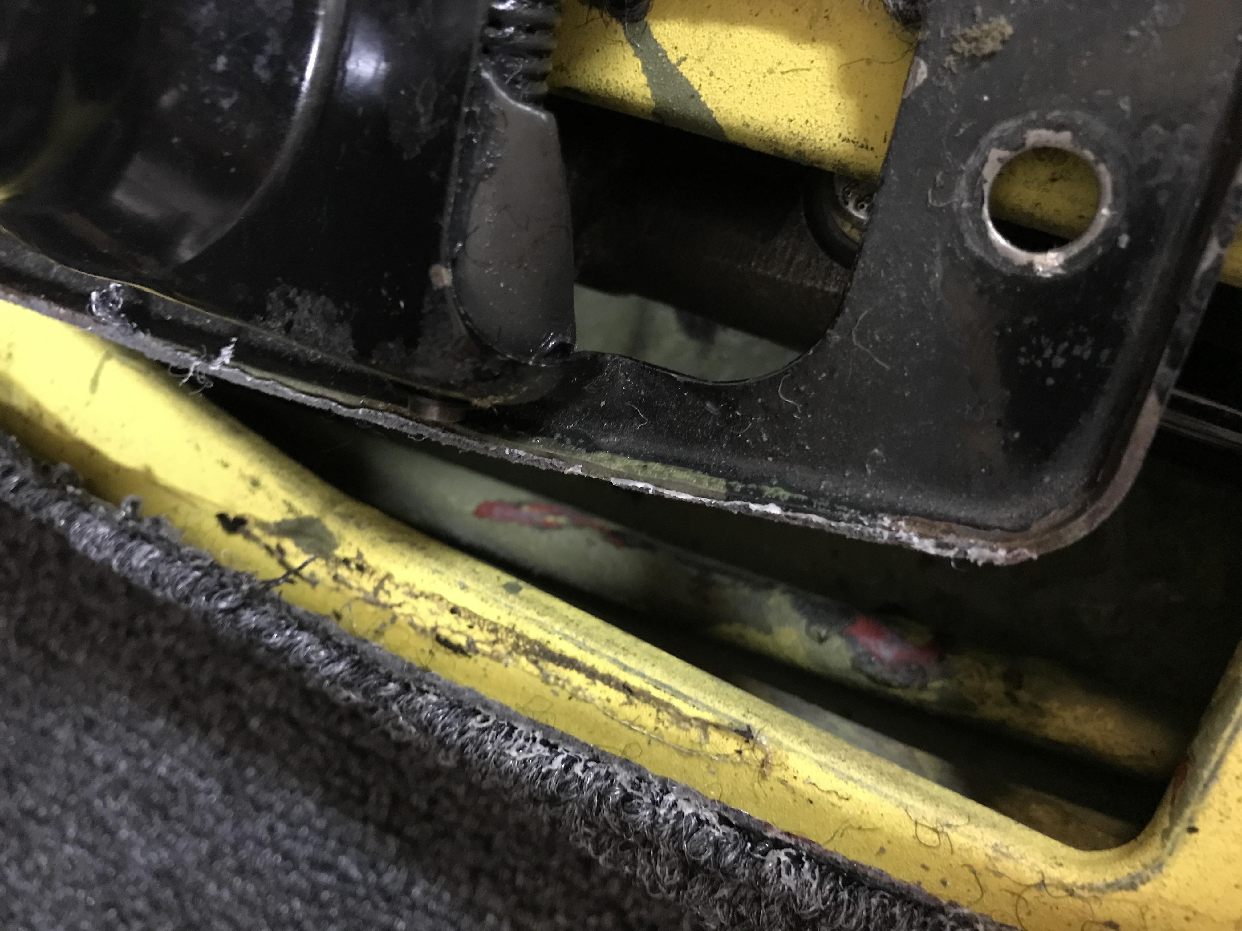 I had a slight detour in setting up the audio system and center console. After I screwed the rear console bracket to the top of the tunnel, I ran my bore scope inside to make sure the screw tip was not too close to anything else. That led me to discover that the heater lever light wire was fouling on the shift tube. For better access, I removed the console and then the gear shift lever. That led me to discover that the bottom of the shift assembly was making contact with the clutch tube when the lever was full to the right. You can see where the yellow has worn away, revealing the original red paint.
