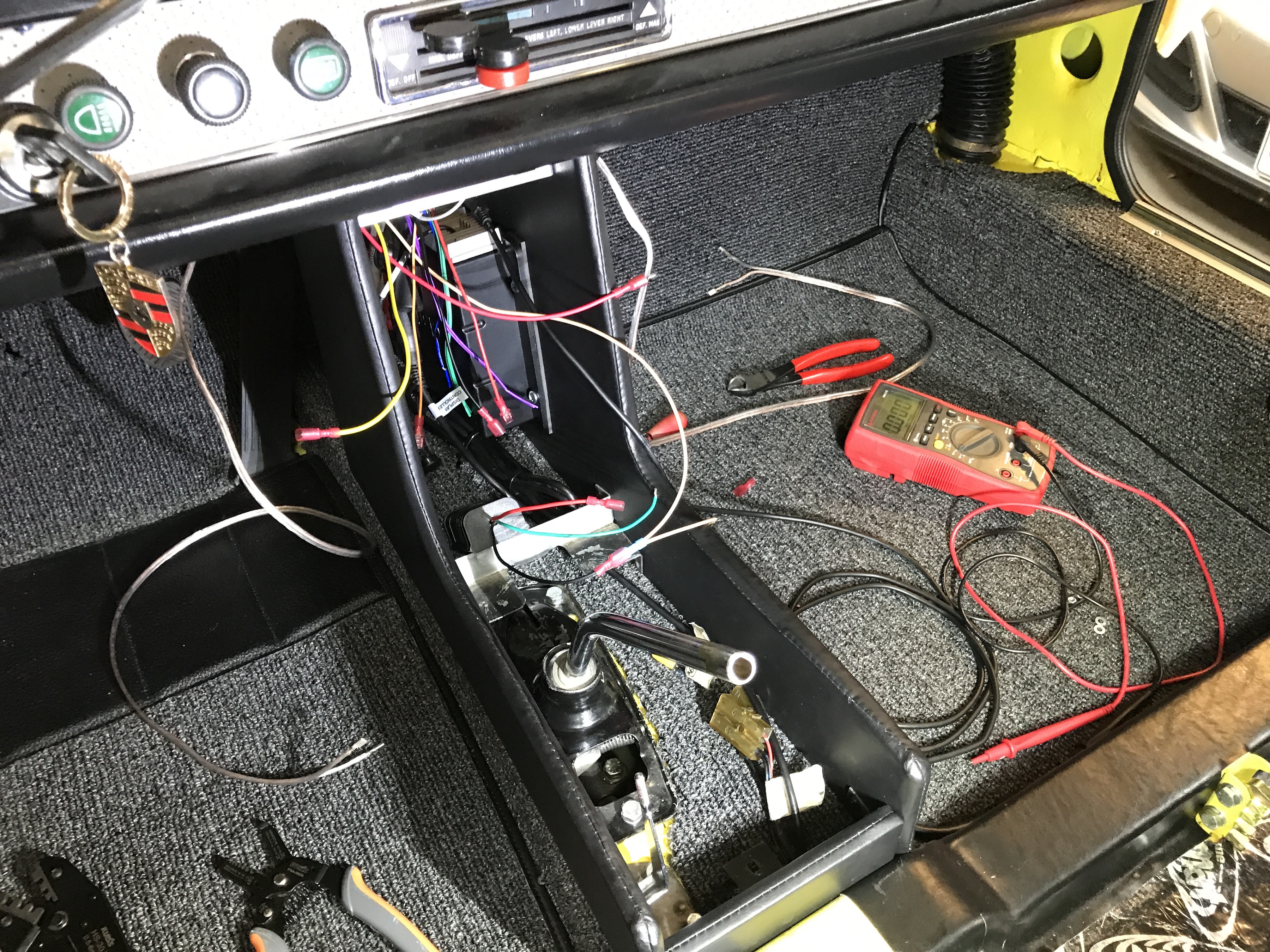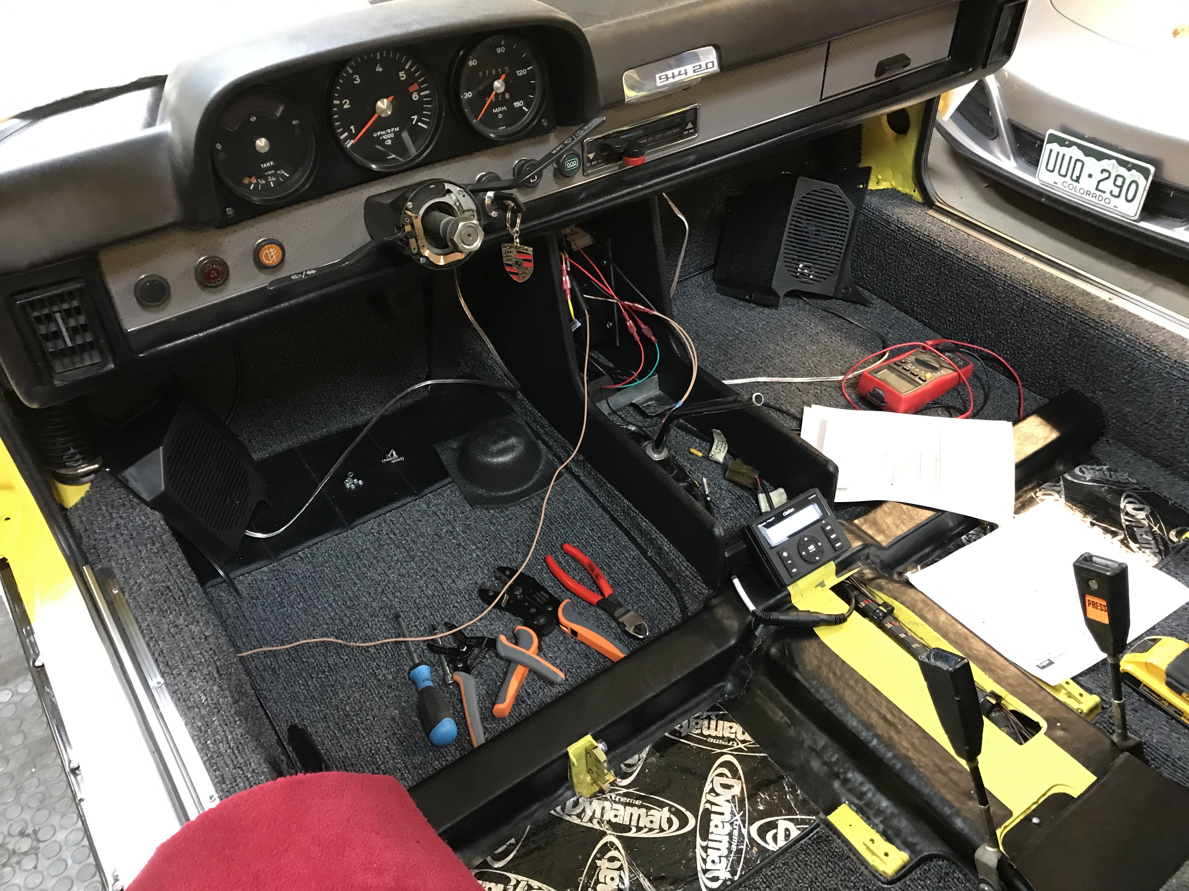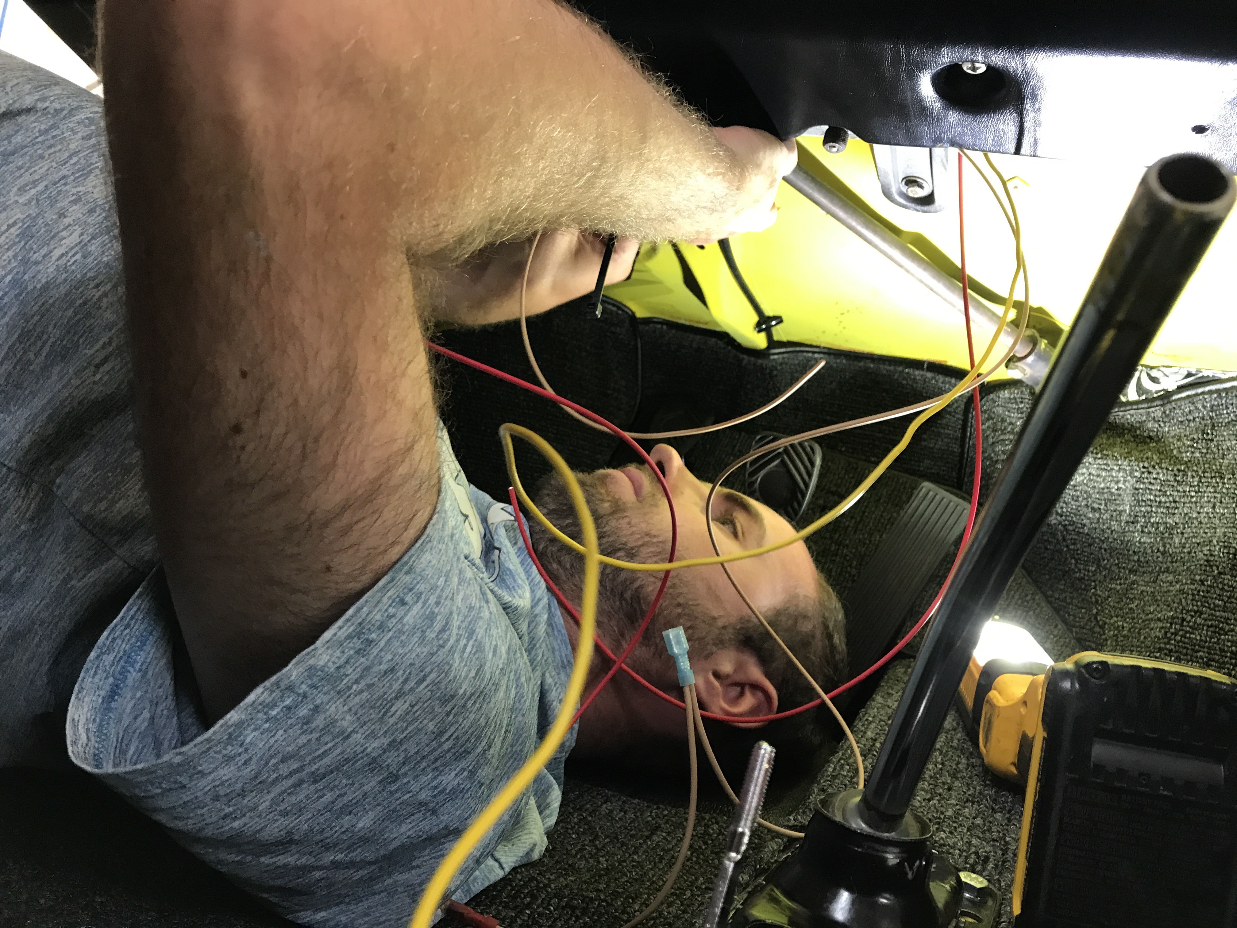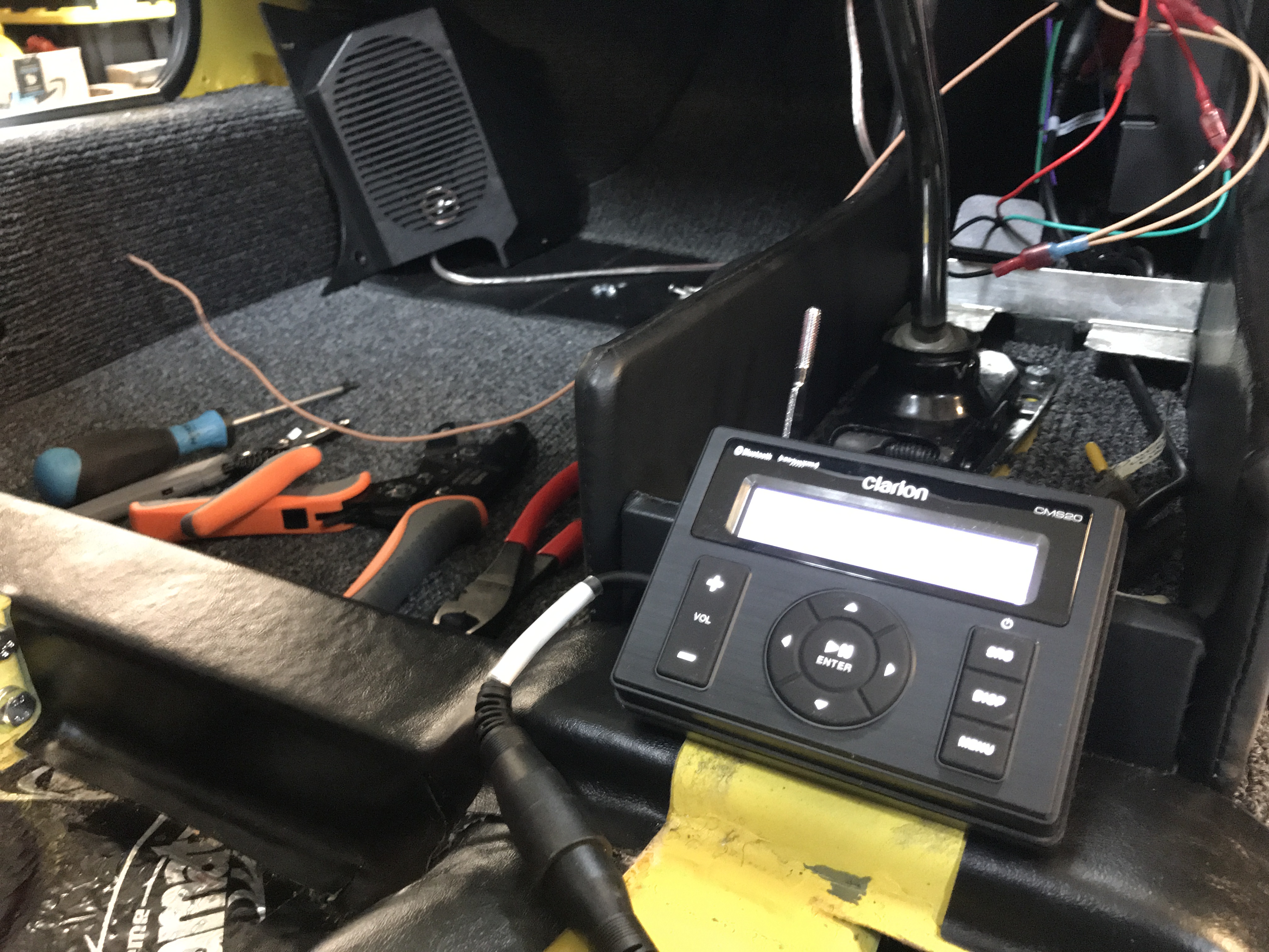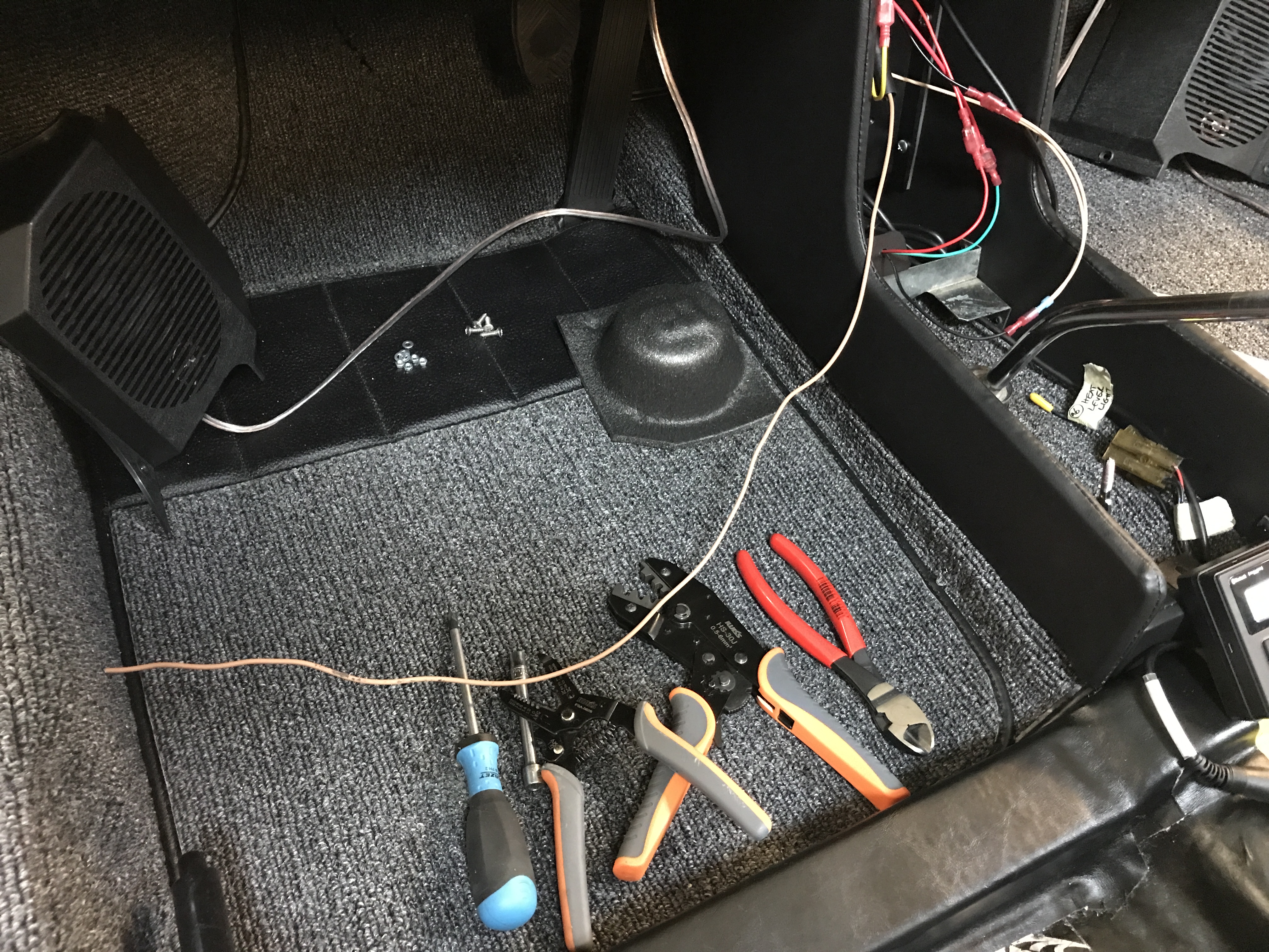 Big day for the audio system. We got all the wires connected, including the speakers. The brown wire here is the temporary antenna.