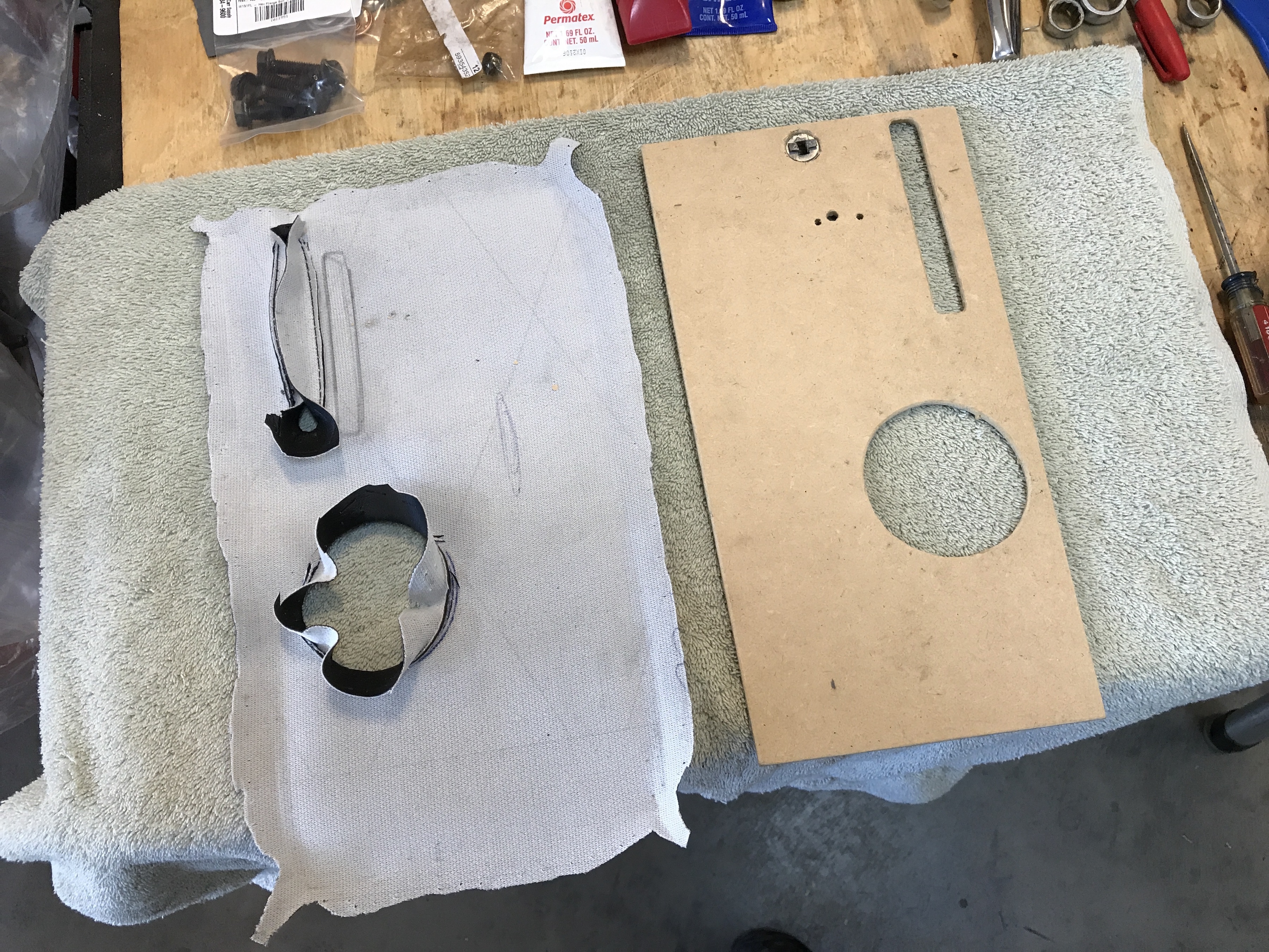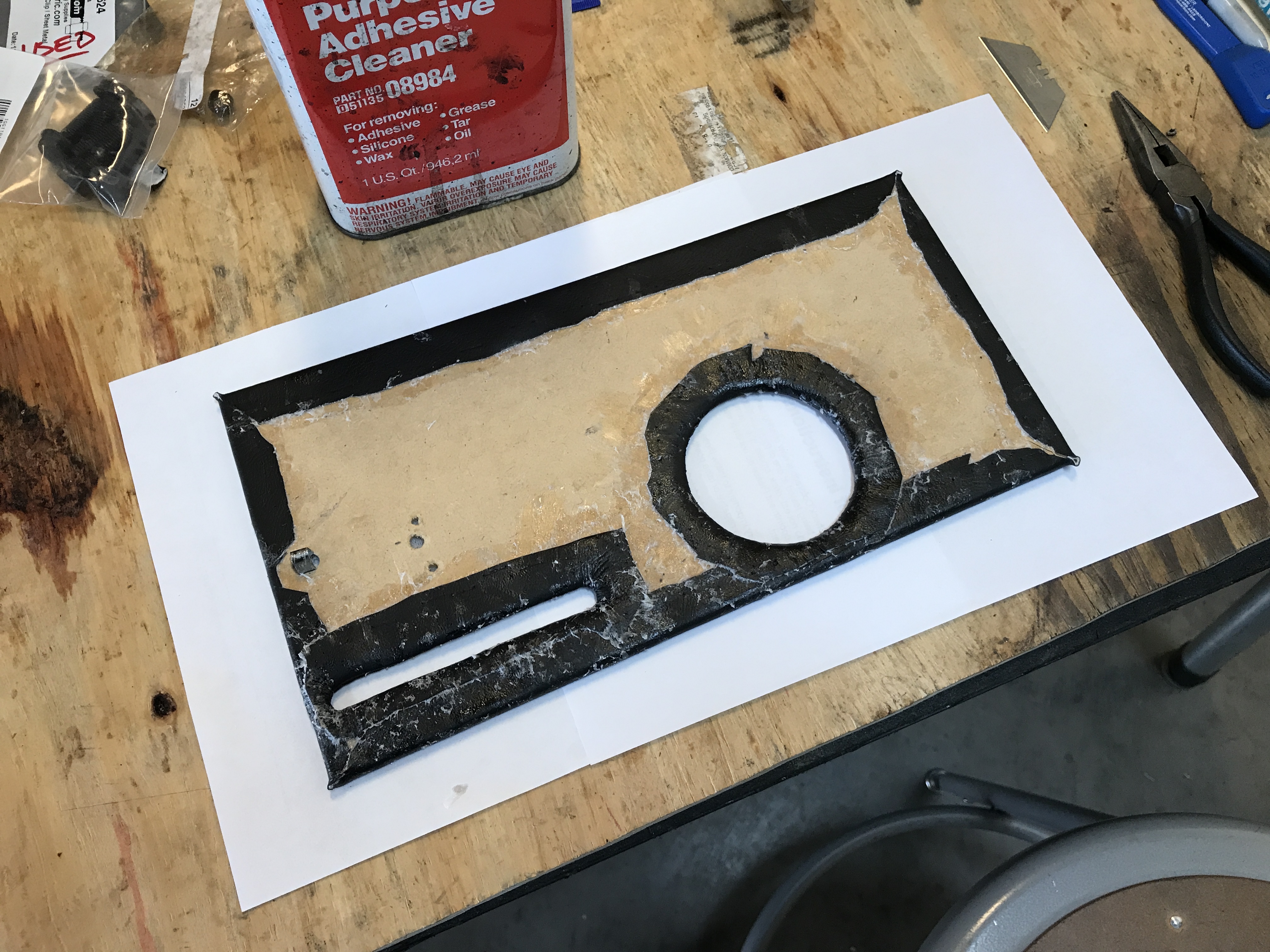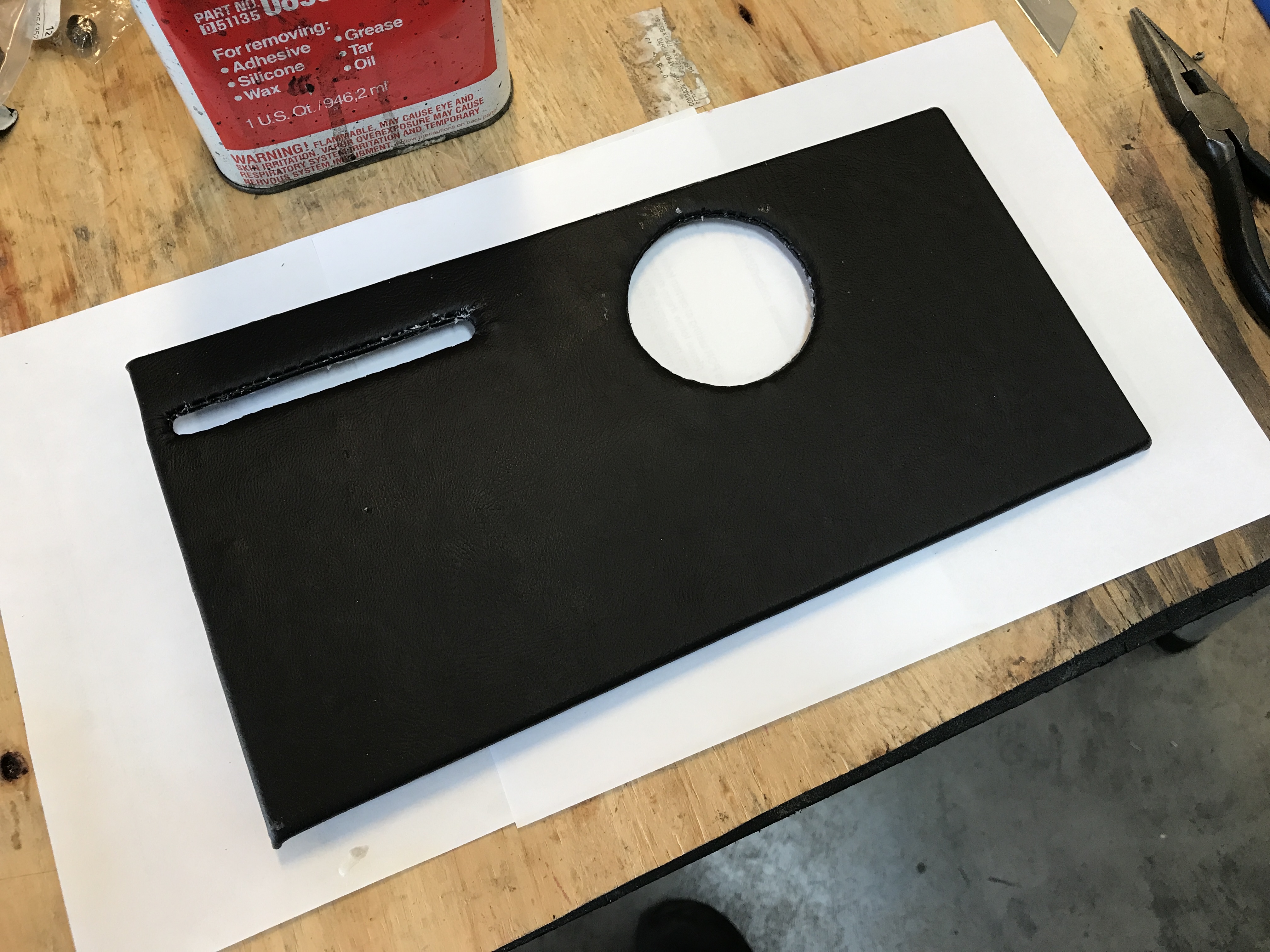 And then I worked on the replacement console panel. I took the custom cover that had been mounted on the original (cracked) panel. Staples in the MDF did not work well, so I decided to use spray adhesive.