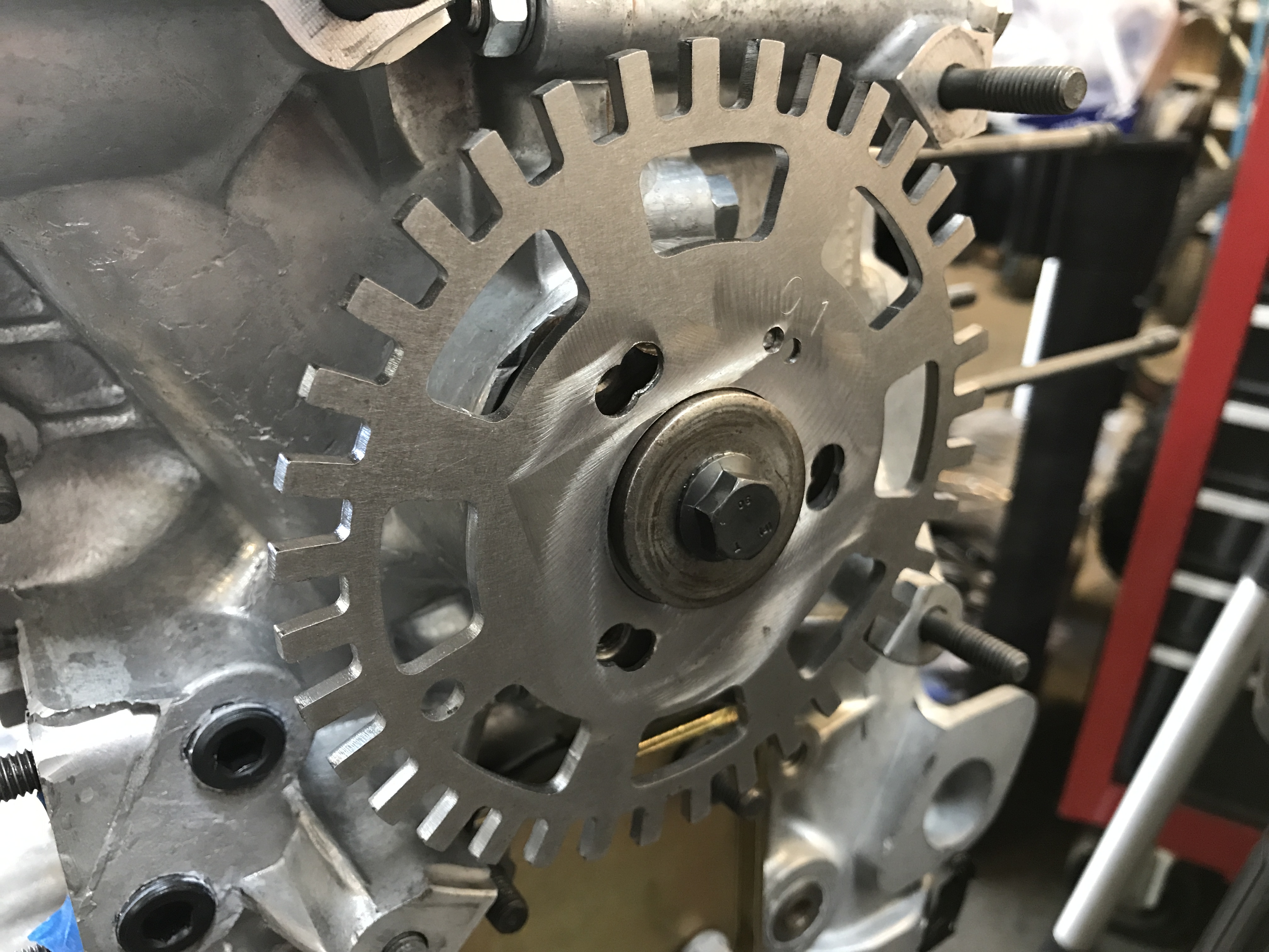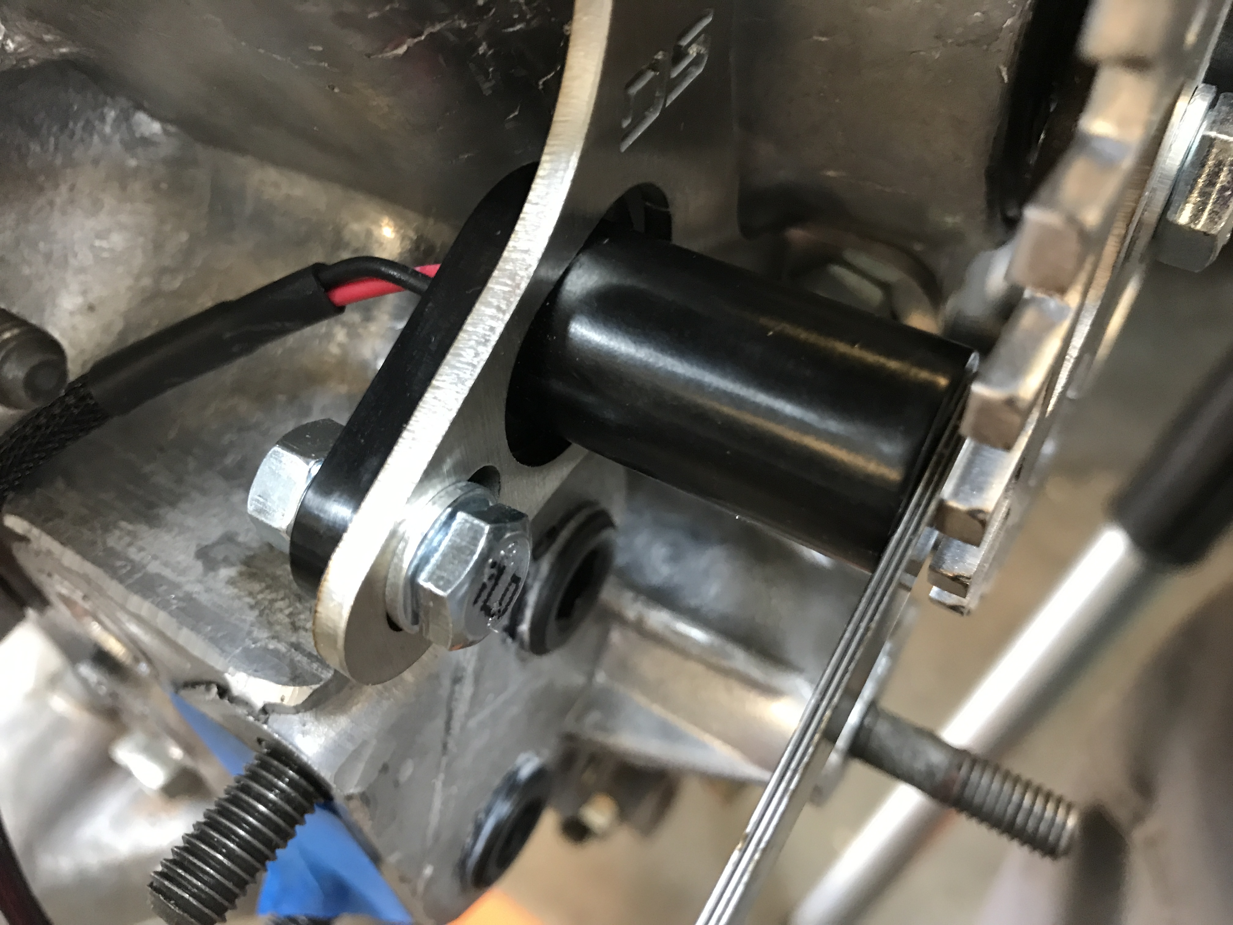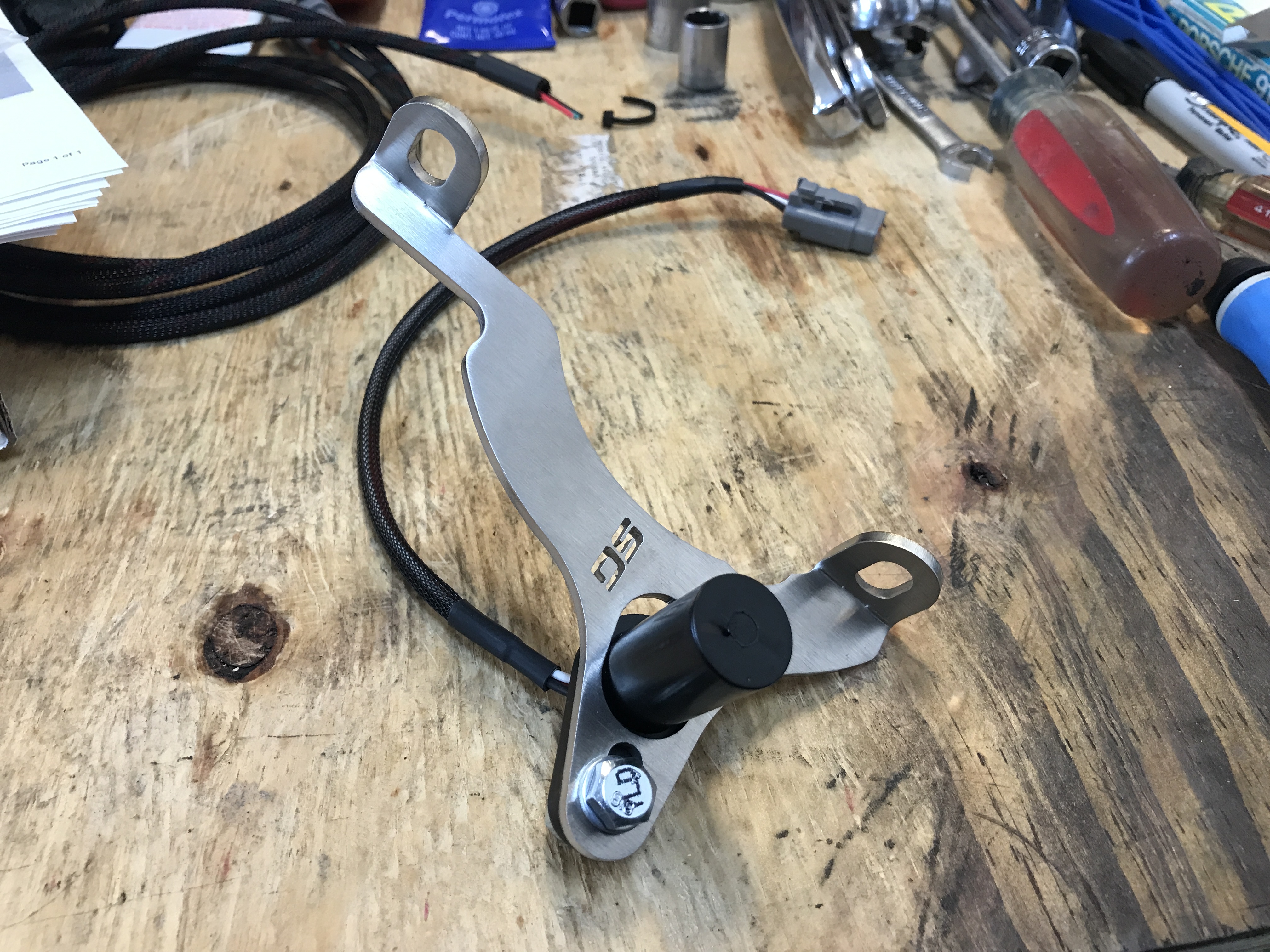 The bracket mounts using two of the case edge bolts. It can slide about 10mm forward and back. The sensor can also adjust closer to the crank axis.