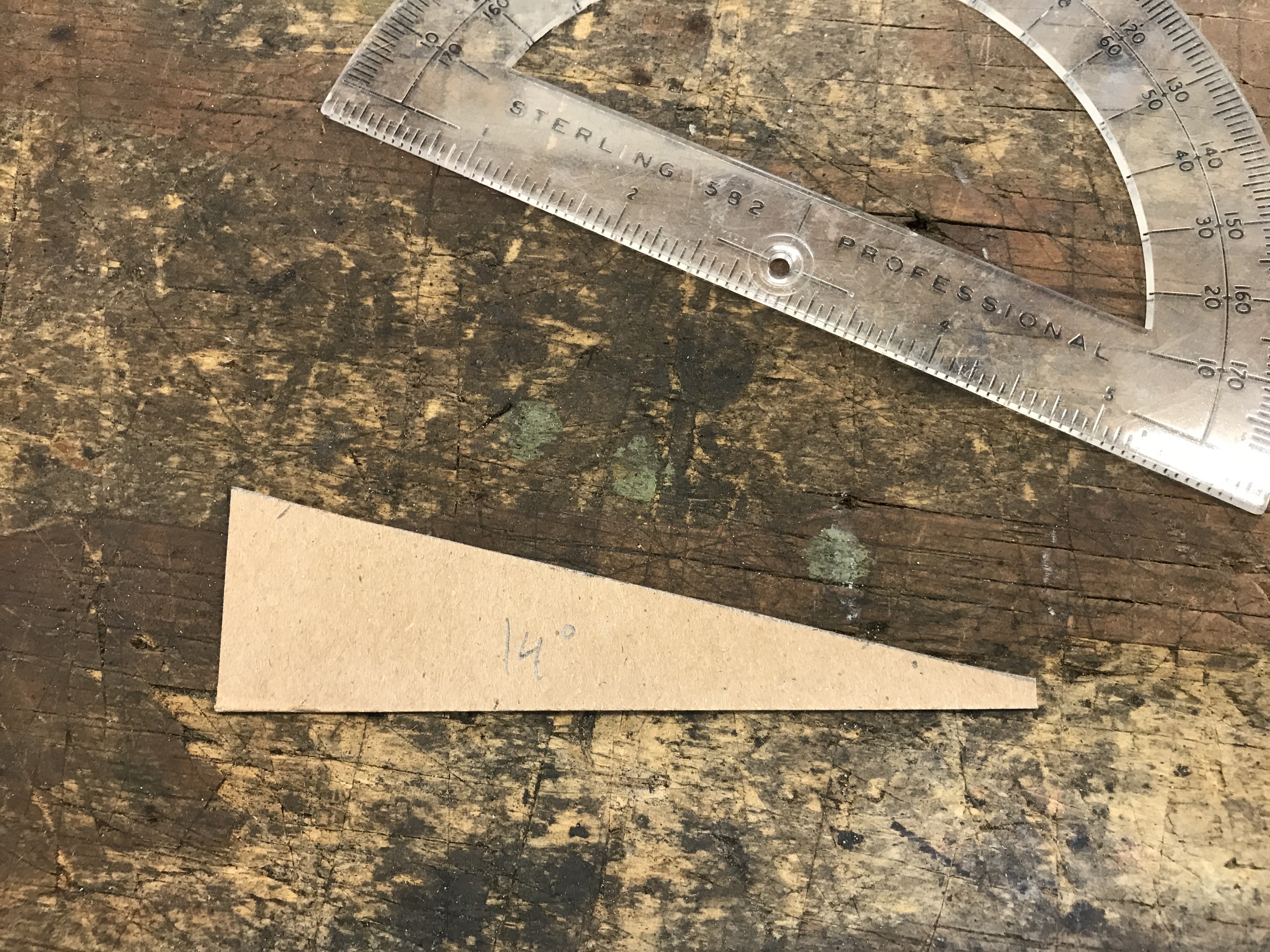 I also made a cardboard template to help with judging alignment. This wedge is 14 degrees, which matches the inclination of the valves relative to the perpendicular of the cylinder head faces.