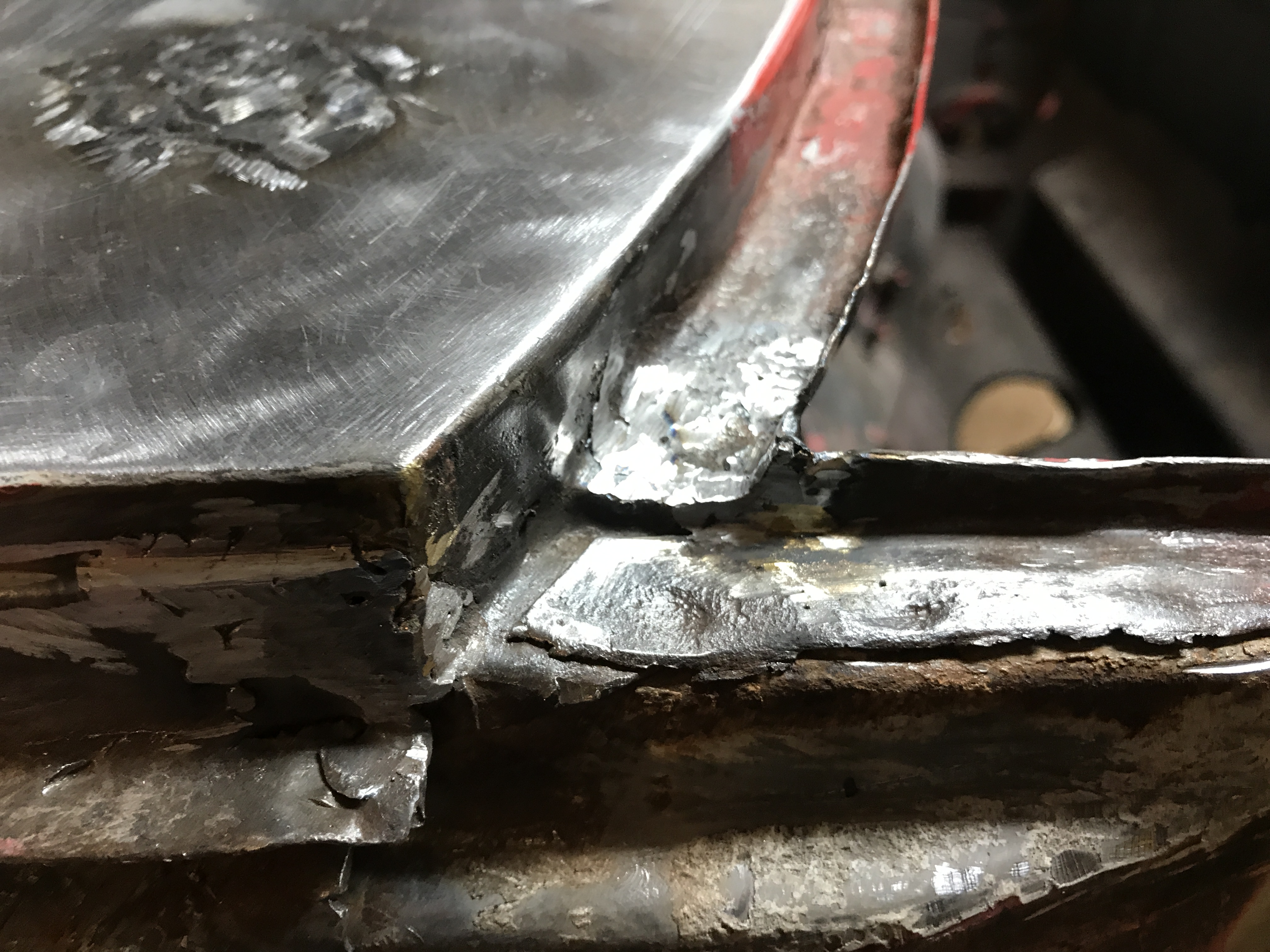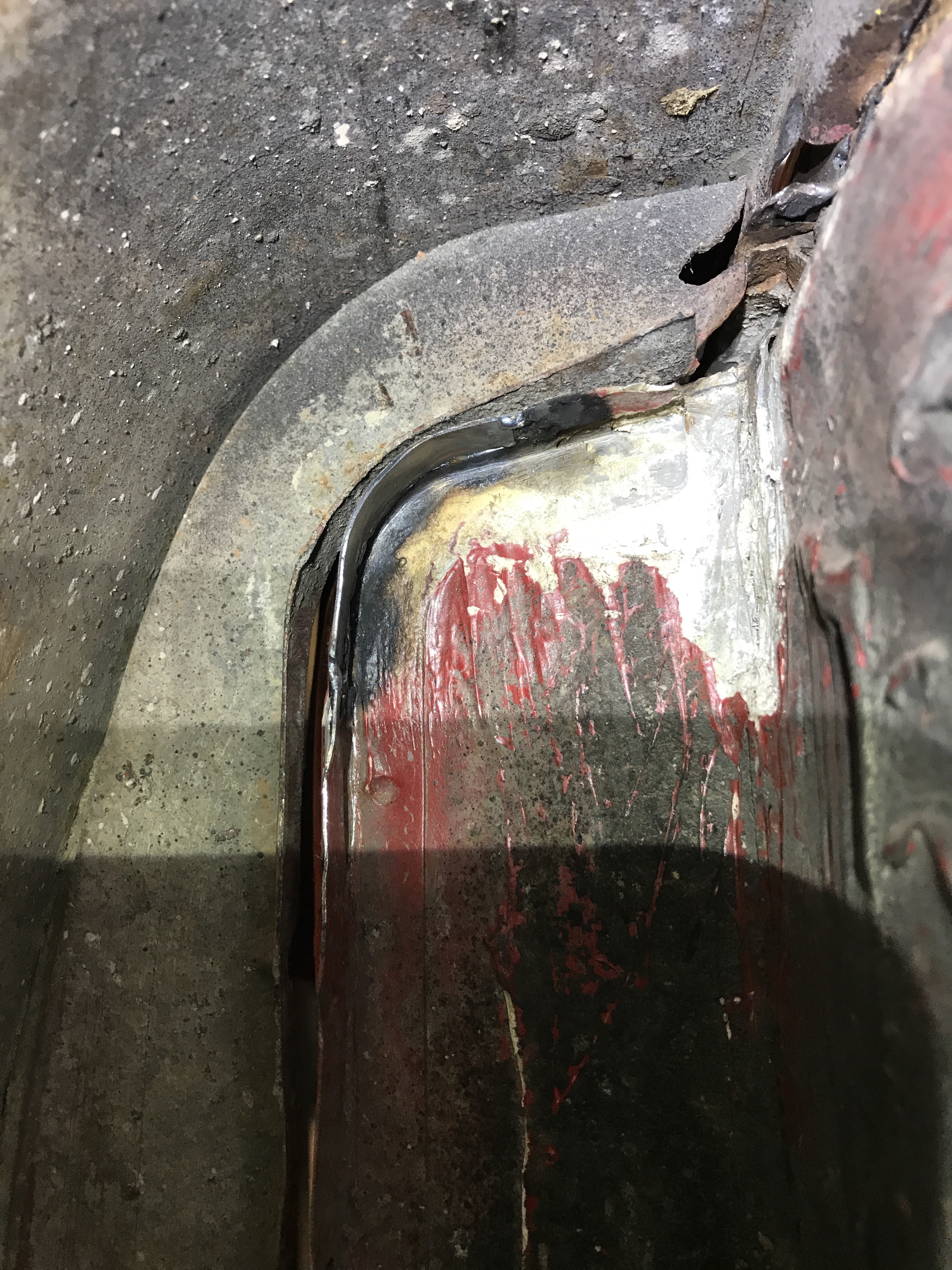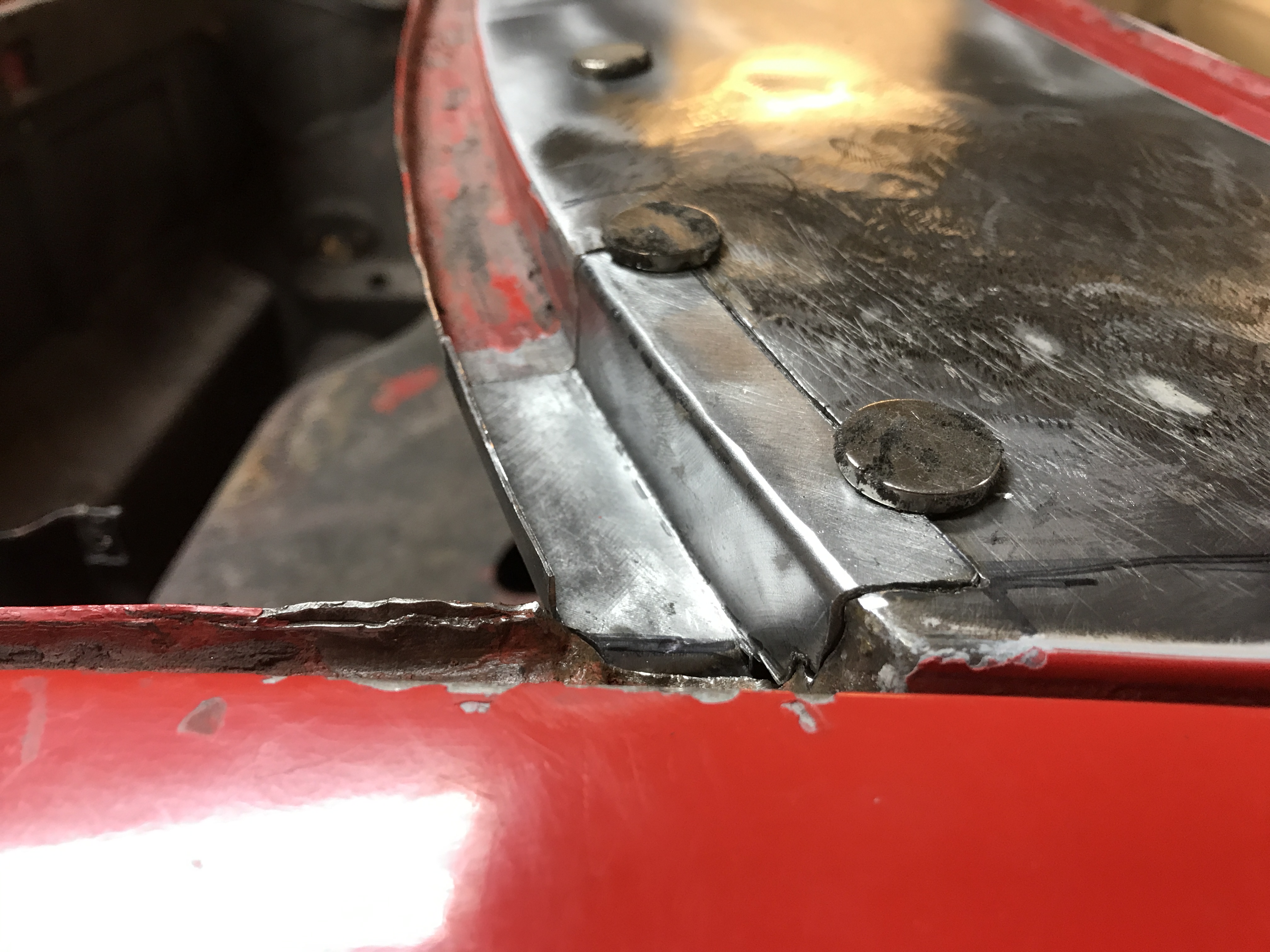Looking inside the fender, where it meets the mounting flange on the A-pillar.