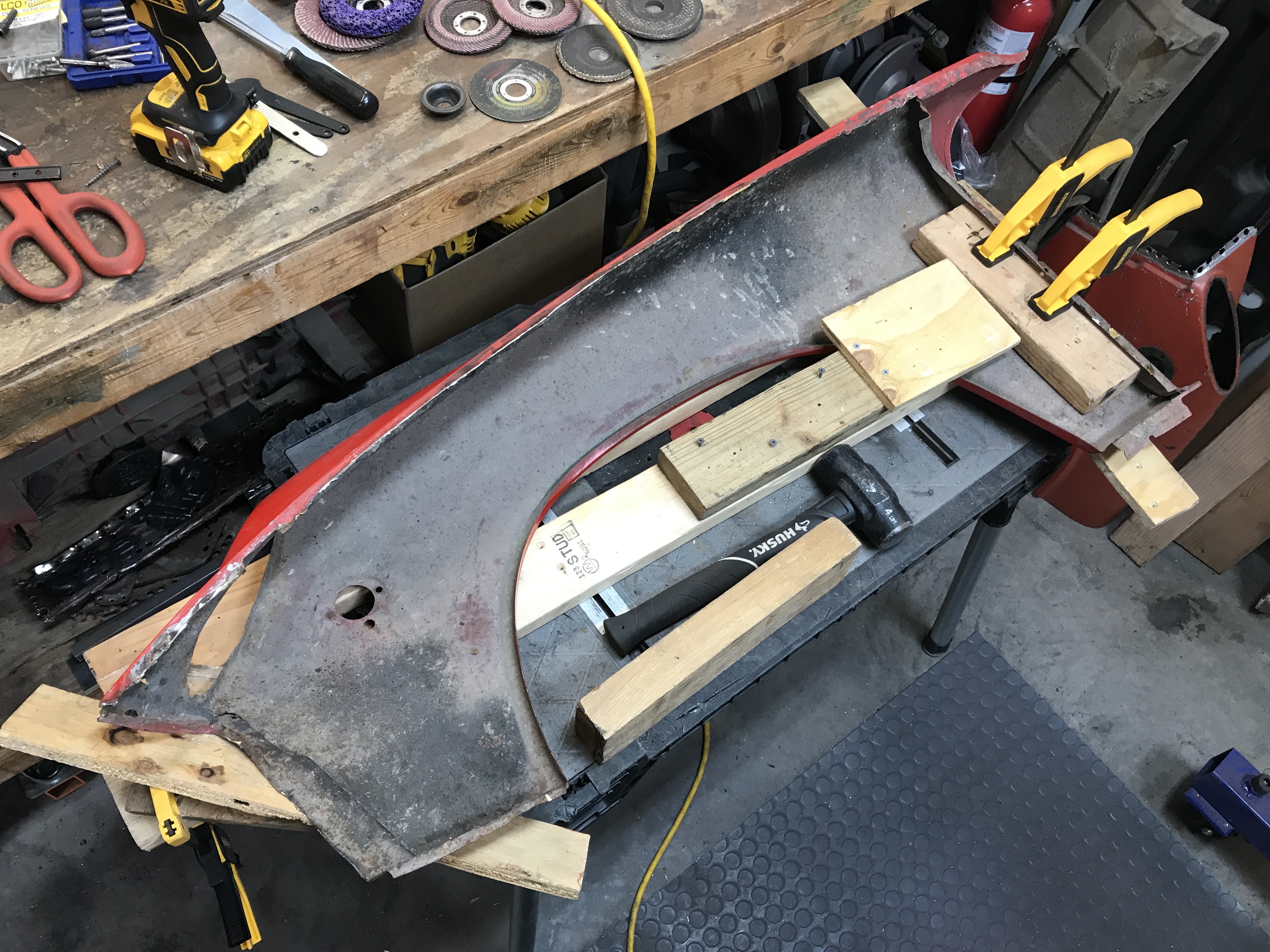 Got to work on the fender today. Here it is in a quick jig to stabilize it while I removed the crumple along the leading edge bumper recess. And my big movement tools (section of 2x4 and 4 lb hammer).
