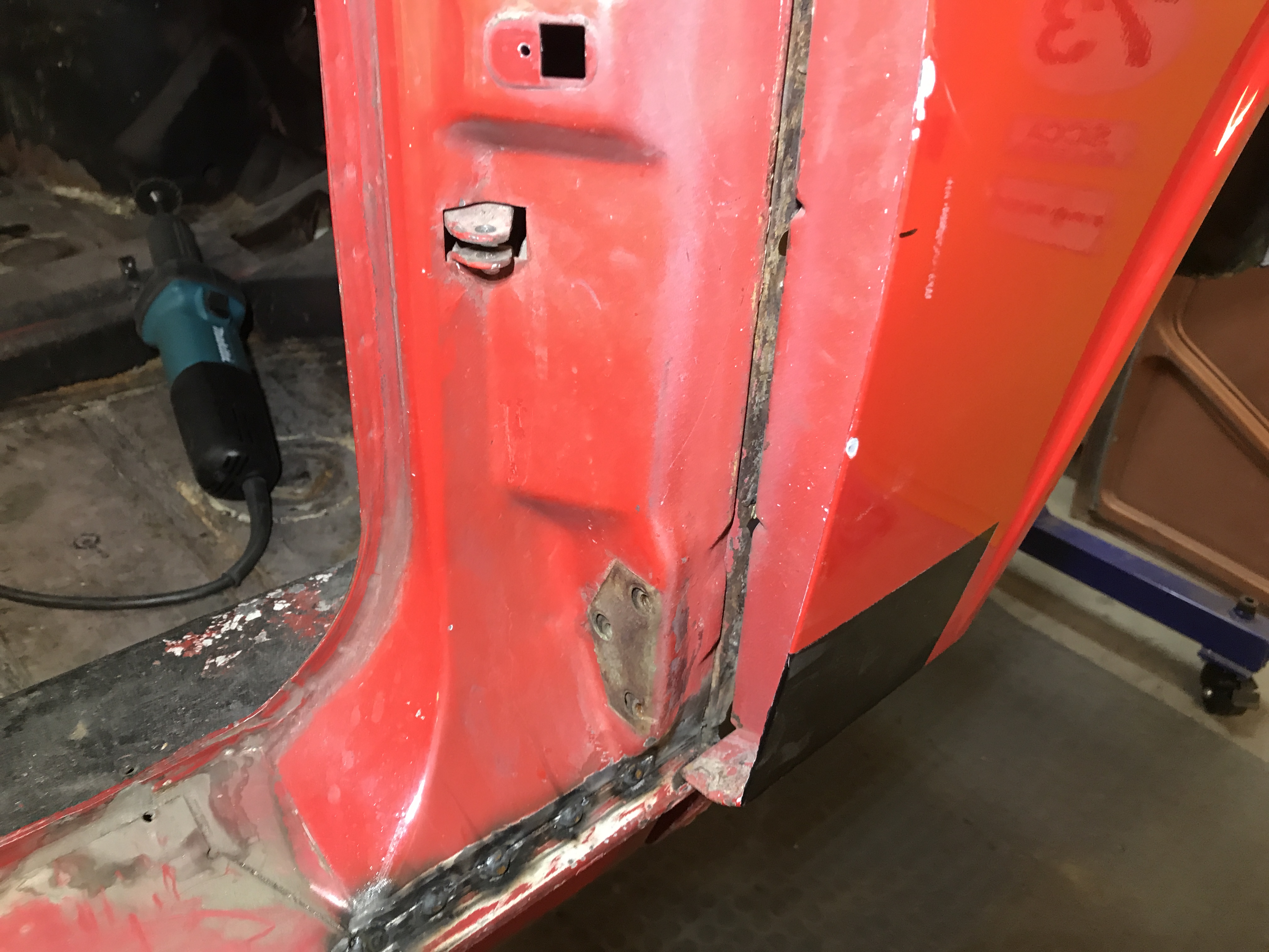 While in the mood, I started on the last big job--reinstalling the right front fender. Here's the mounting flange on the A-pillar after cutting out a segment that was mangled.