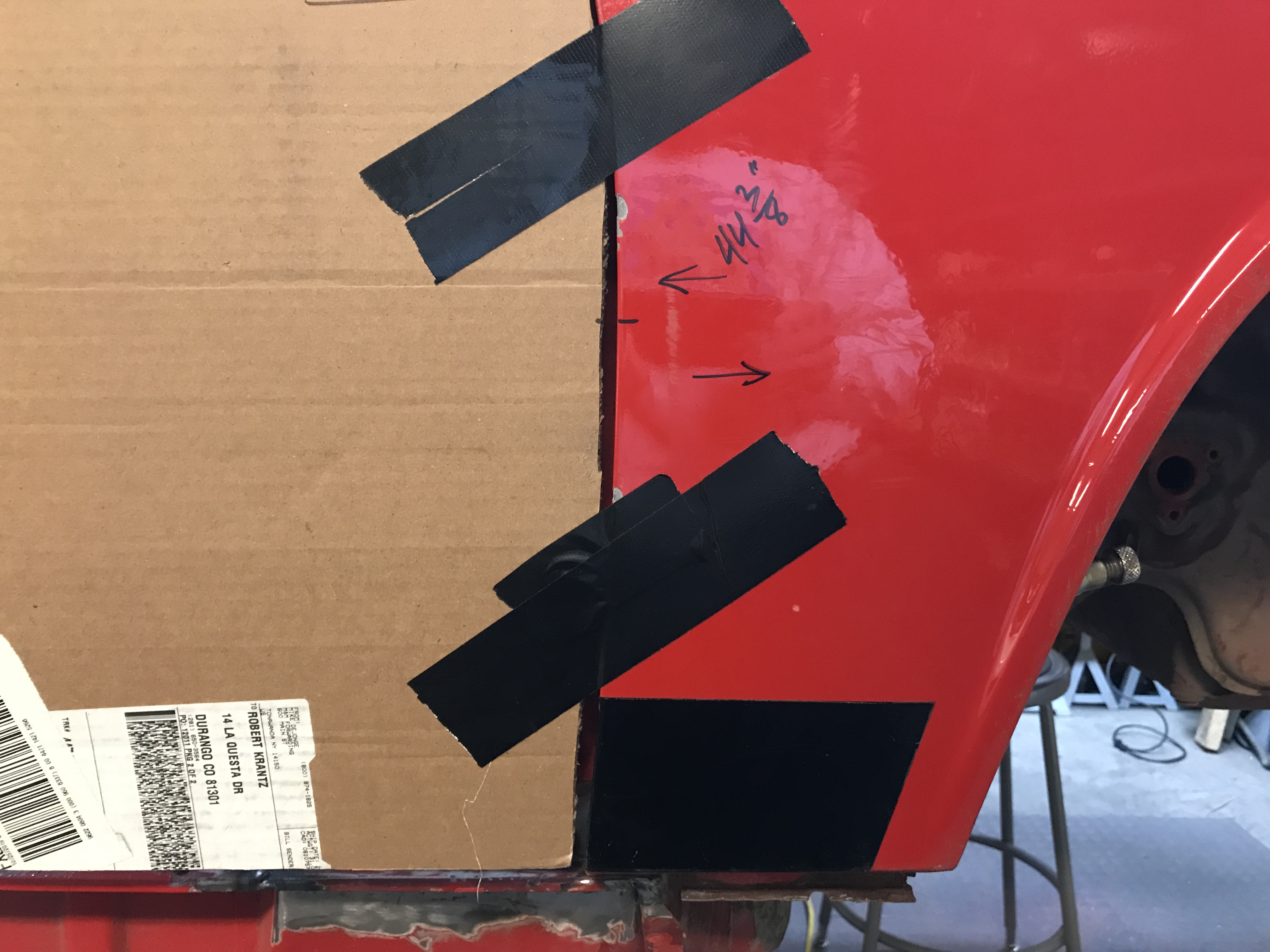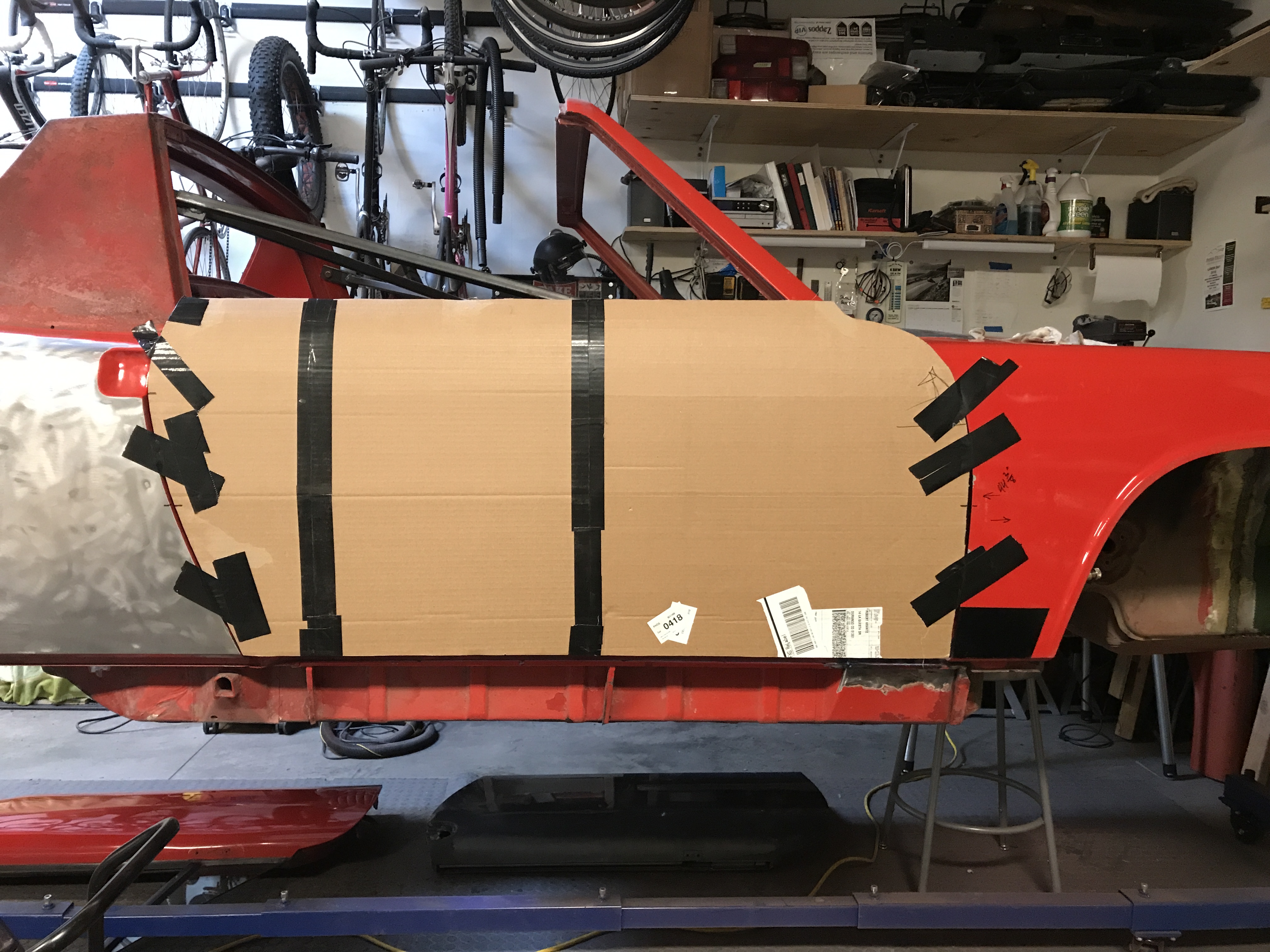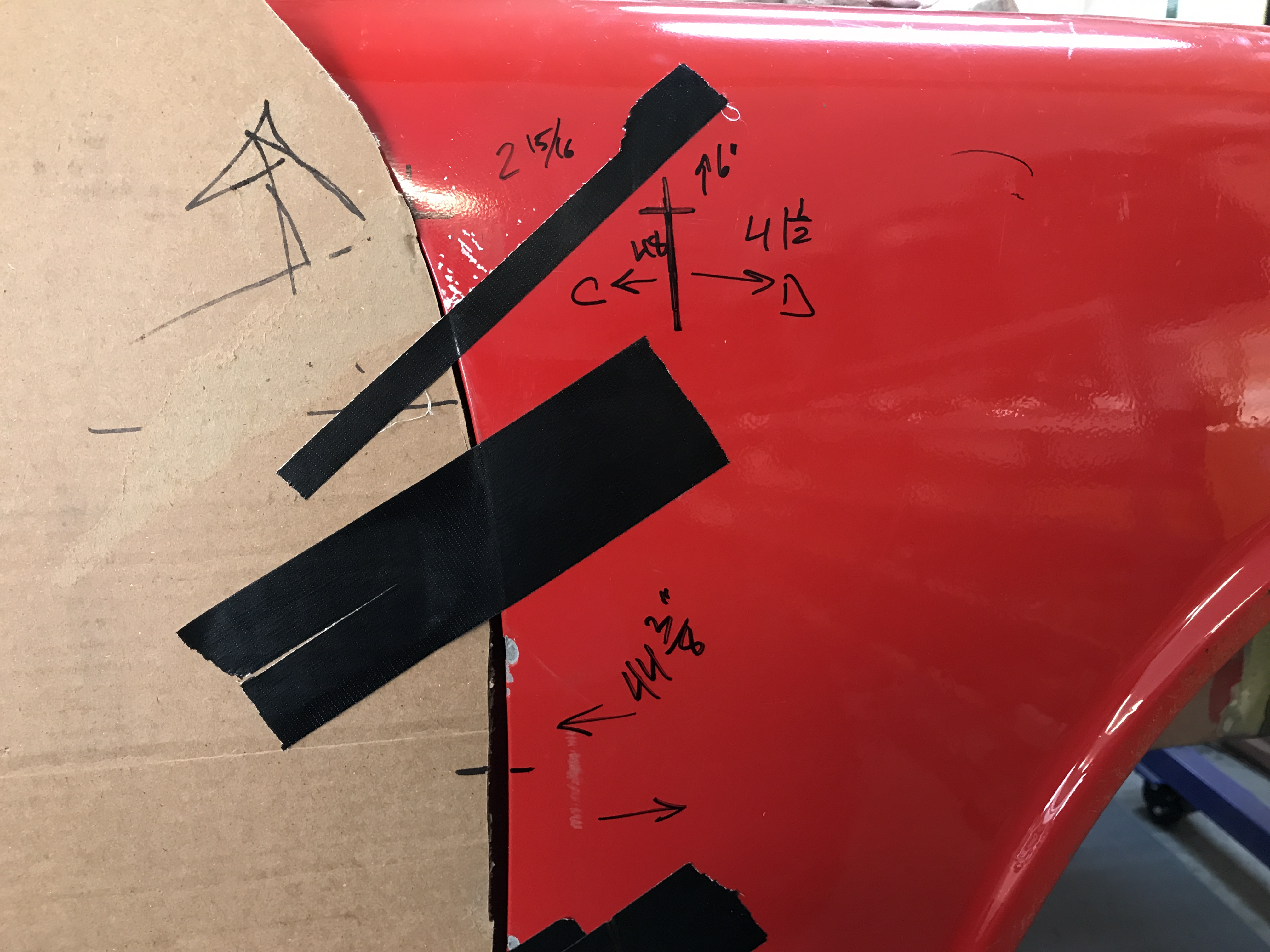 Still trying to assess and adjust the fender fit. I would like to bolt on the door, but really can't without setting the body down from the rotisserie, and removing the braces (which would require cutting). So I made a cardboard template directly from the door, and got it as close as I could accounting for the curvature. I think it is accurate except for the upper part of the leading edge.