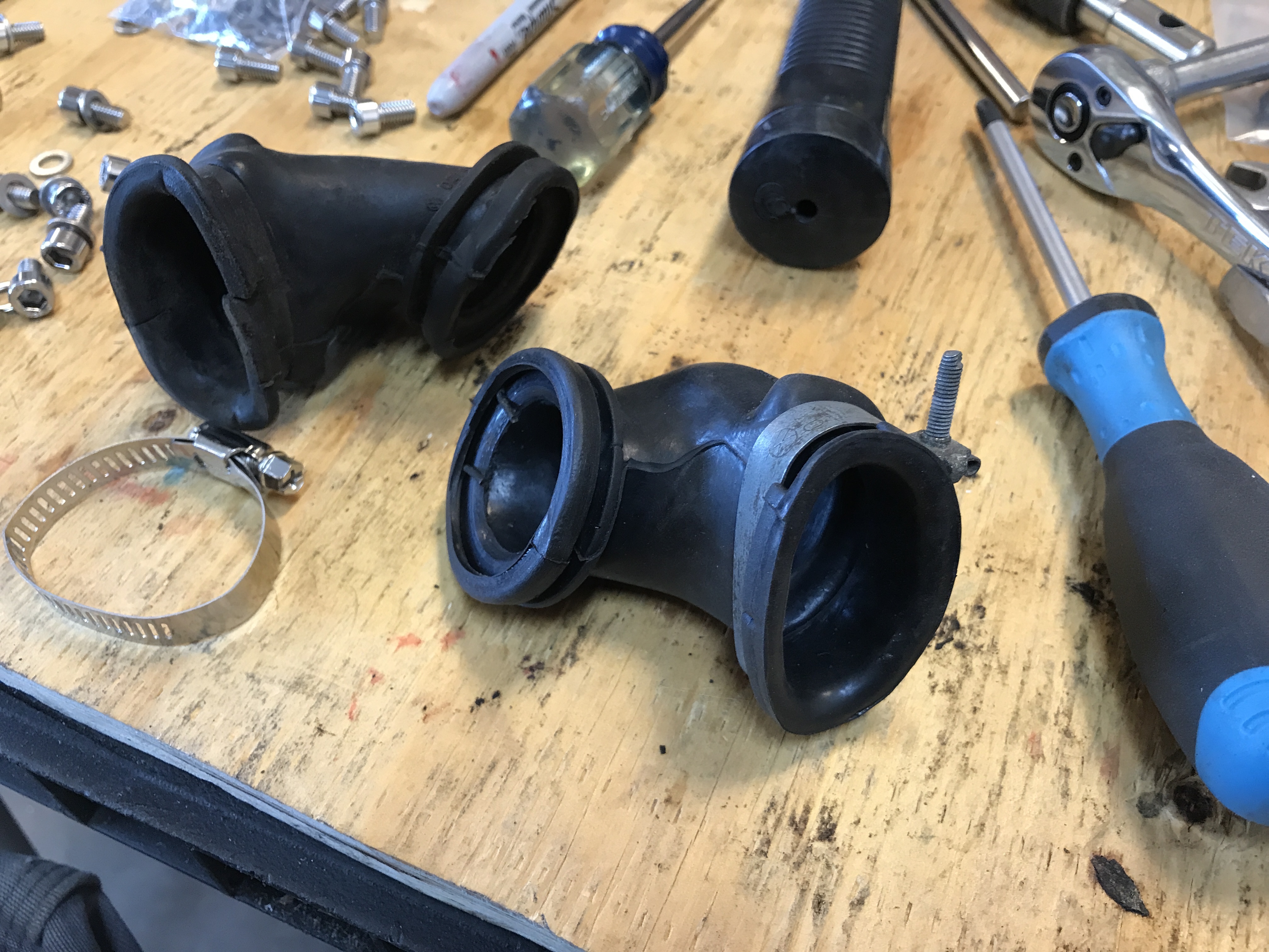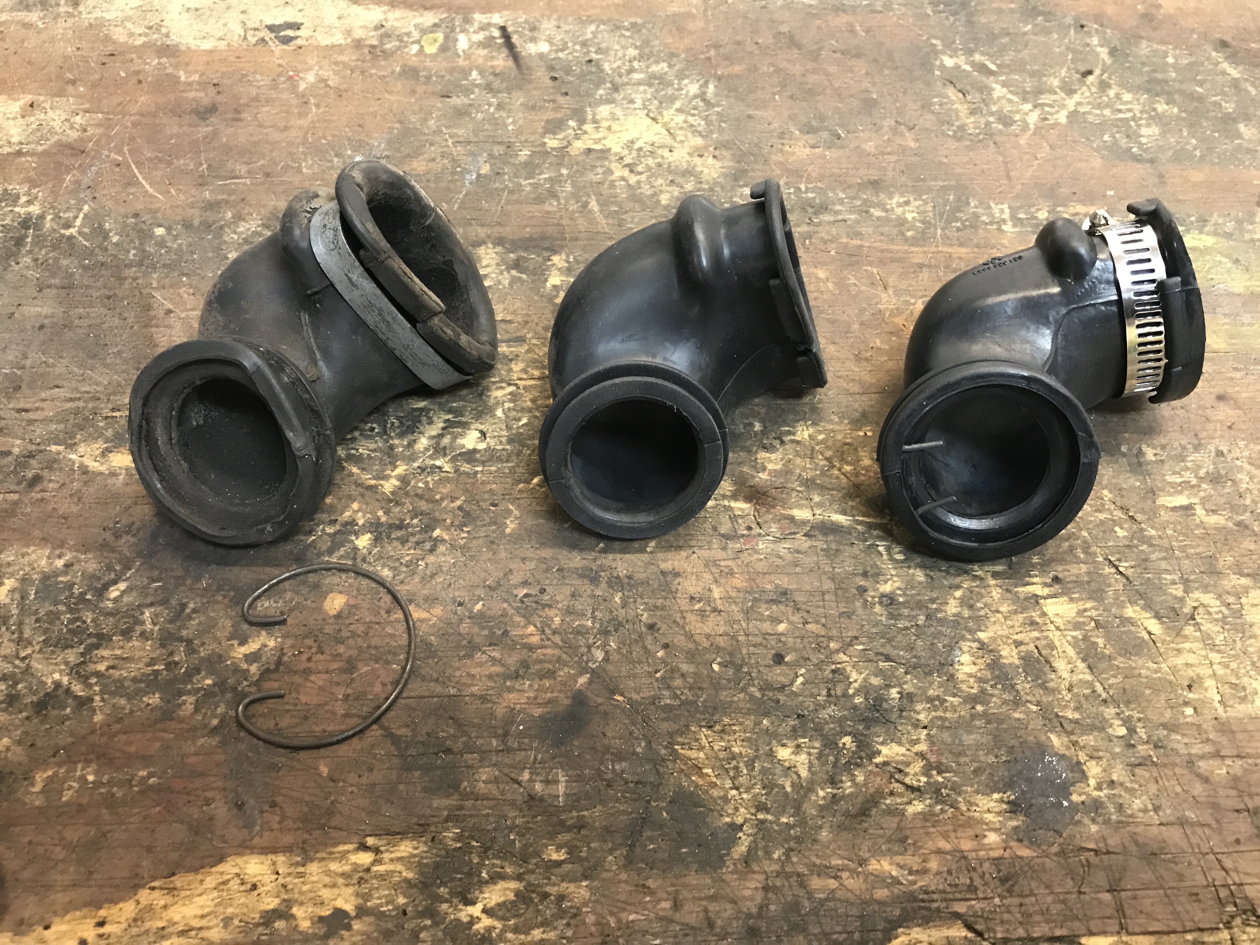 I also got my second replacement for the alternator vent rubber elbow. My old original is on the left, 914 Rubber repro in the middle, and new (repro) on the right. Note the new one shipped with a cheesy worm drive clamp.