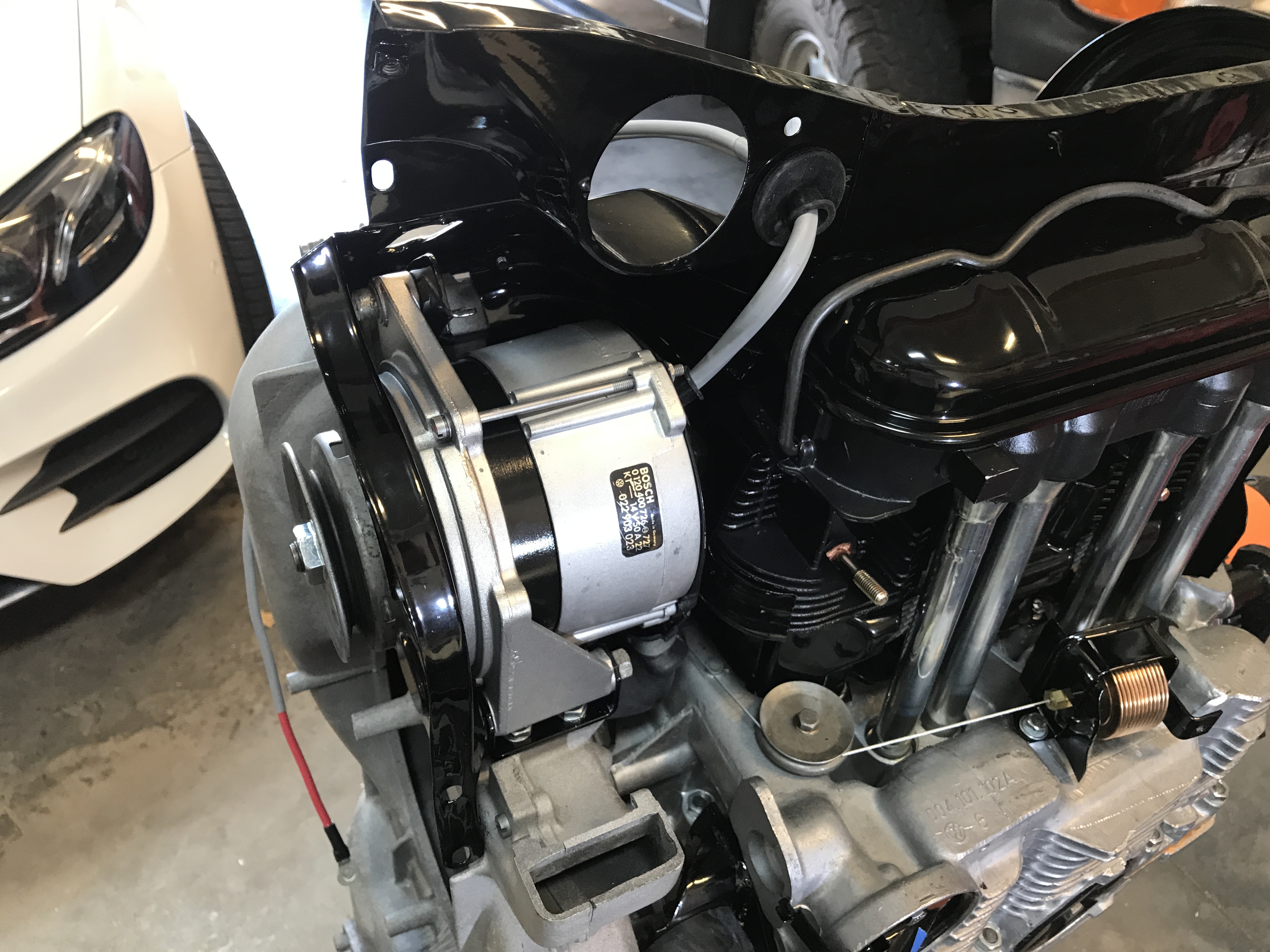 Brackets, sheet metal, and alternator installed, with the new cables routed through the side sheet metal.