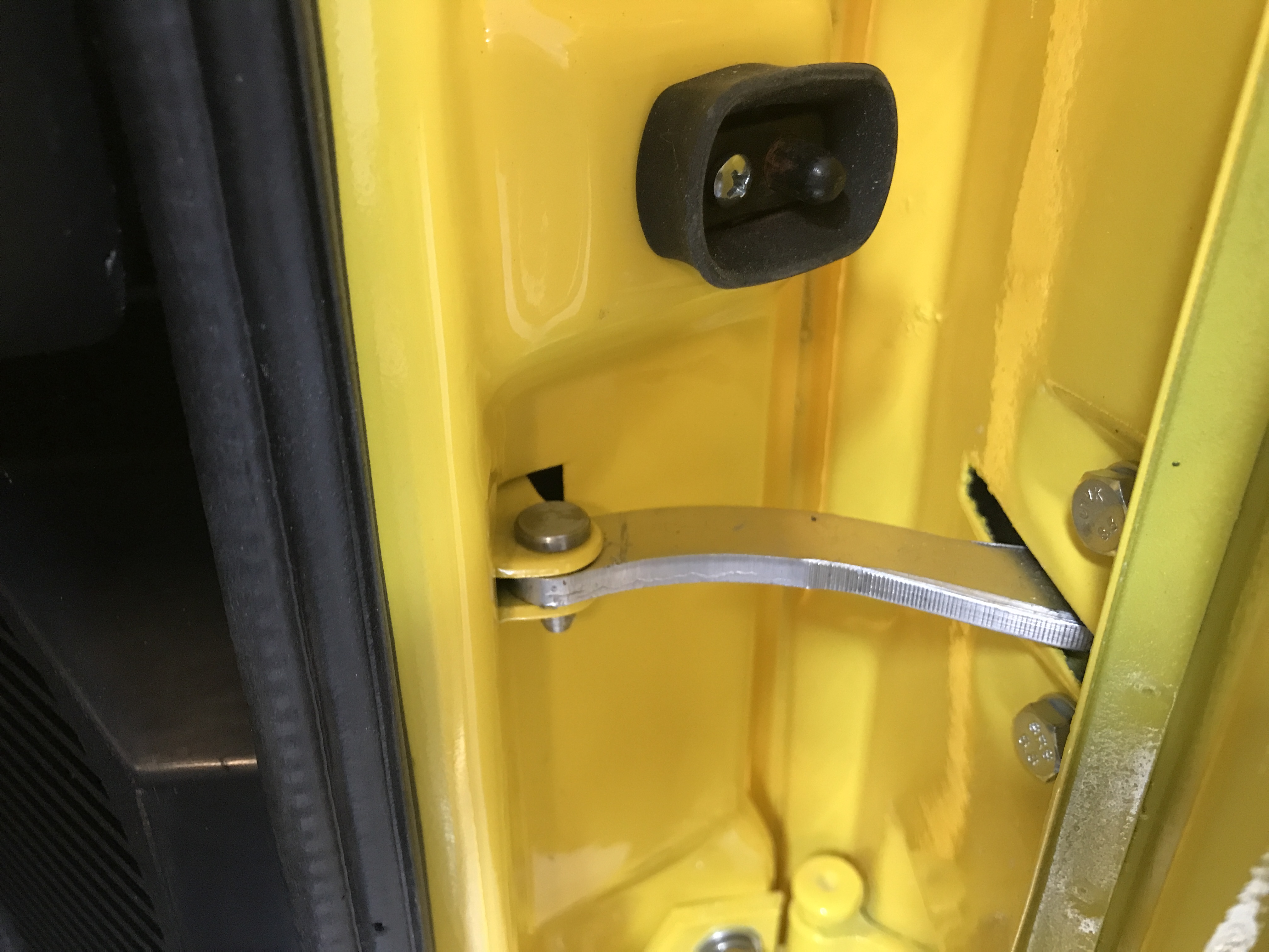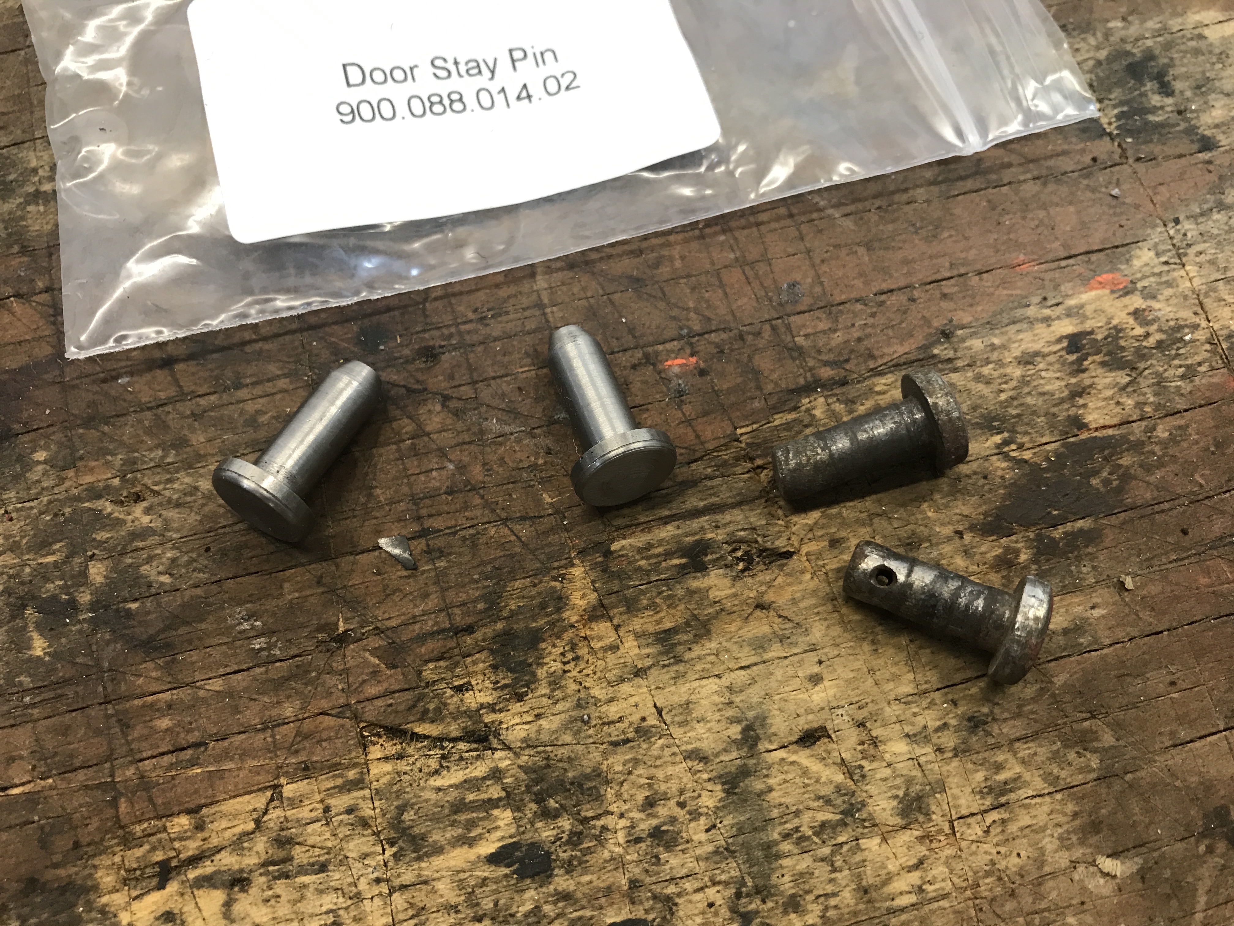 Yup, doors (at least right door), going on the car. How about some new door stop retaining pins? The ones from 914Rubber measure .01 inch larger diameter than stock. To make them fit, I had to drill the stay arm, and ream out the paint from the holes in the tabs on the door jamb.