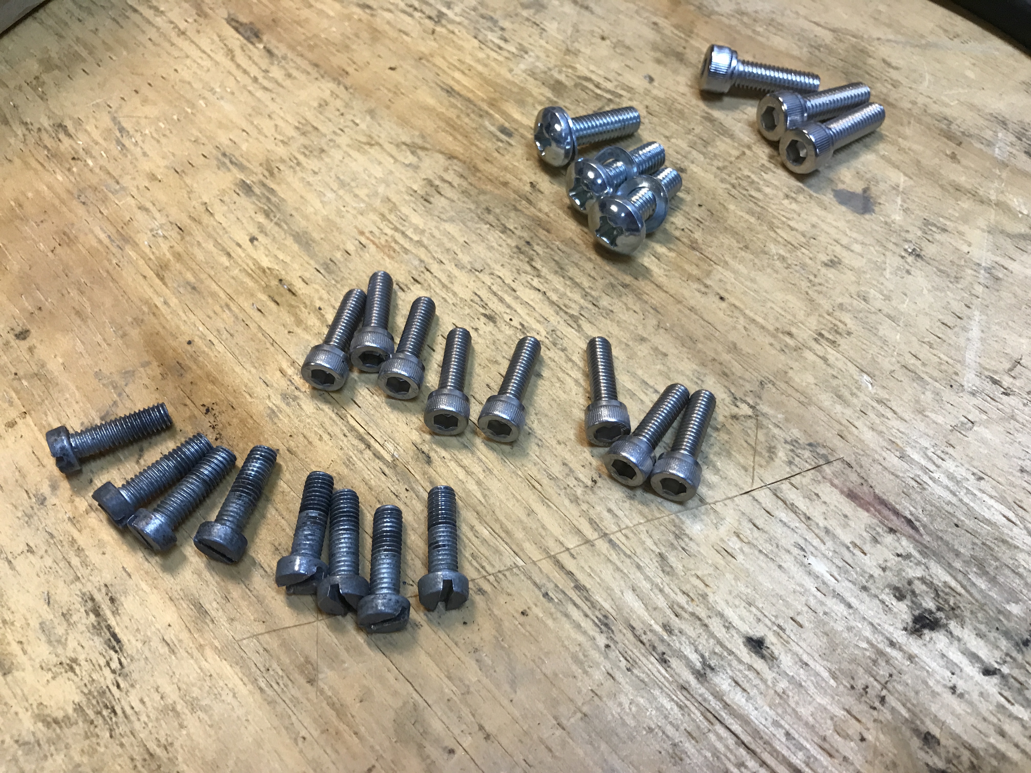 The hardware furthers my quest to replace all the slotted fasteners on the engine with Allen heads. Note the big Philliips screws are not original but I used them when I first put the blower housing together.