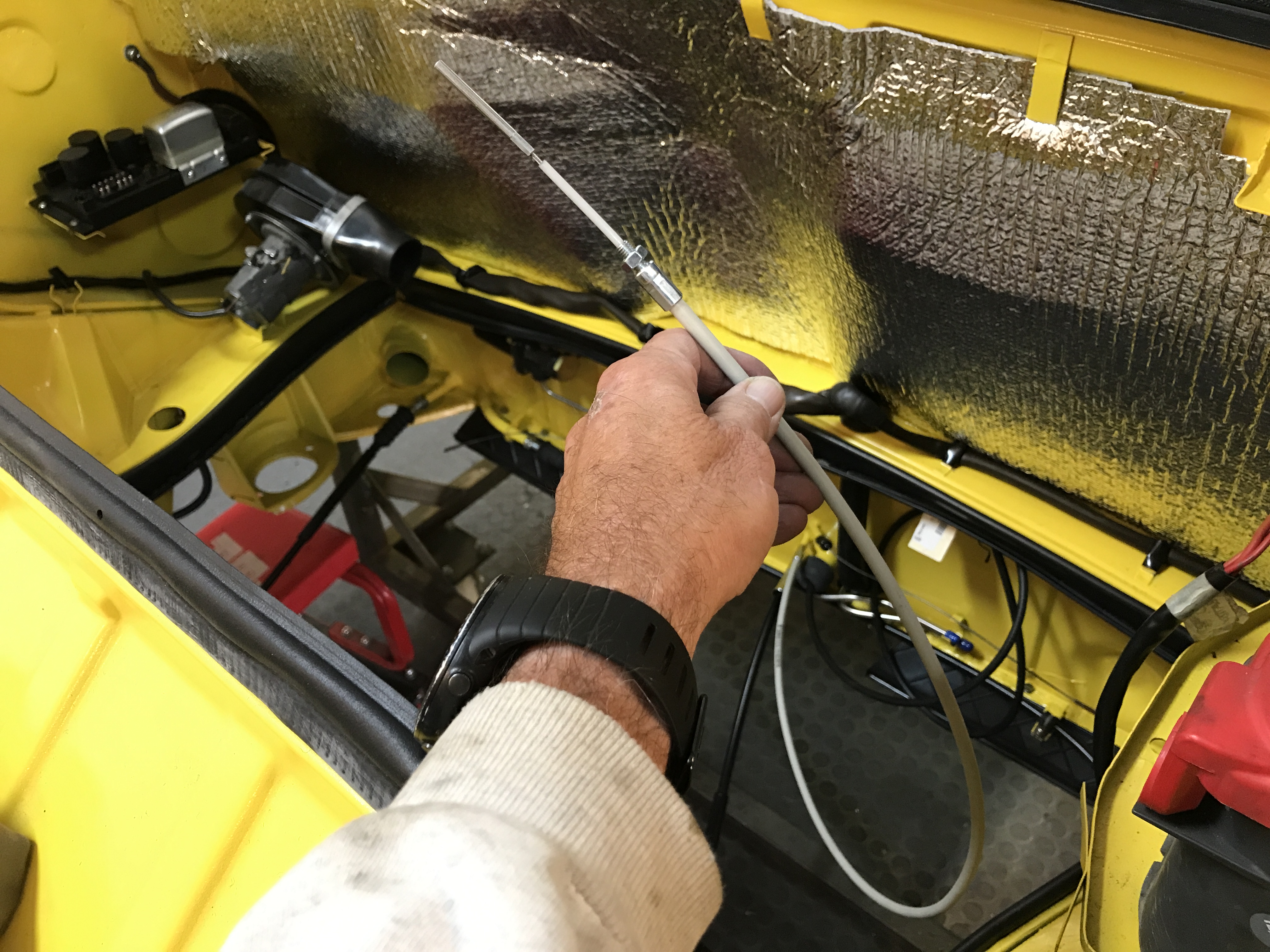 In order to reach the right rear, the accelerator cable will need to come up through the sheet metal near the front, so I made a new 1/2 inch hole.