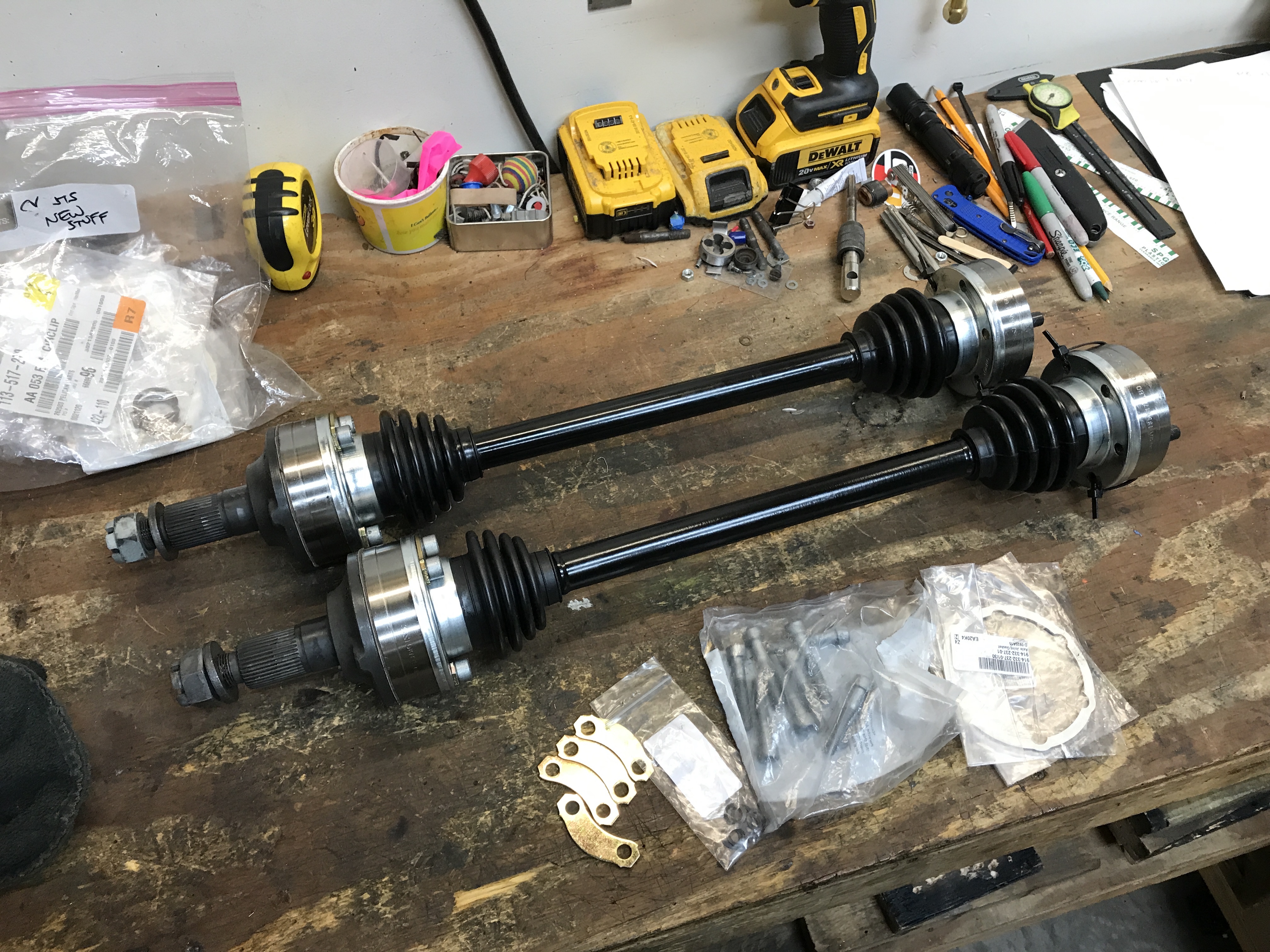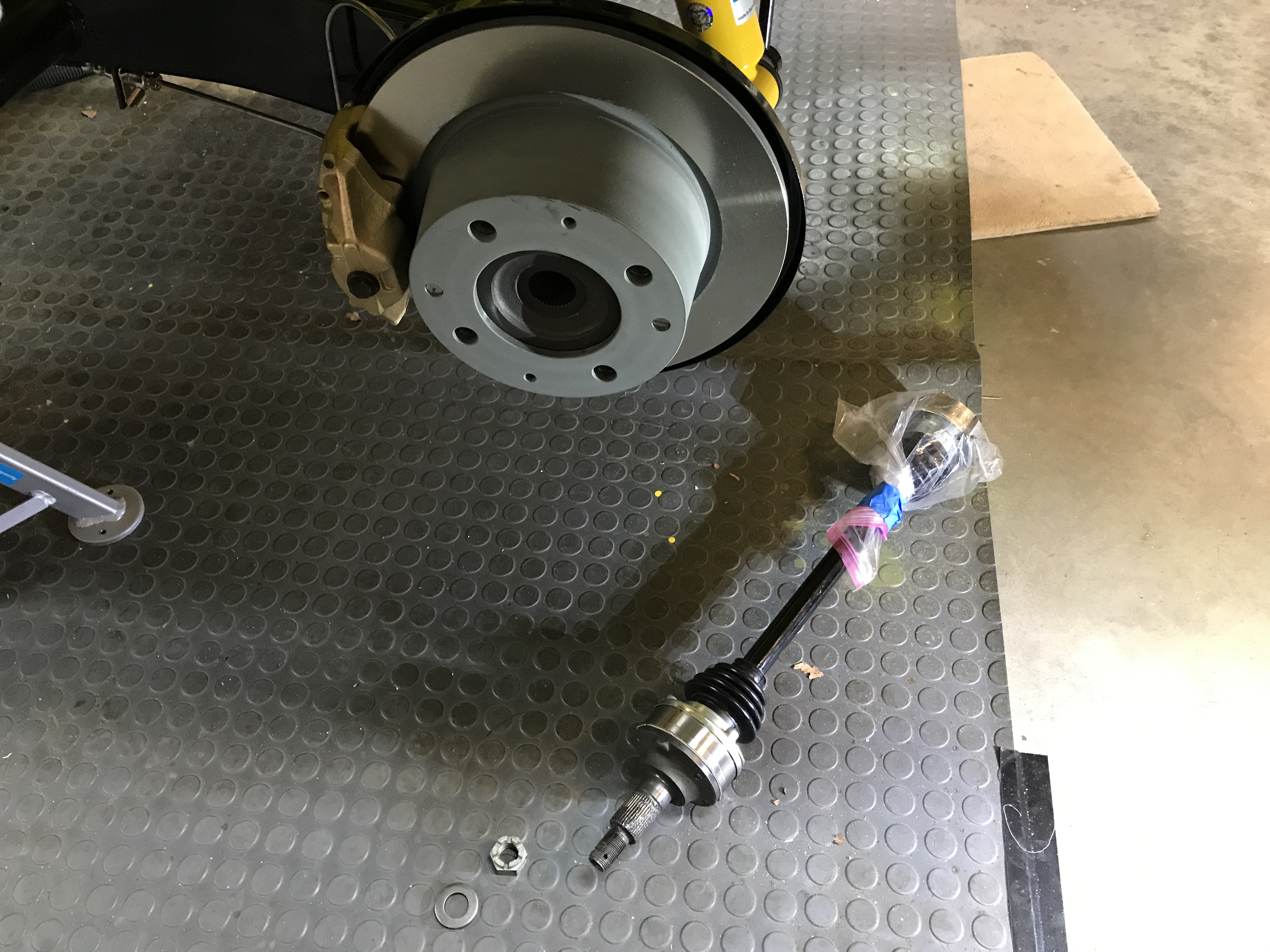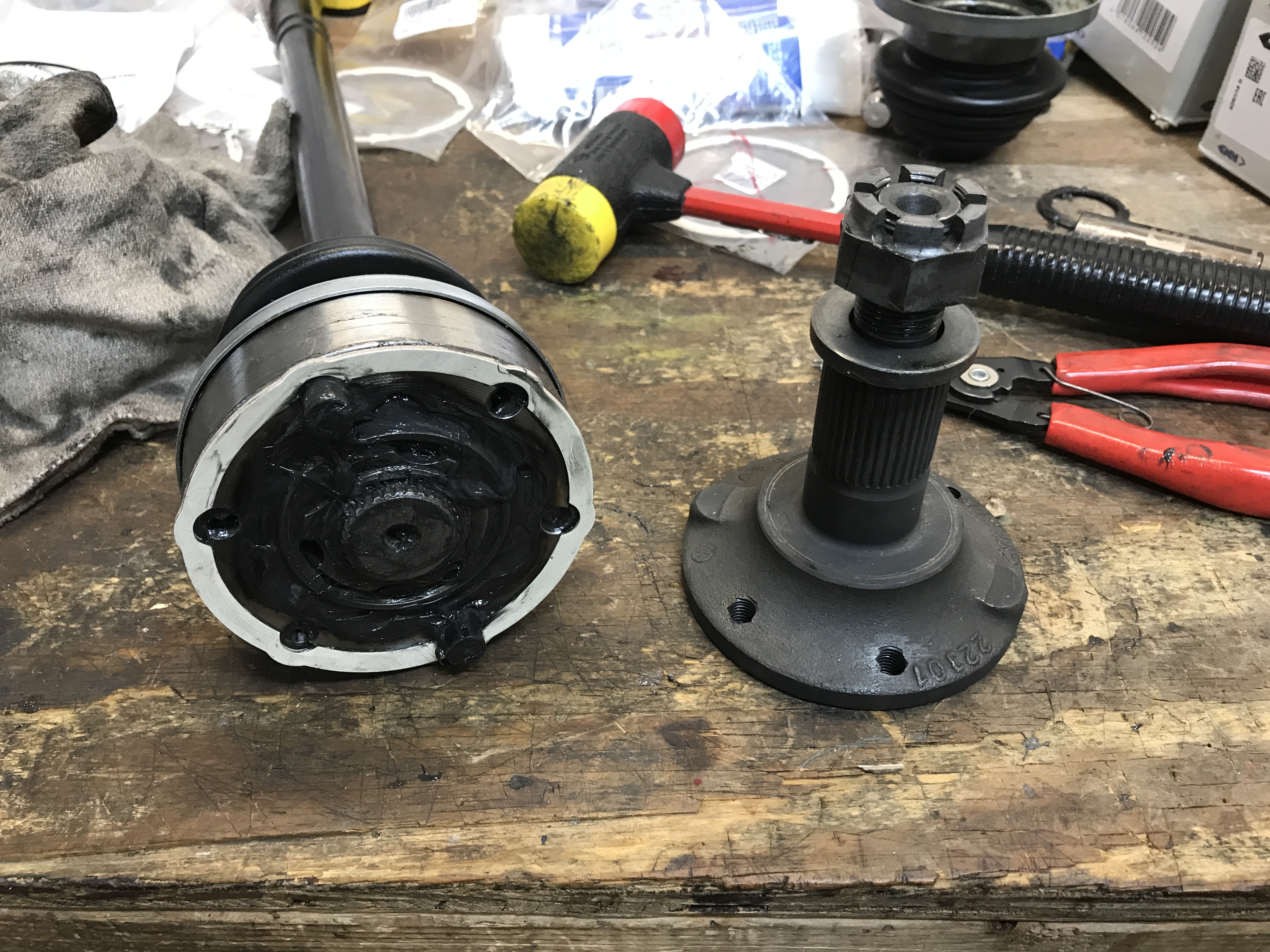 To minimize mess, after installing one CV on each half-shaft, I attached the stub axle with a new paper gasket.