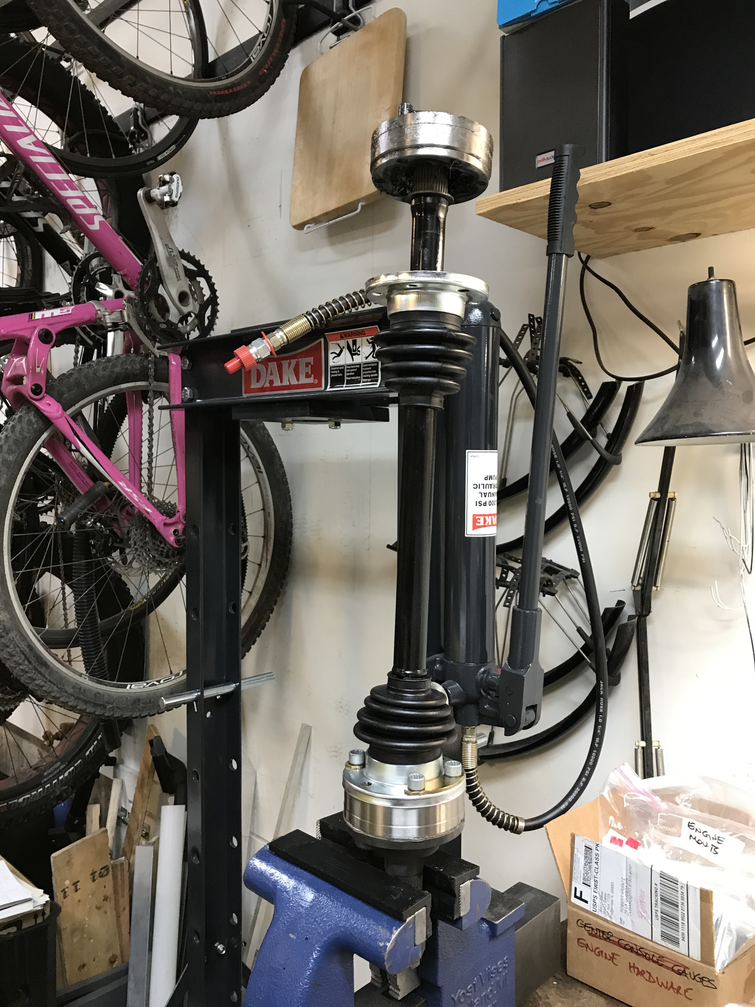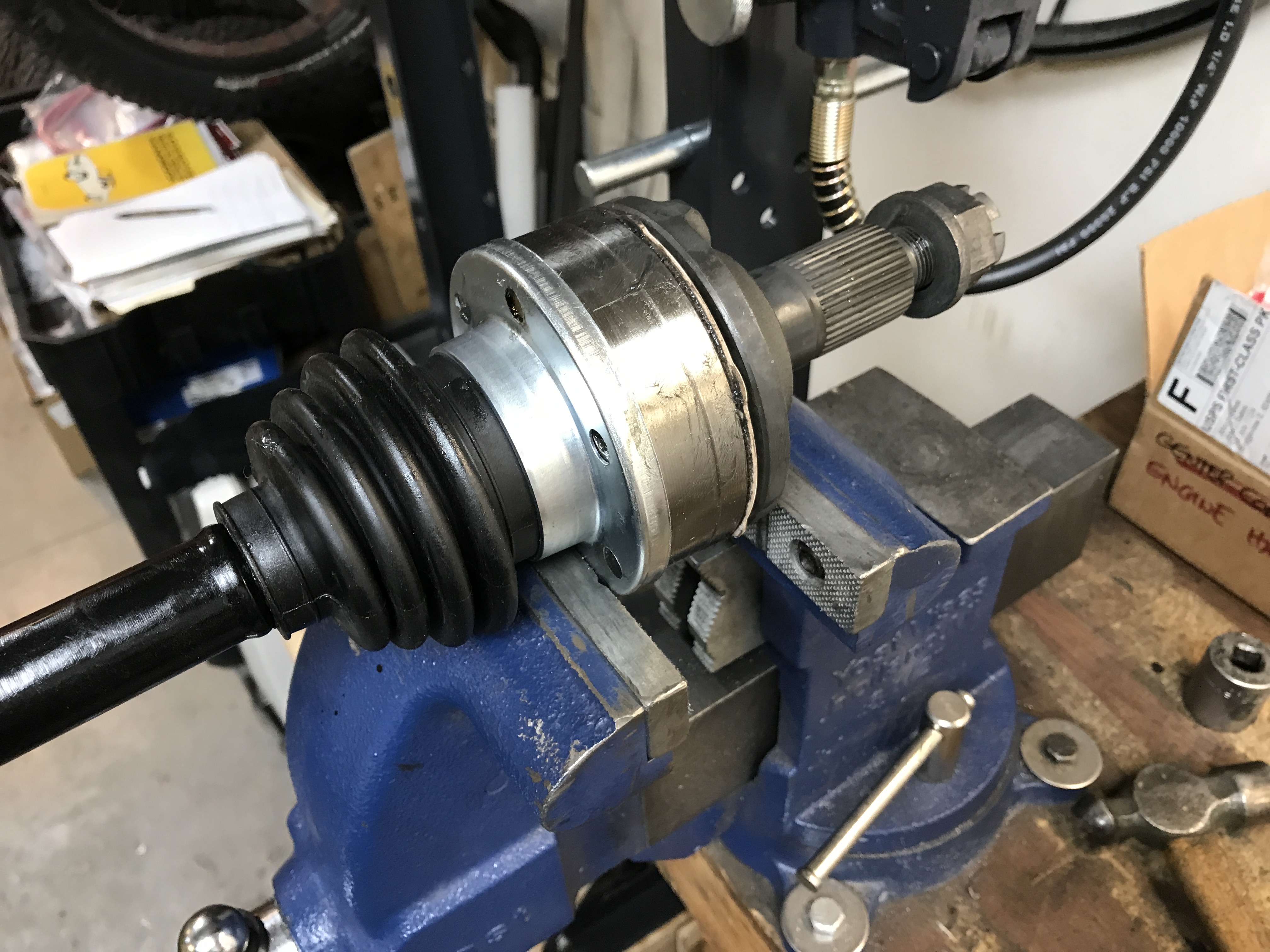 Without my press, I used a vise to squeeze the CV with new locating pins into the flange, enough to get the bolts started.