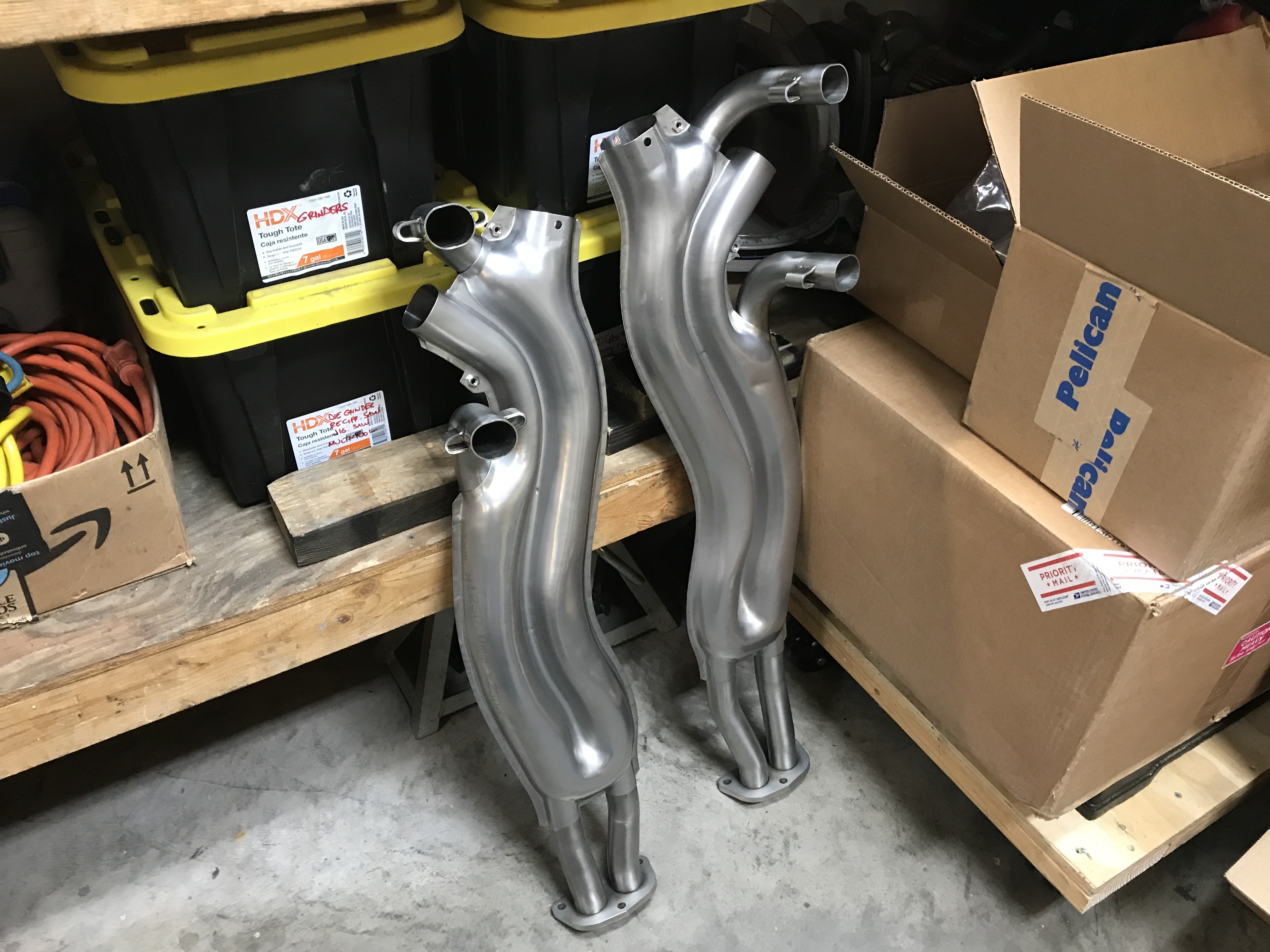 We ran out of time, but to get ready for completing things I got the new SS heat exchangers out of "storage", AKA the guest rom closet. The only parts left there are the windshield trim pieces.