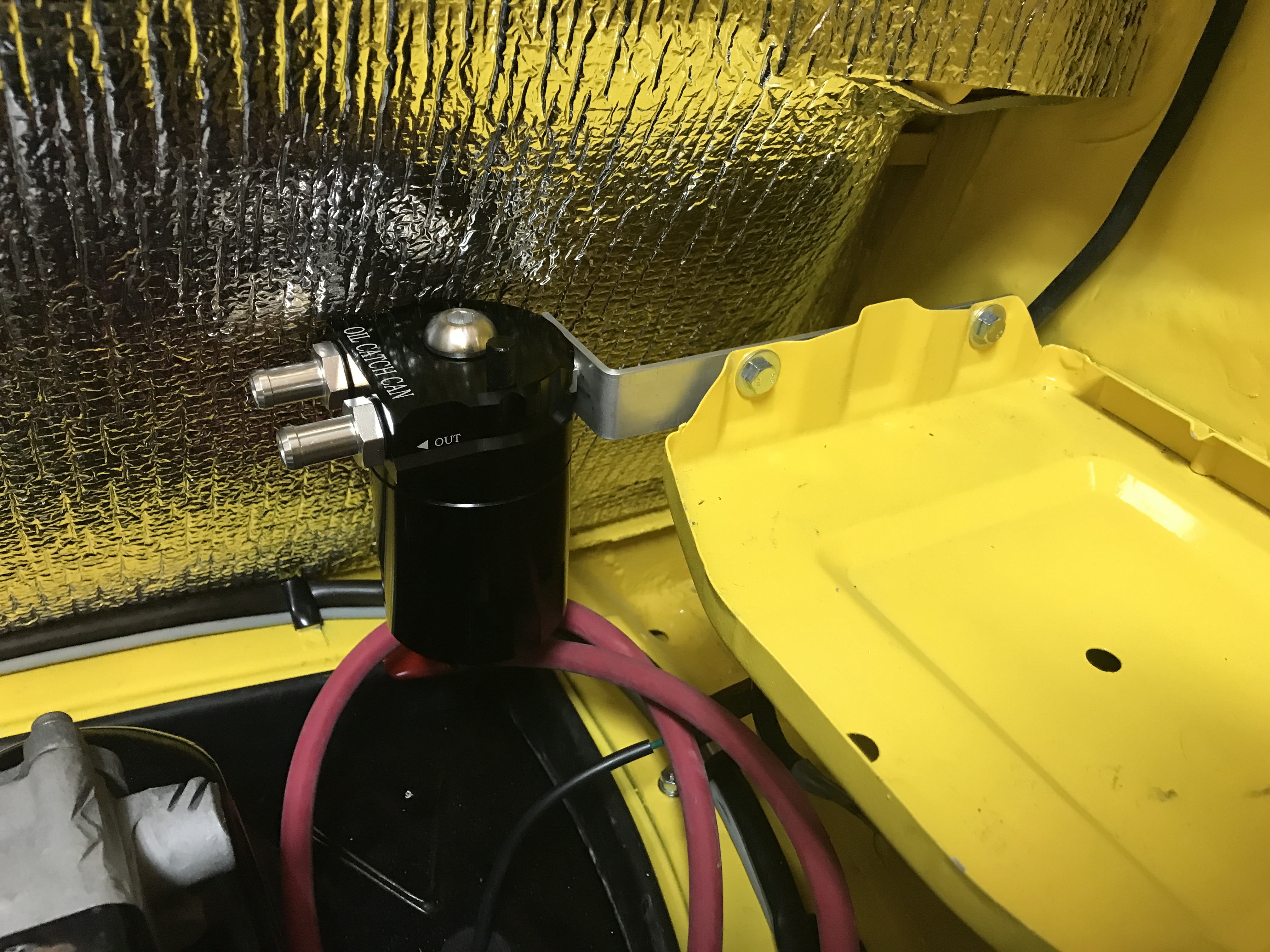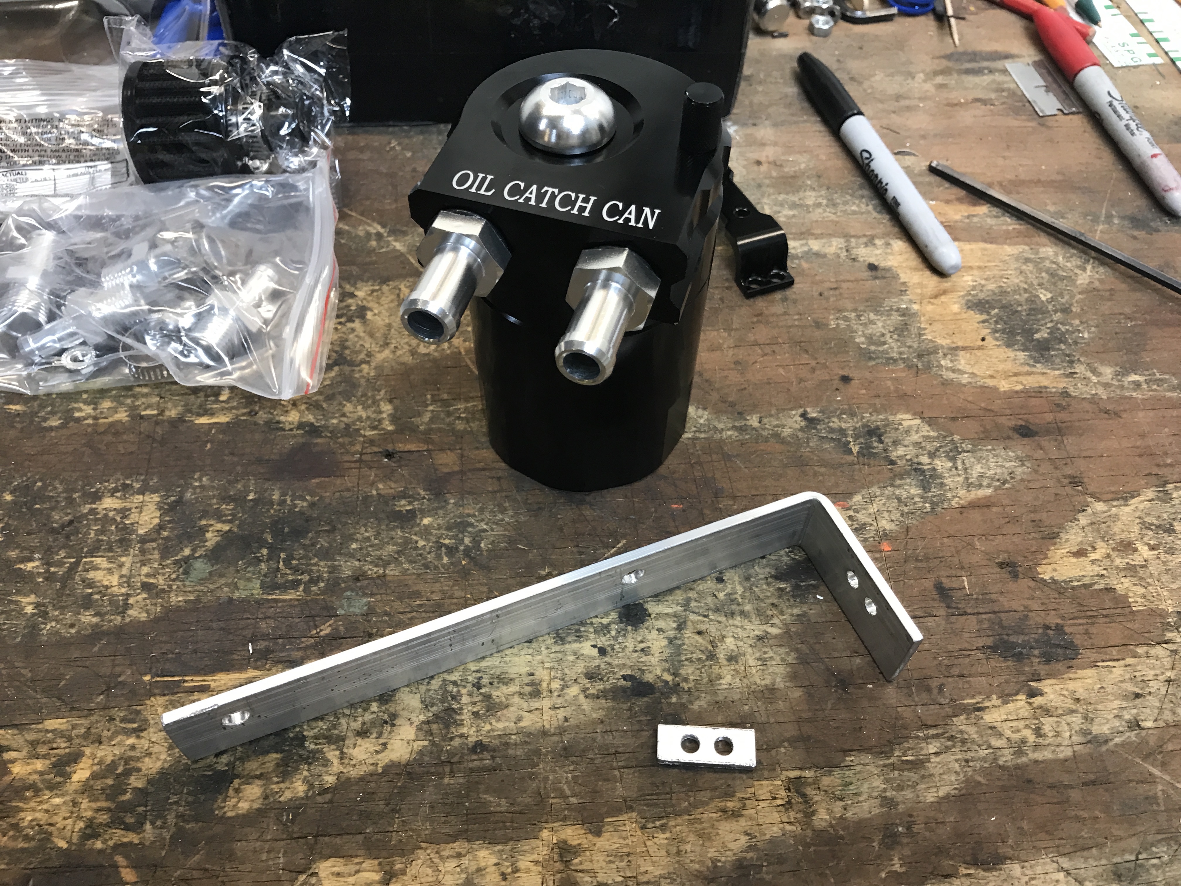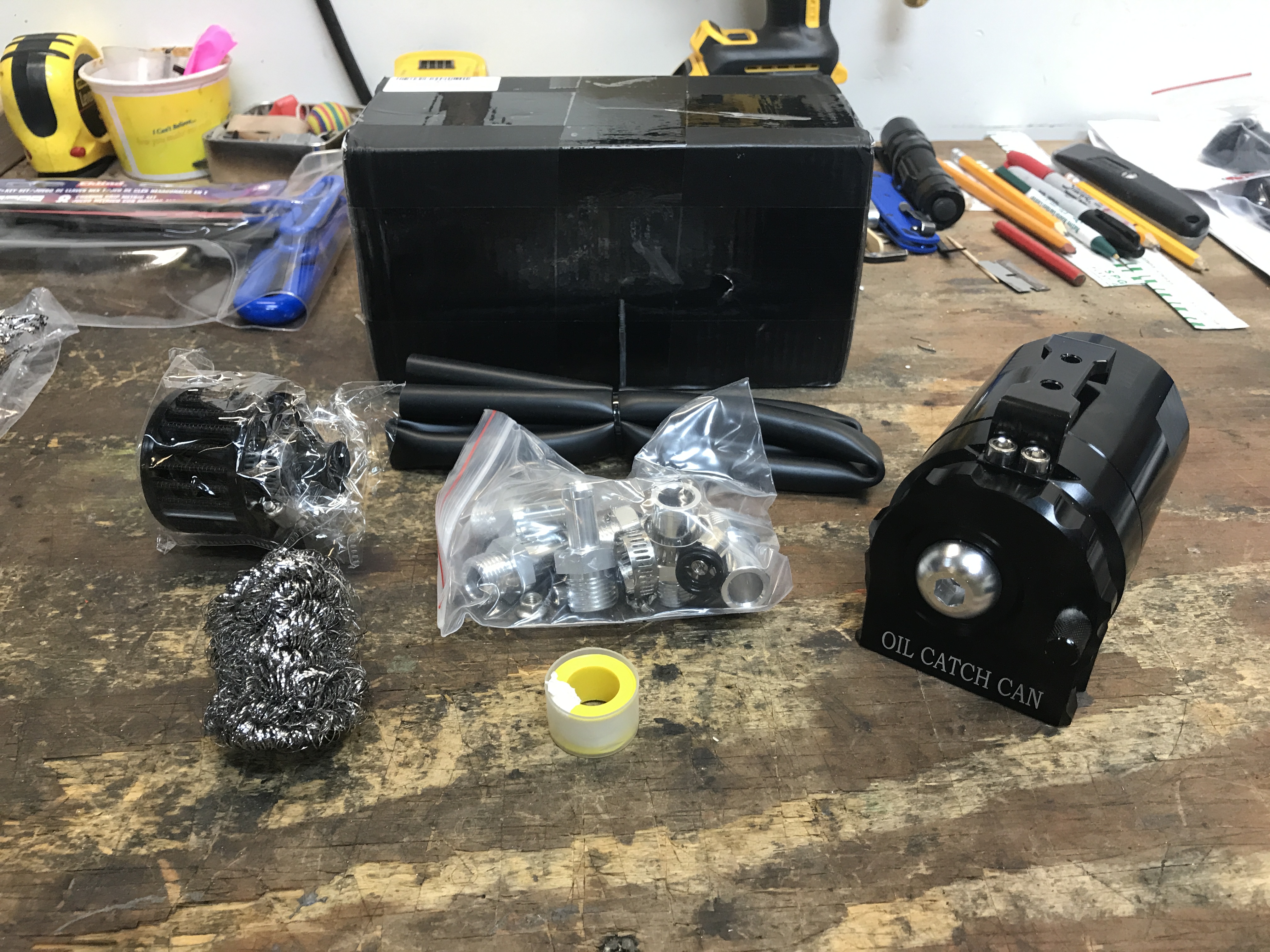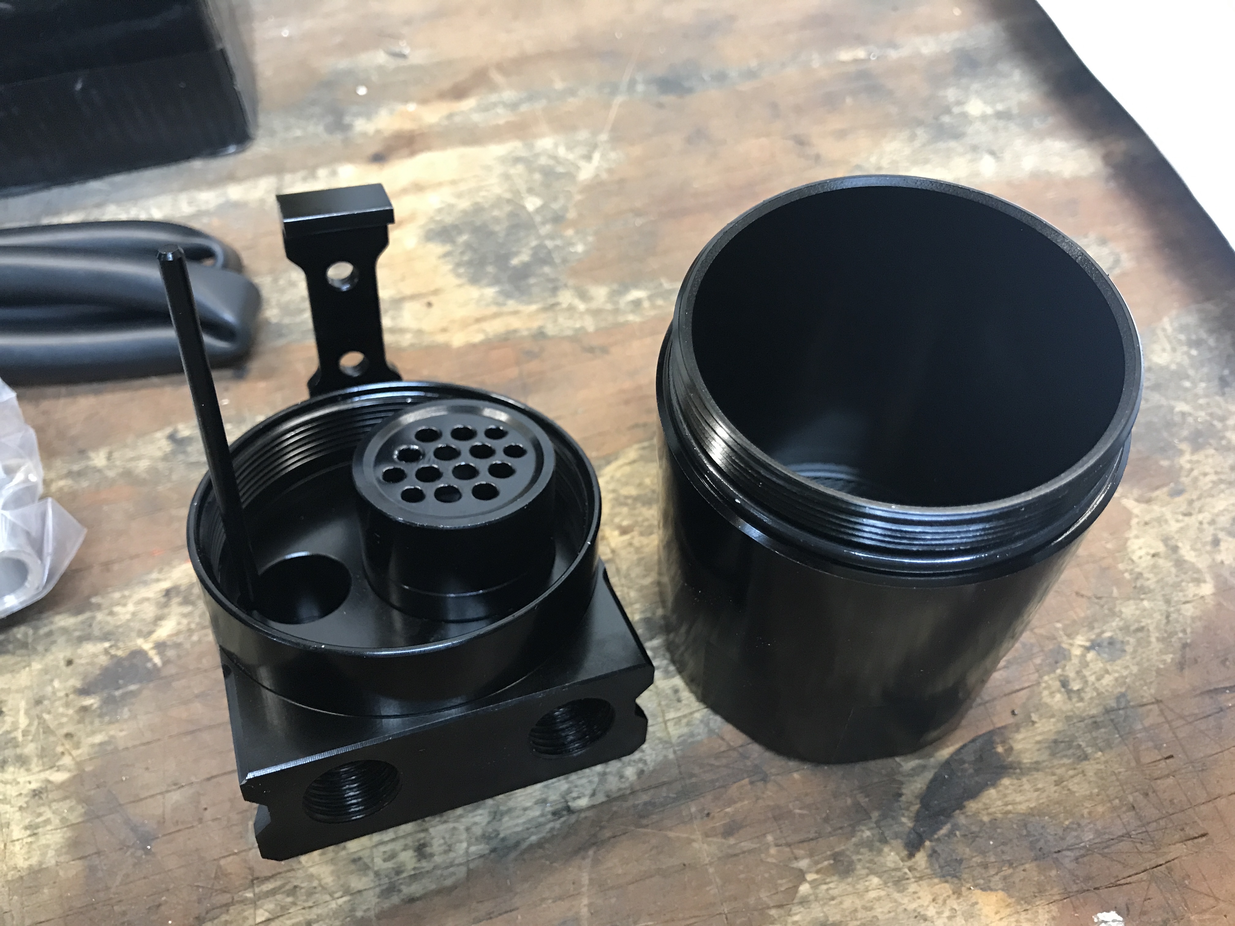 Another minor detour: I will replace the PCV valve with an open line, first to a catch tank, and then to one air filter. I chose one of many tanks on Amazon. This one is all machined aluminum. It has an optional filtered air vent and other stuff.