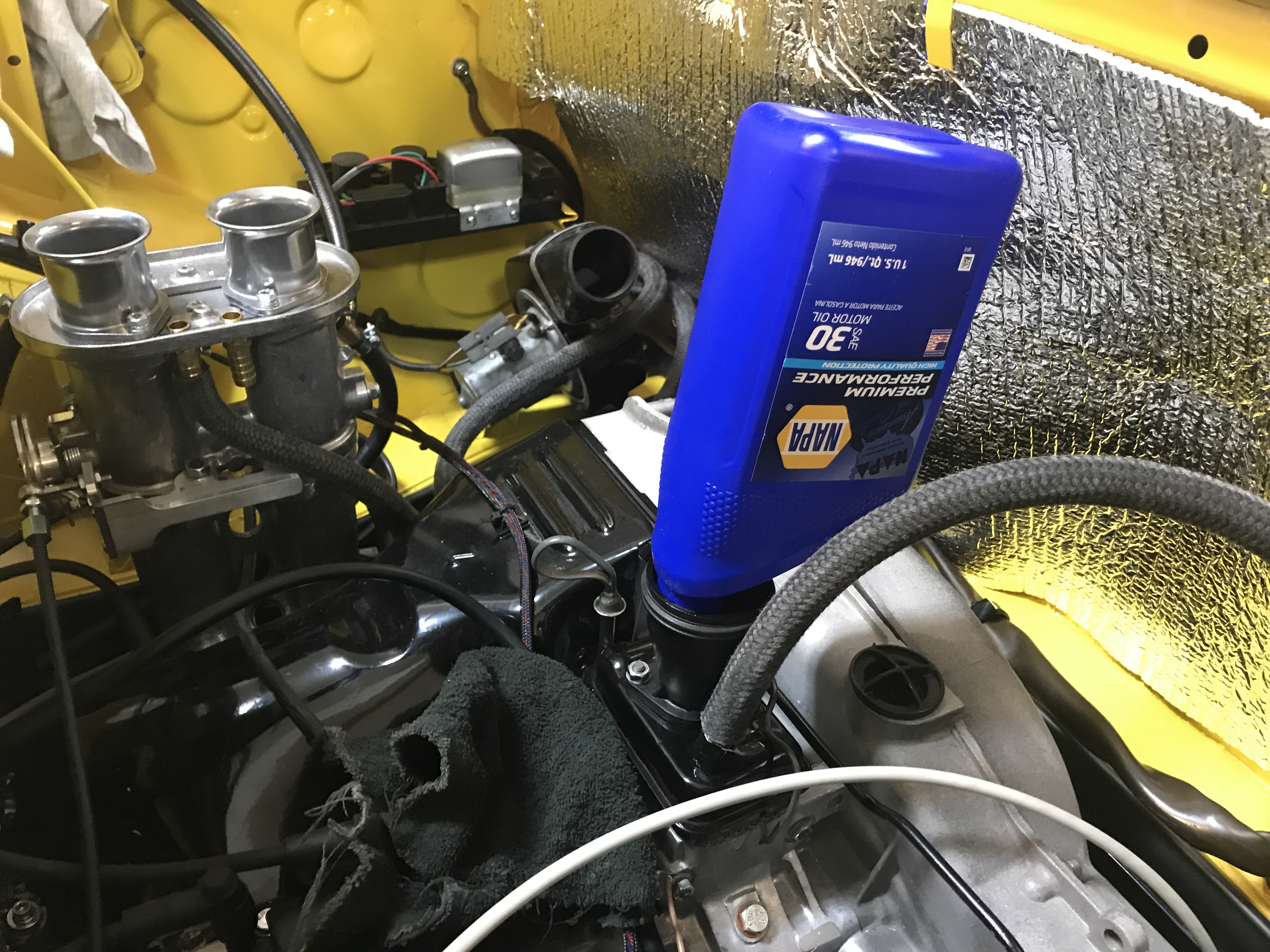 Next, the first oil fill, with straight 30 weight, plus a bottle of Lucas break-in additive, mostly for the boost in zinc.