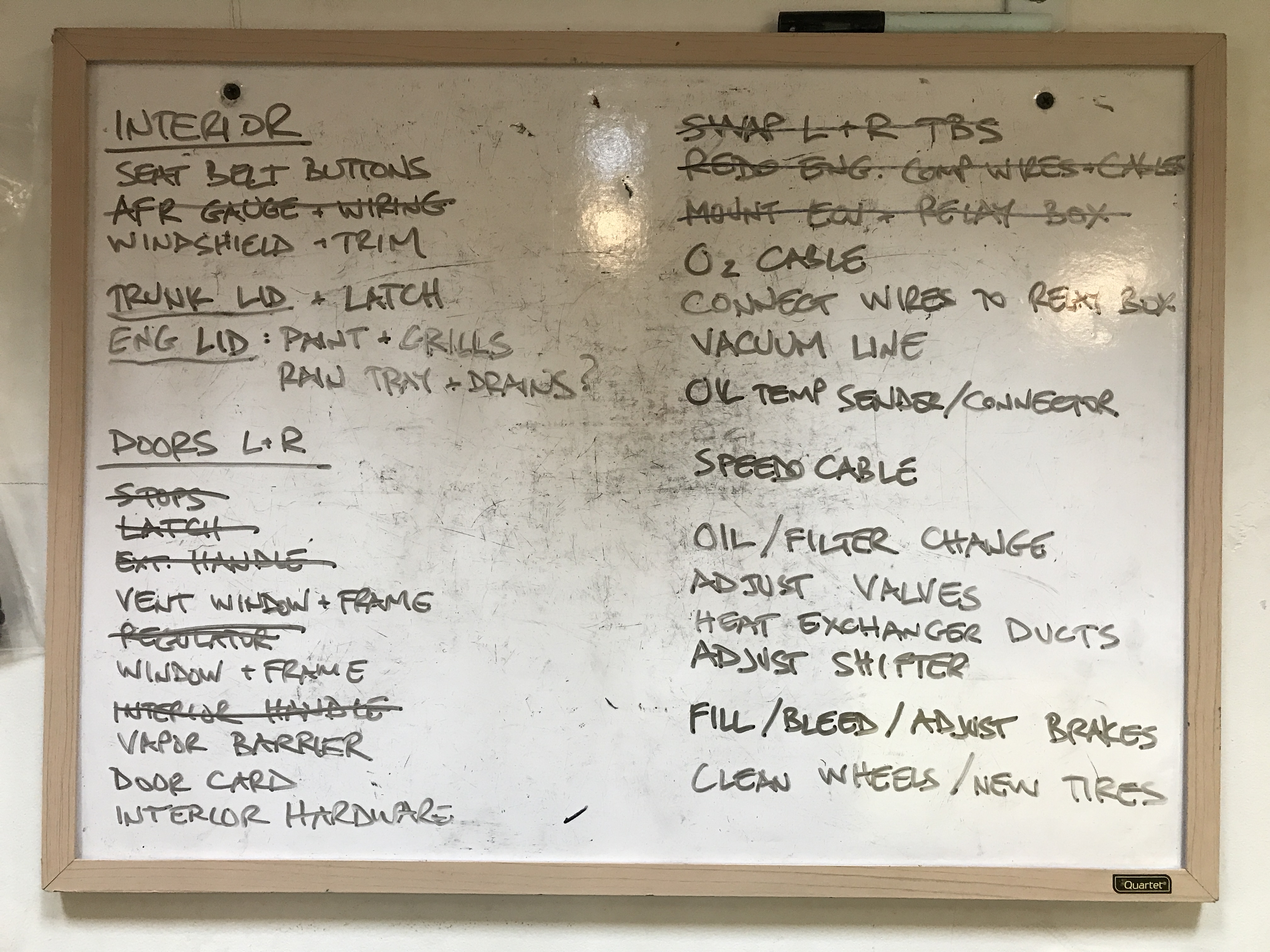 This could be the last white board list. At least when I get all these tasks done the car should be ready for the road.
