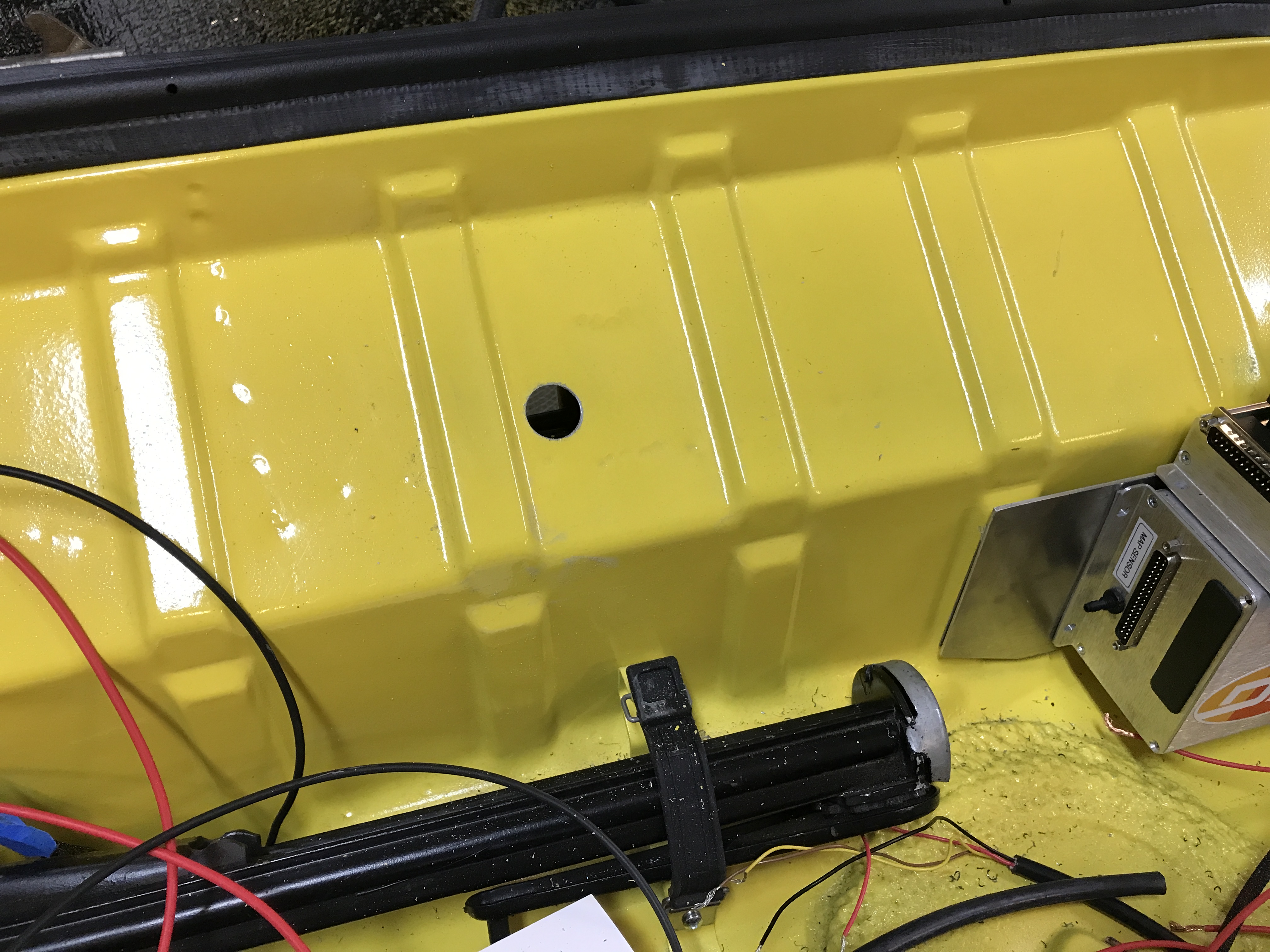 Time for some more holes! This hole in the right engine shelf is for the O2 sensor cable. I am trying to follow the logic of where cables and hoses go, along with disconnects, so that the engine can drop in the future with minimal fuss.