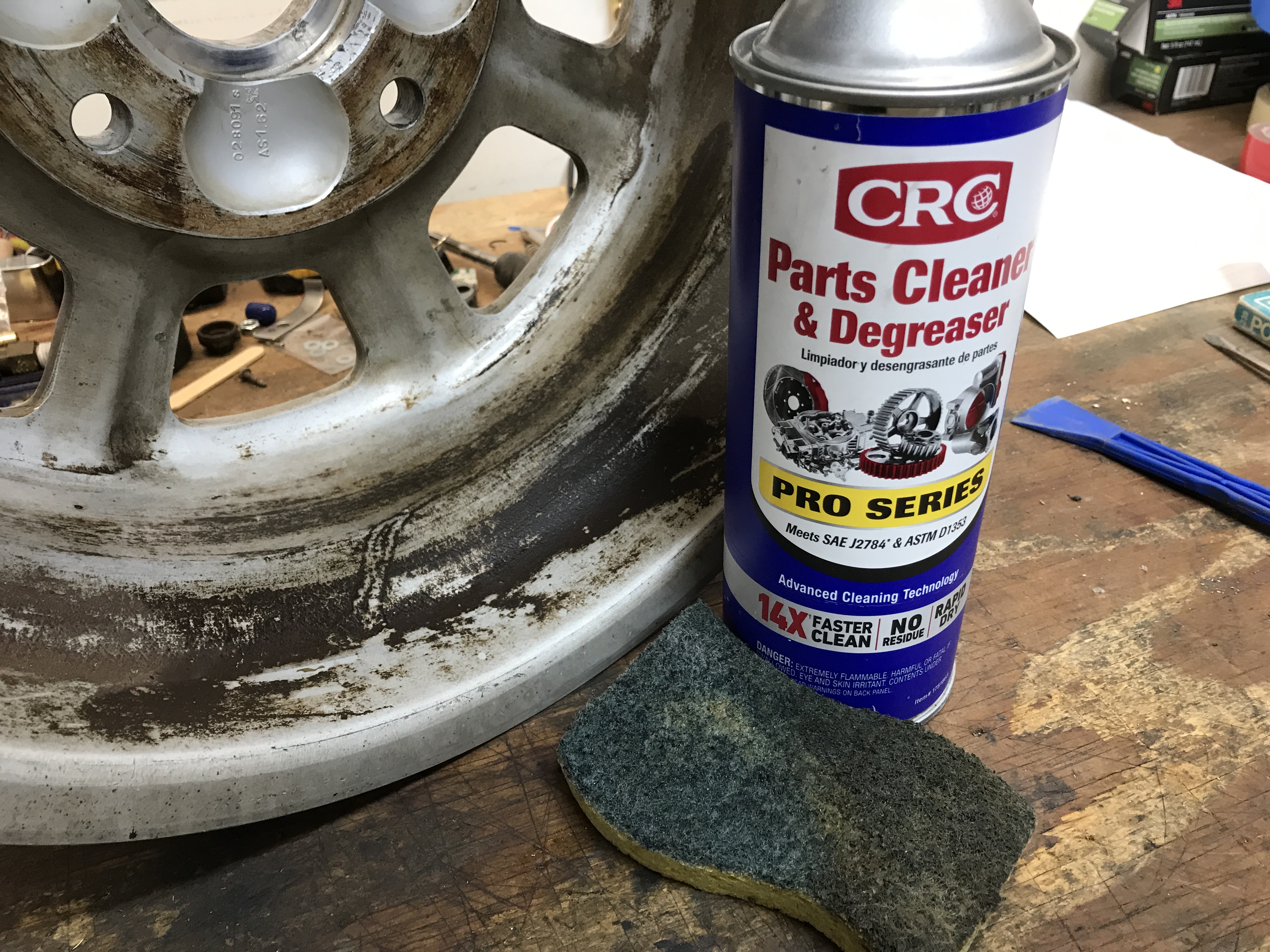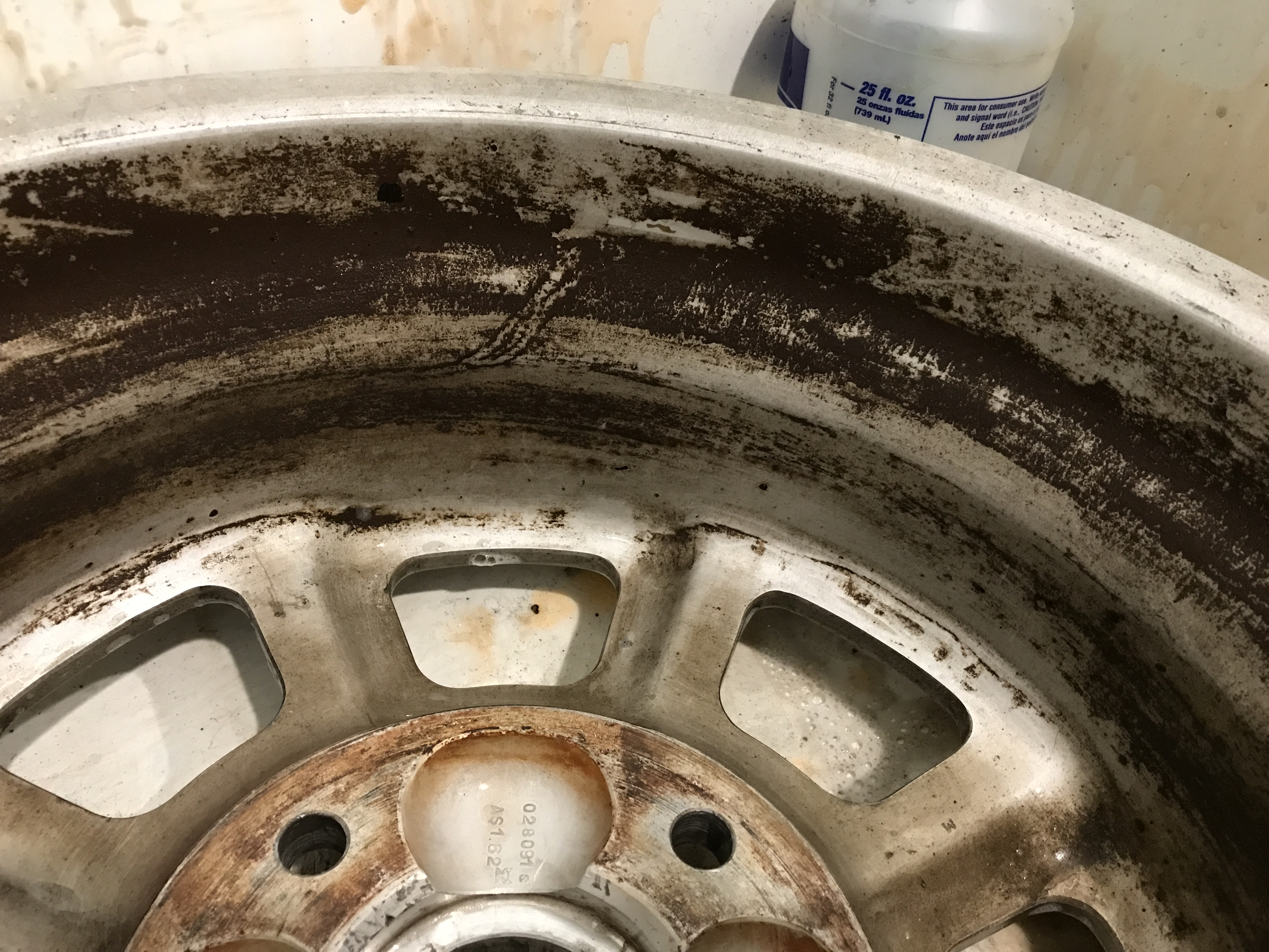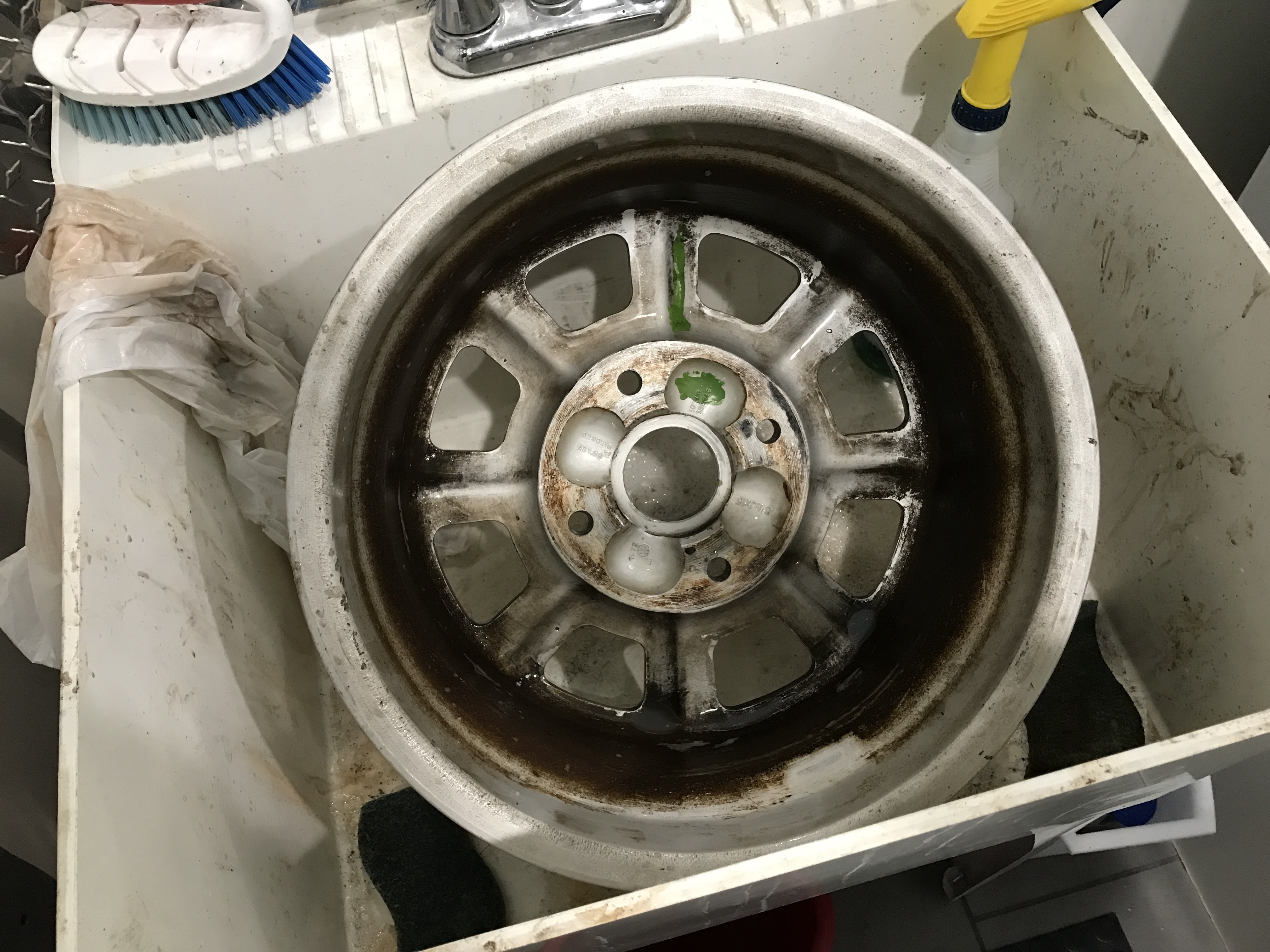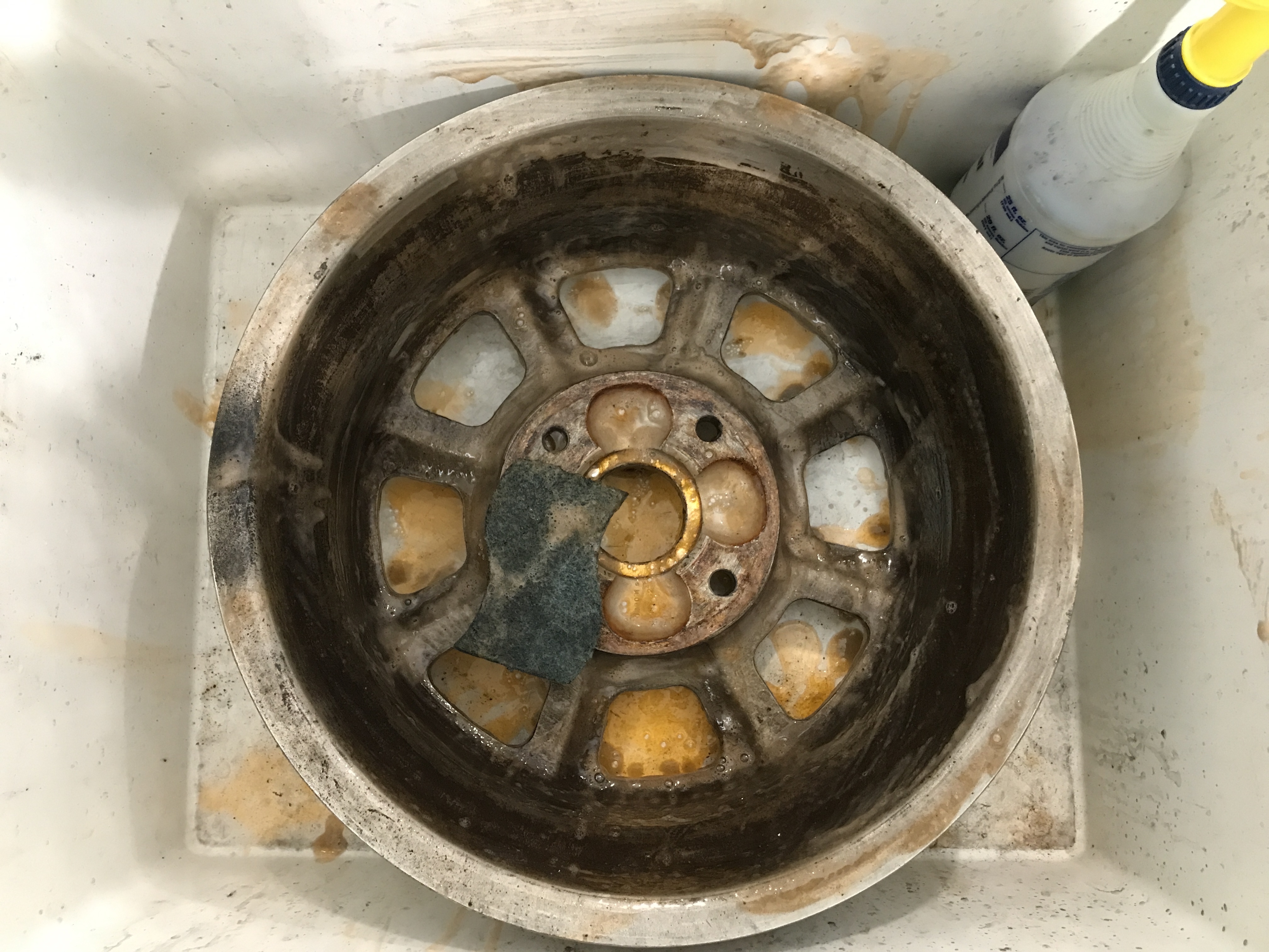 Step 6: Attack the crud inside the wheel with cleaner. Note, this wheel and one other have a pretty solid coat of hardened brown crud.