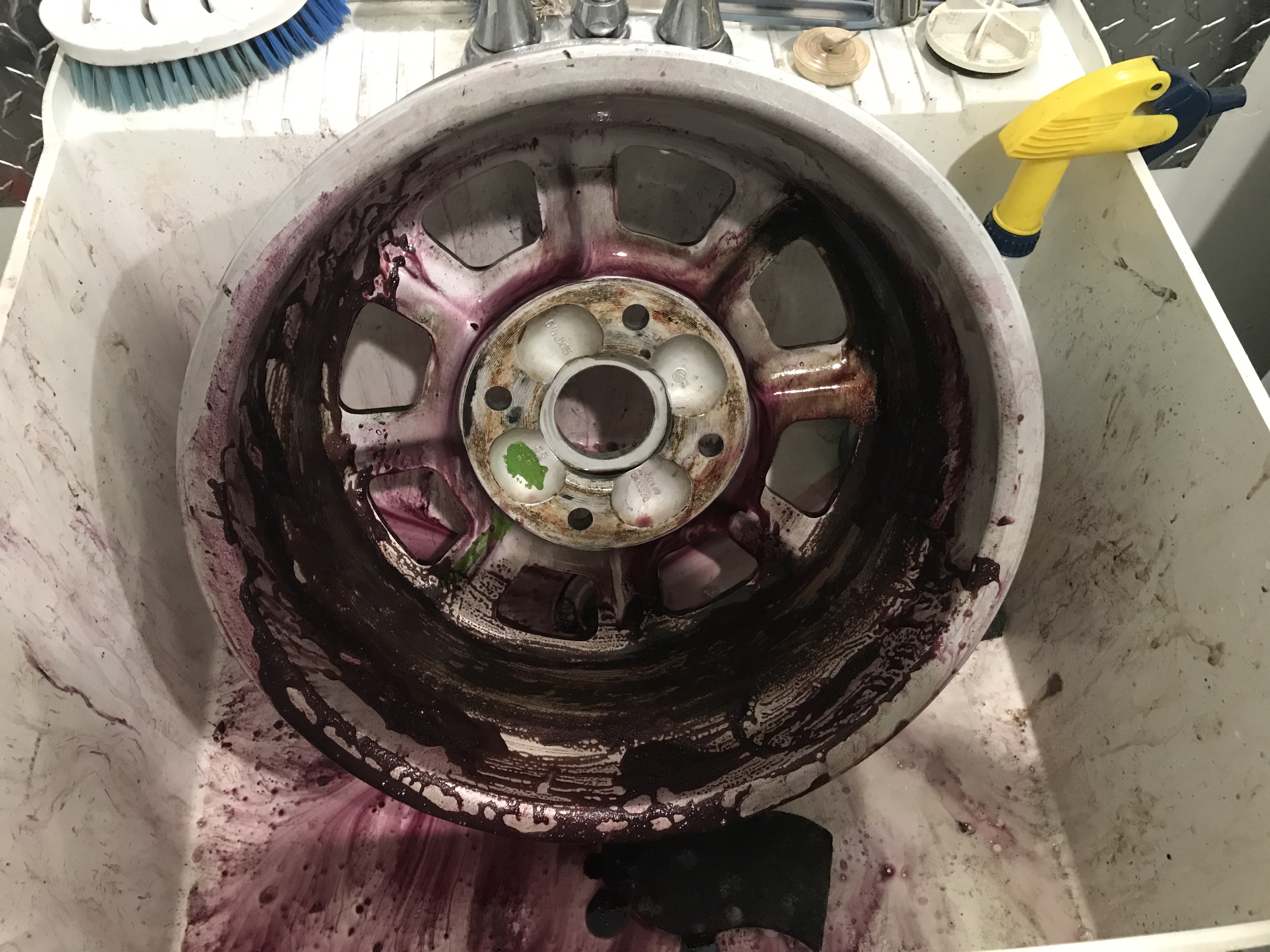 I went back to the wheel that I started with the bit of Iron-X I had on my shelf. Lots of purple means lots of iron crud getting dissolved.