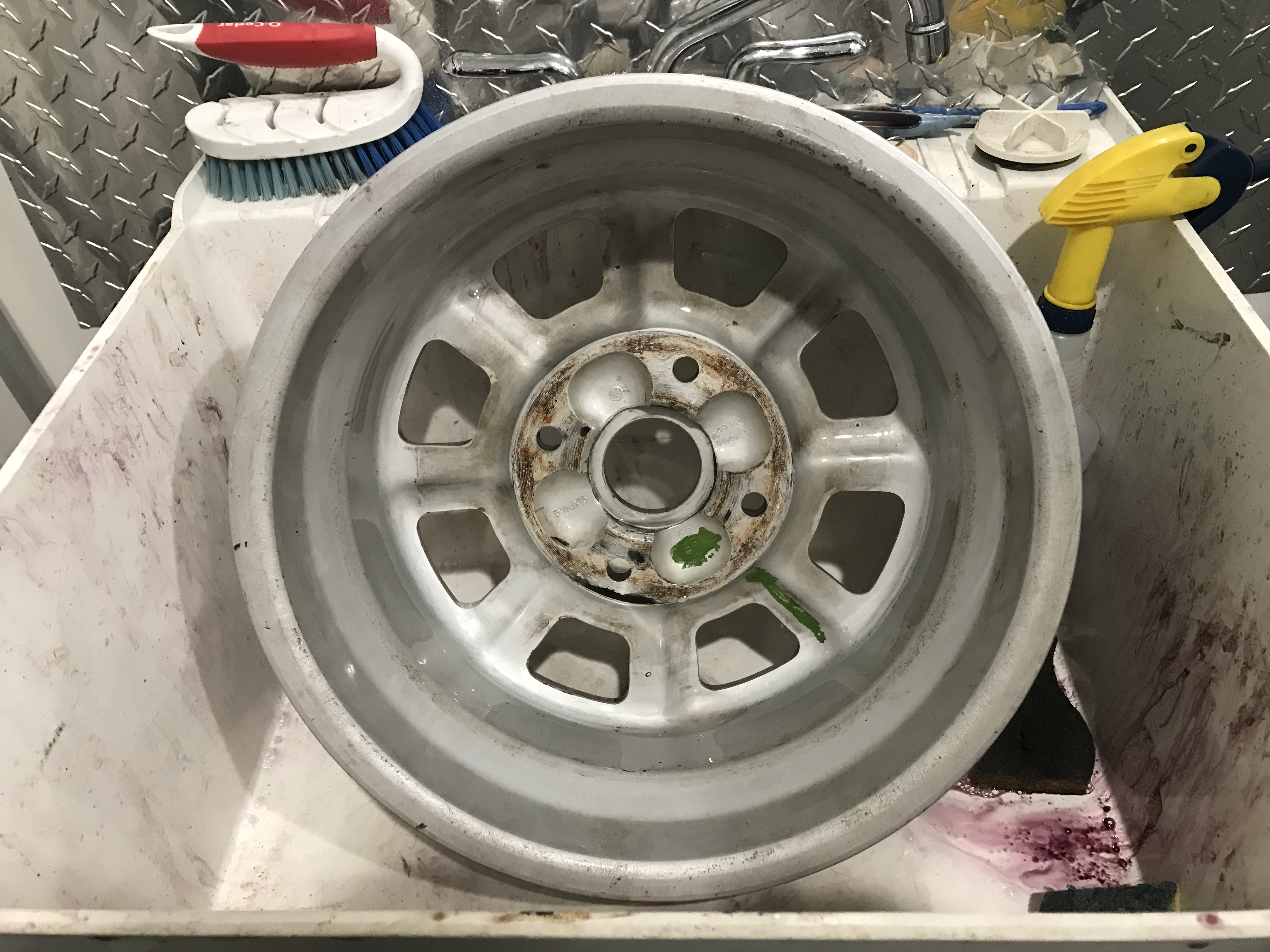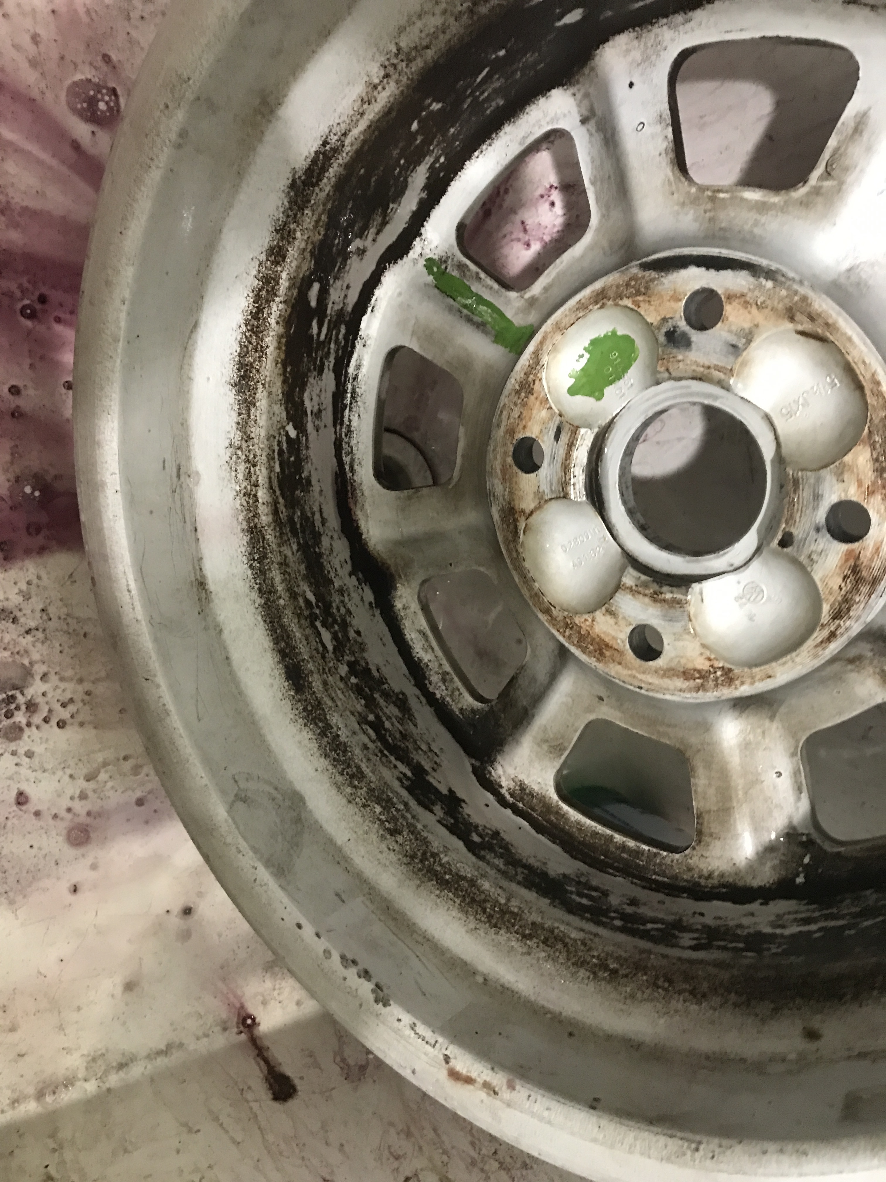 After about an hour of treating, soaking, scrubbing, and rinsing--done! Just one more wheel to go.