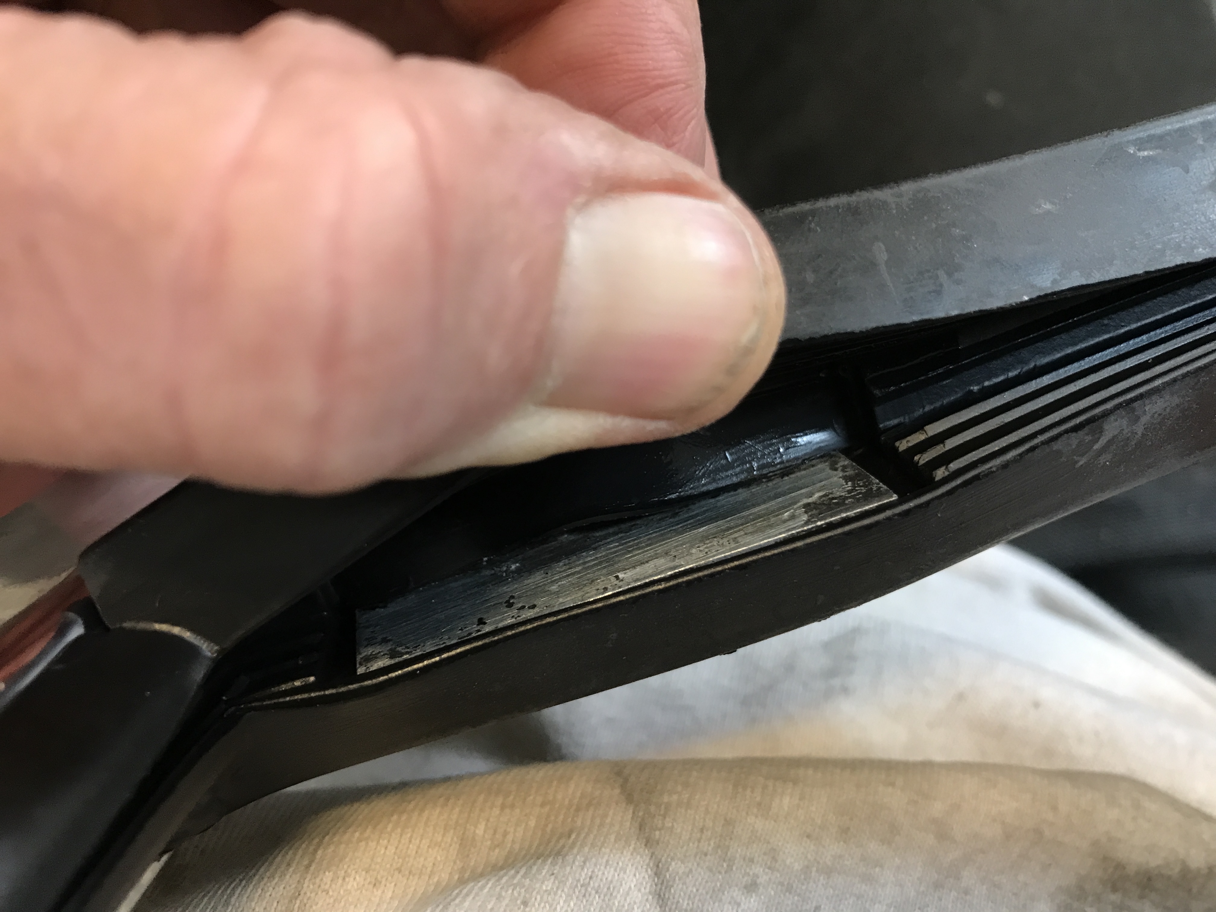 Here's the triangular piece from below, inserted into the horizontal section of the vent window rubber. I had to cut a slit in the very thin rubber there.