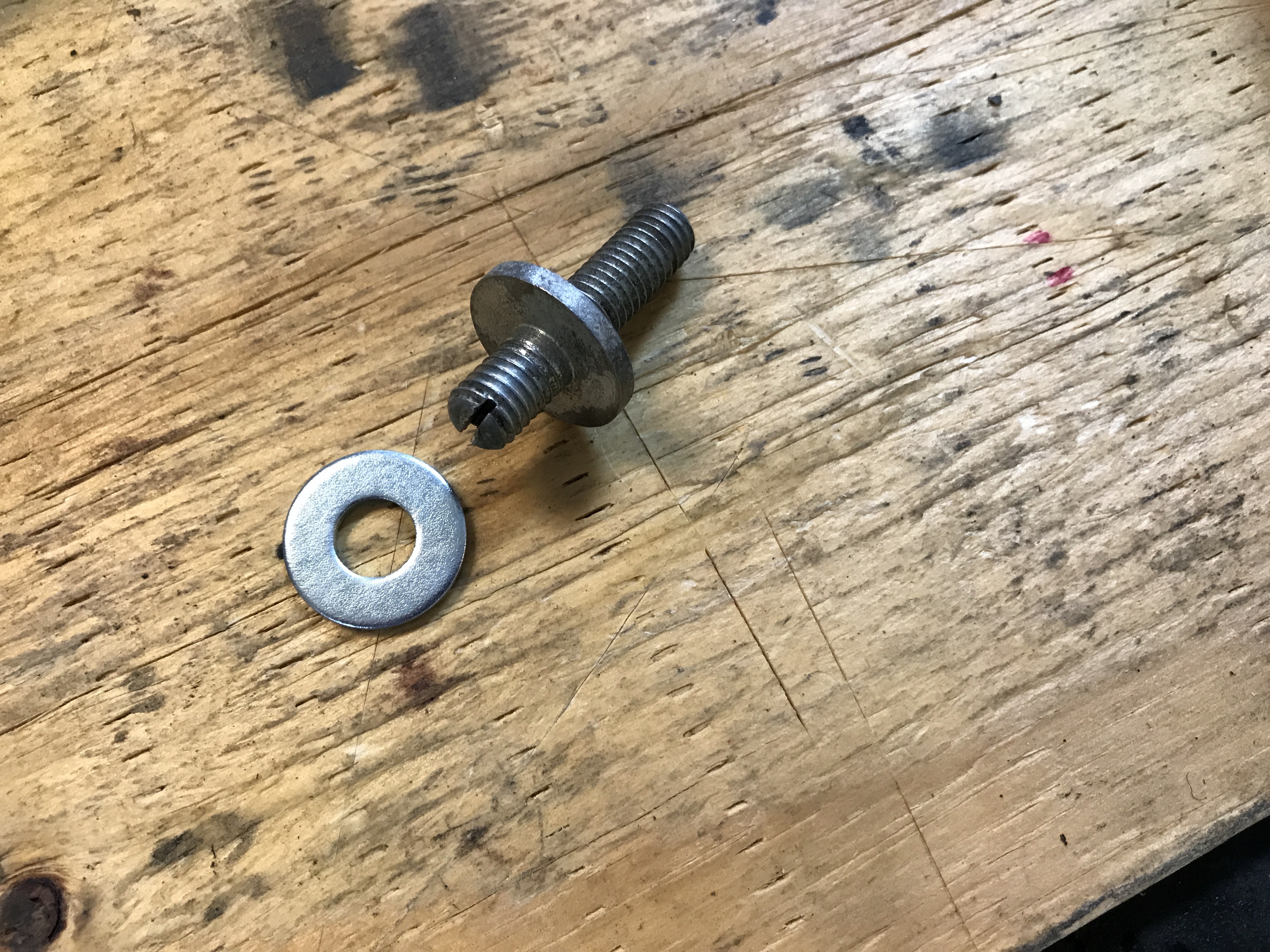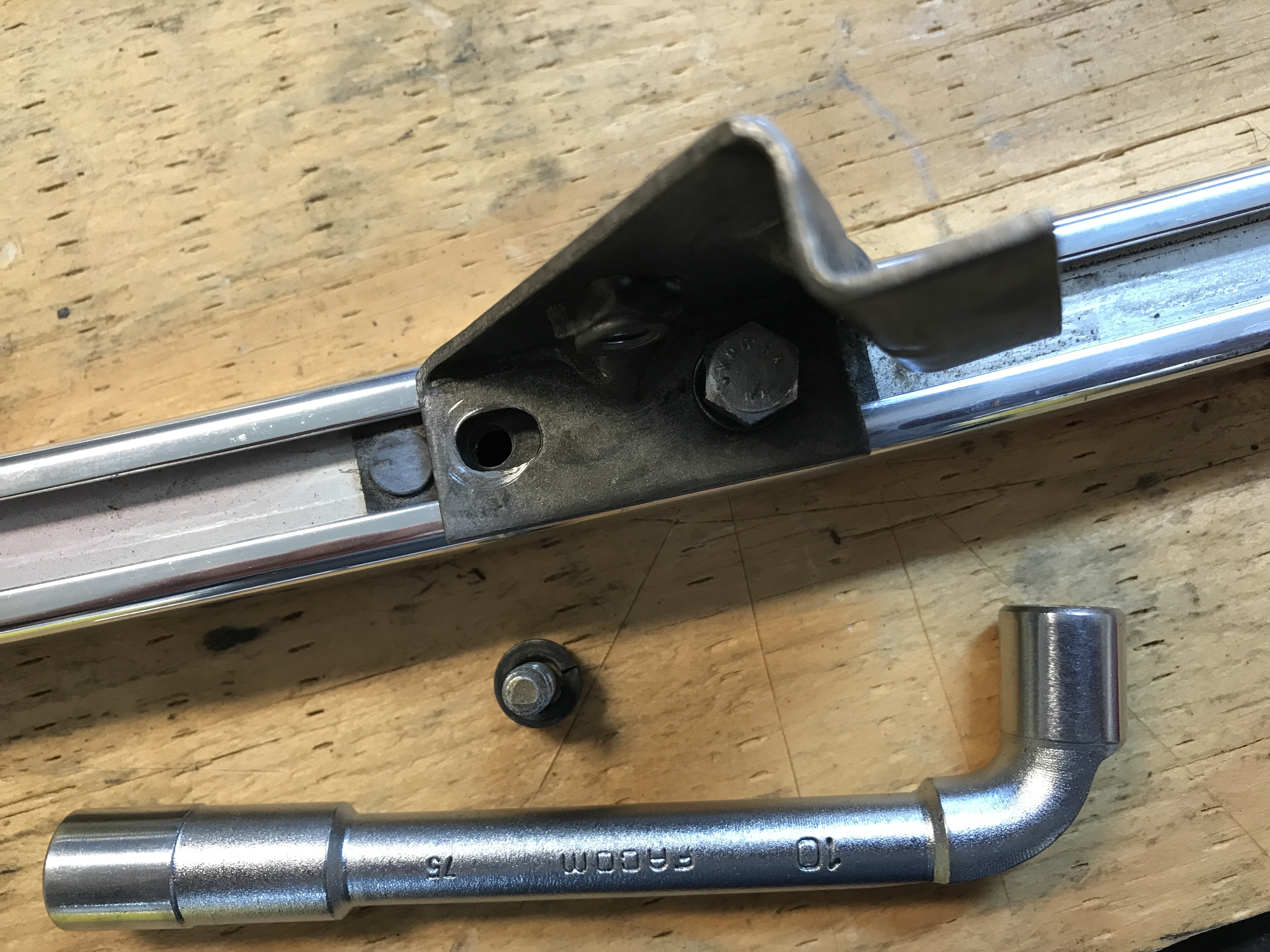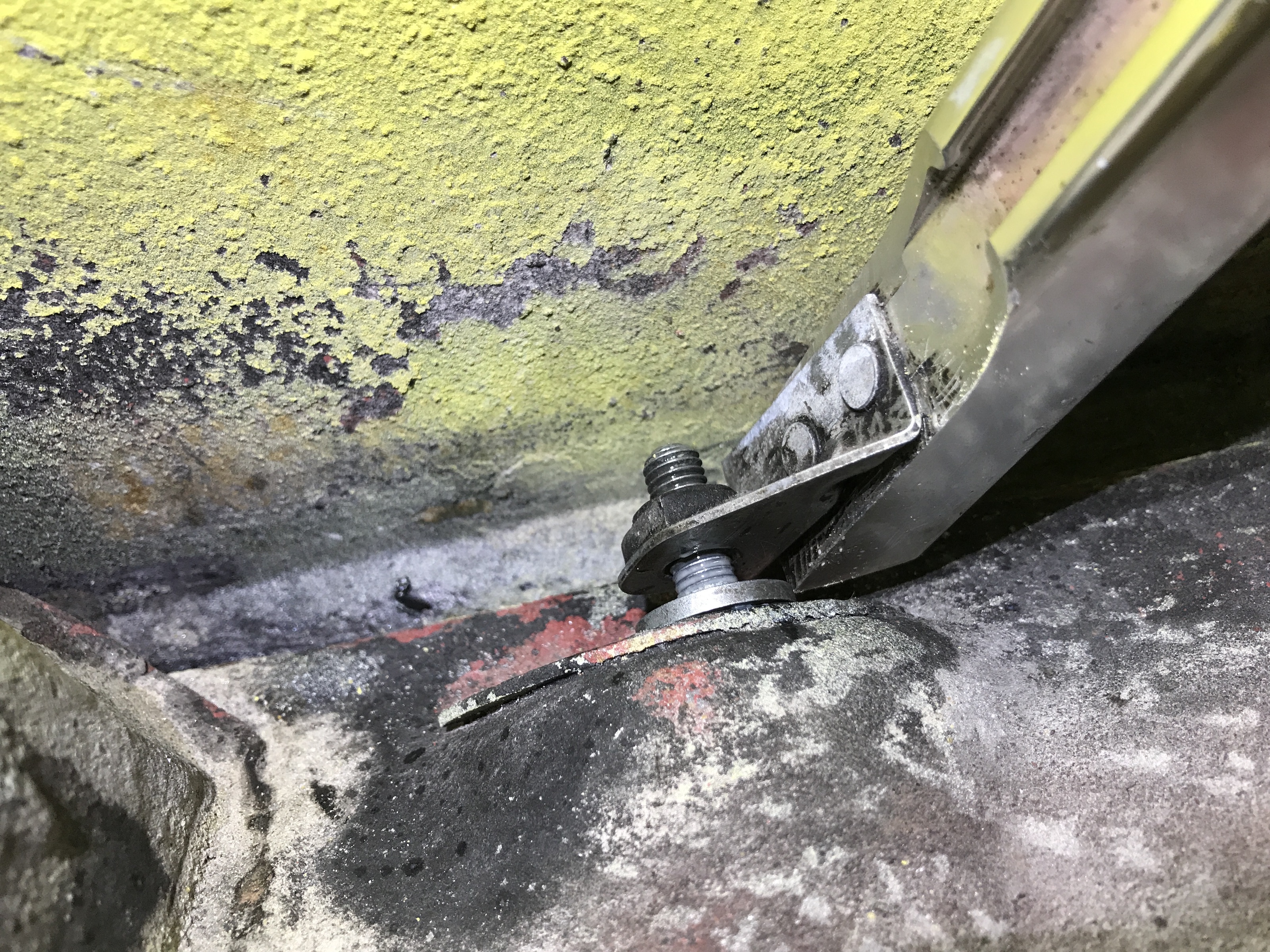 Then two M6 bolts at the top. The rear one (right) attaches the triangular brace, and thus the vertical channel, to the door. The front one attaches a second narrow metal tab to the door.