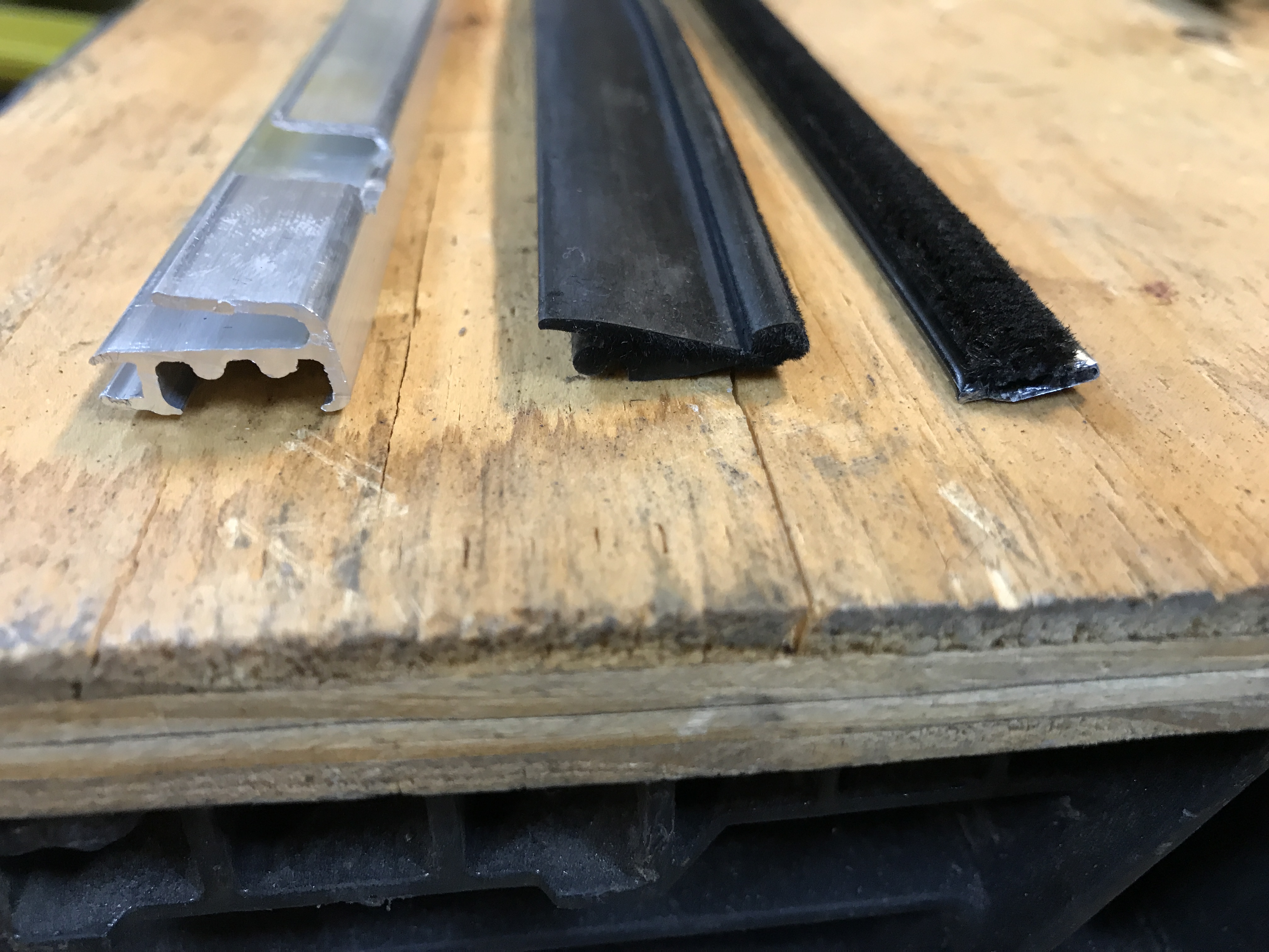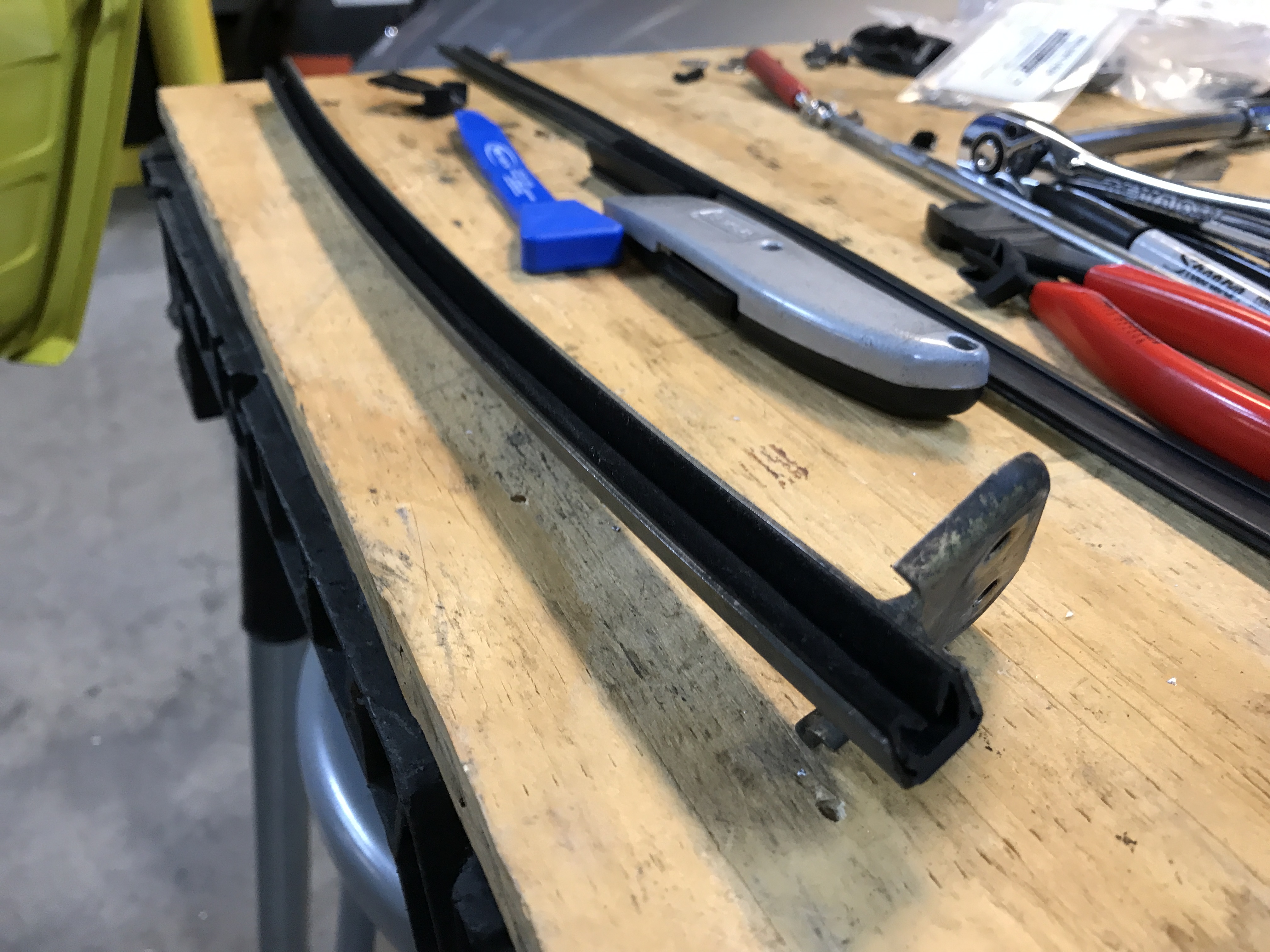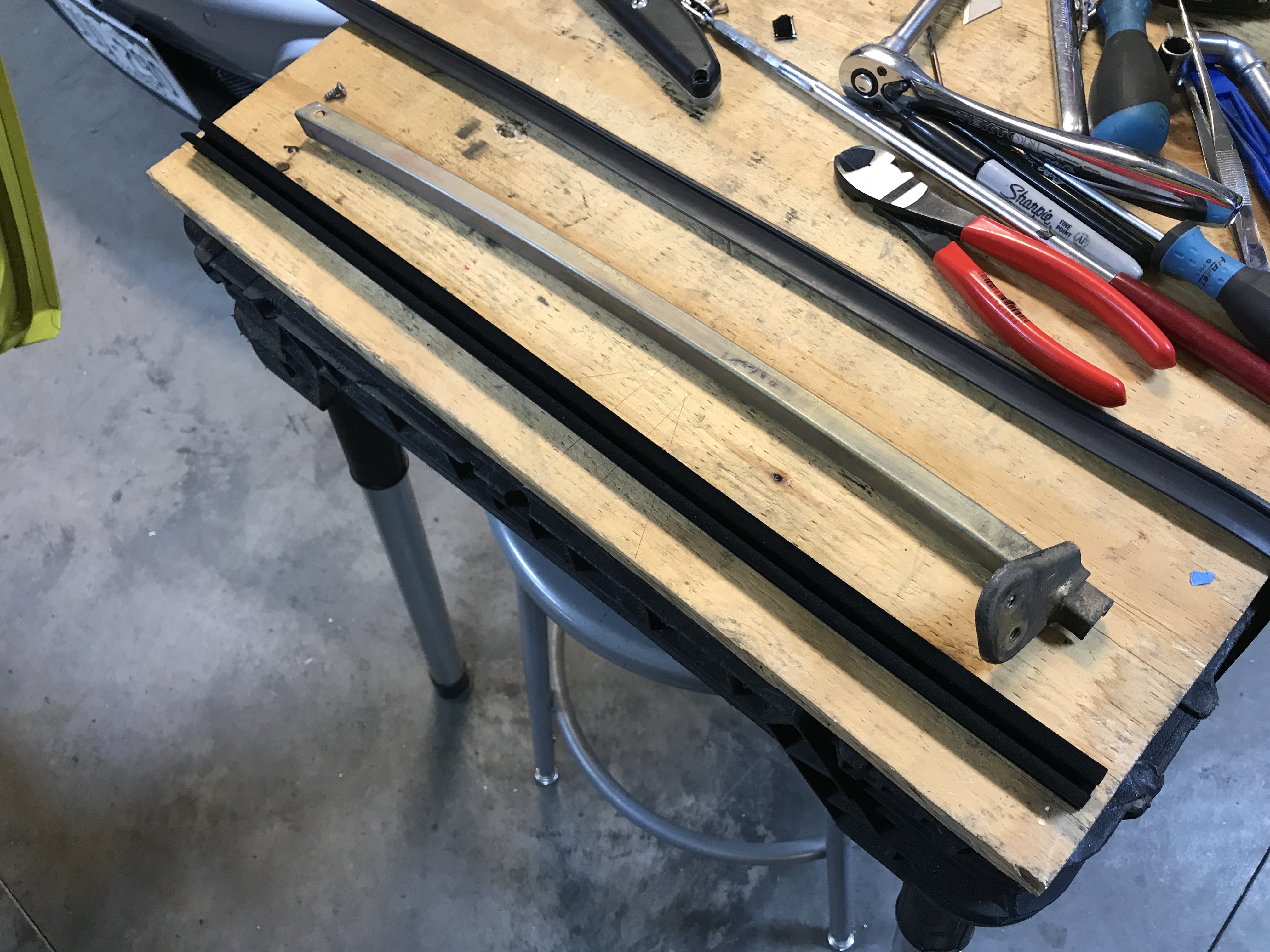 Back to the right side, and prep before the main window. Here are the new aluminum window sill strip, outer fuzzy, and outer scraper.