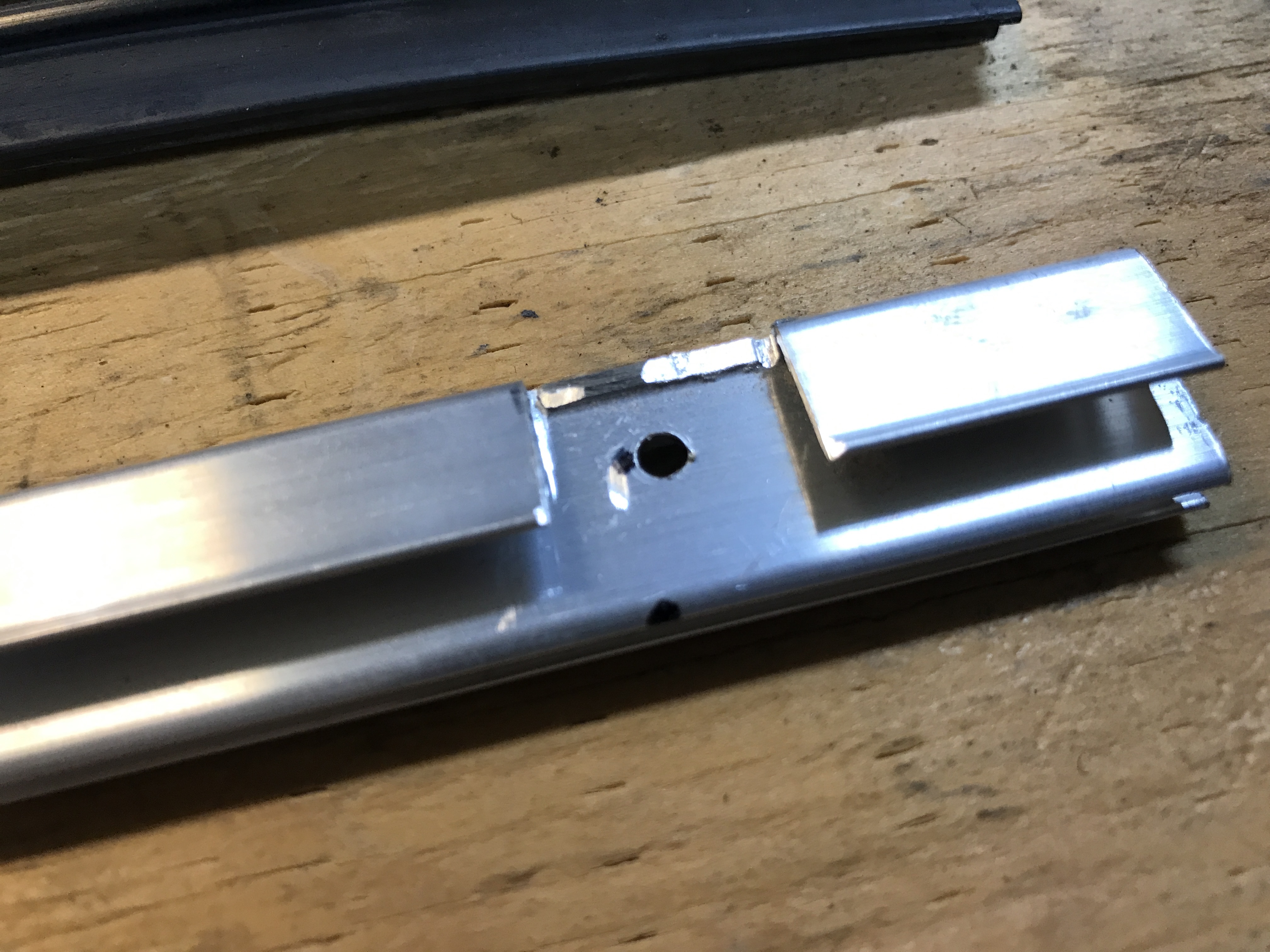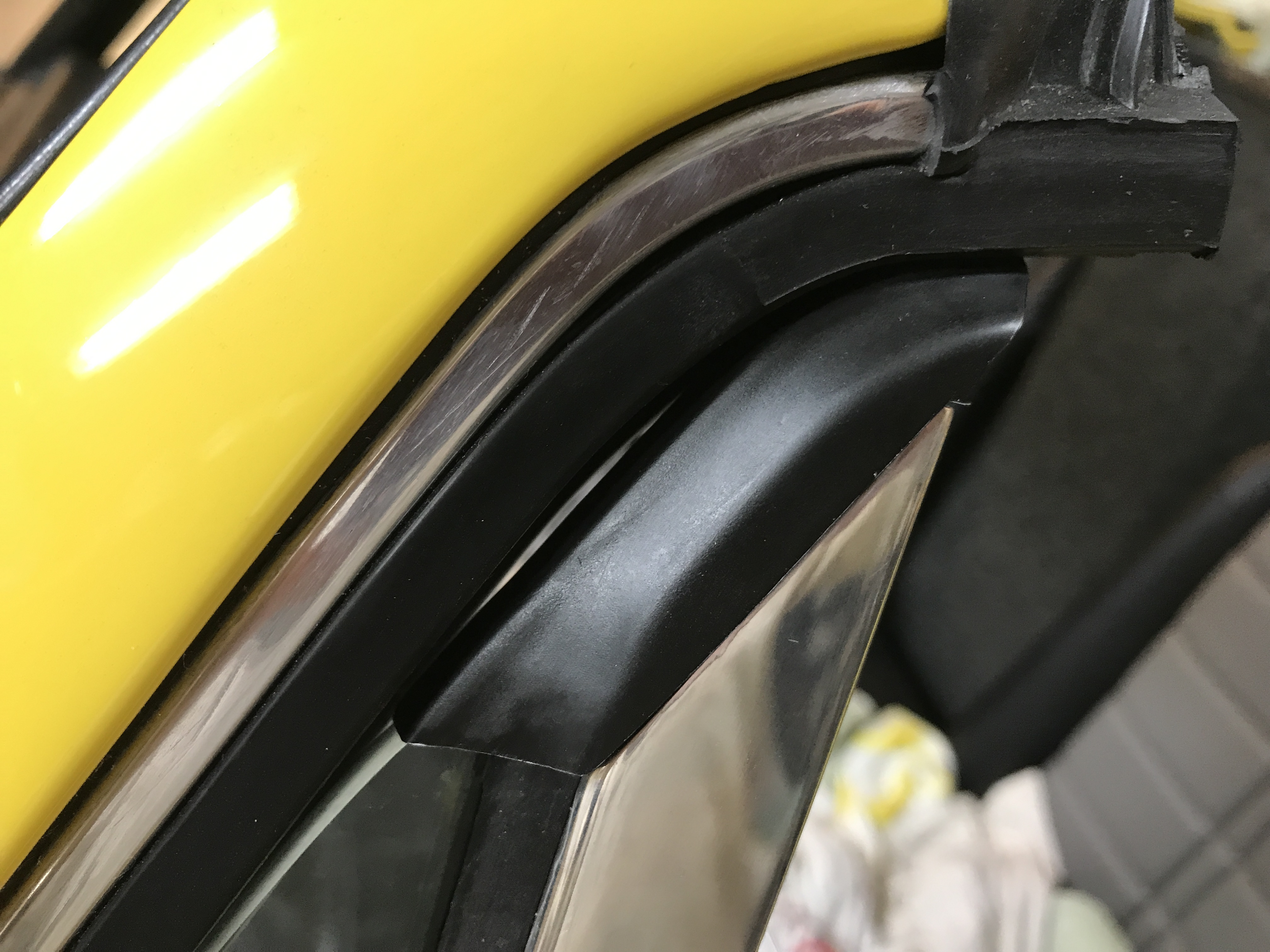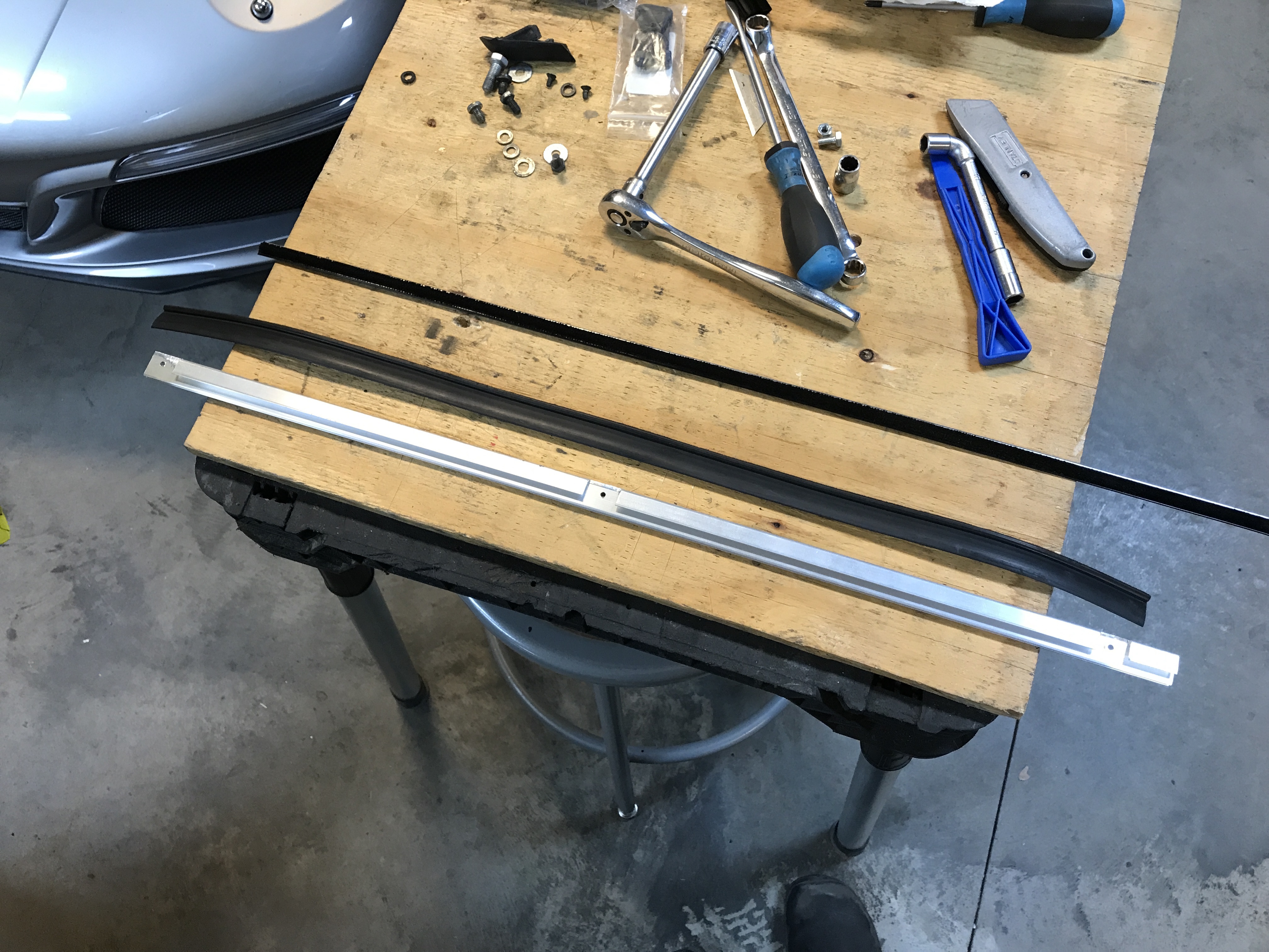 Back to the right side, and prep before the main window. Here are the new aluminum window sill strip, outer fuzzy, and outer scraper.