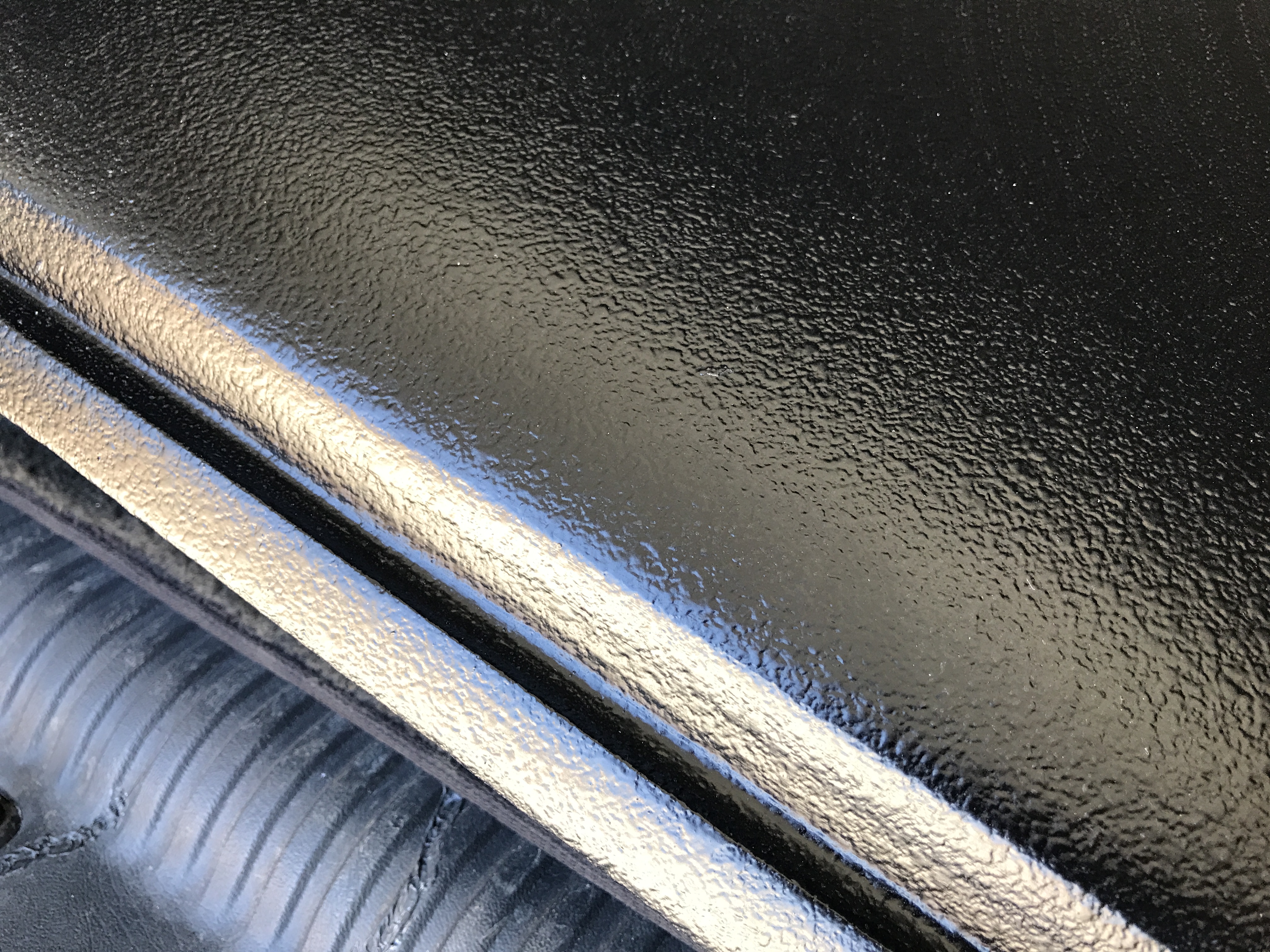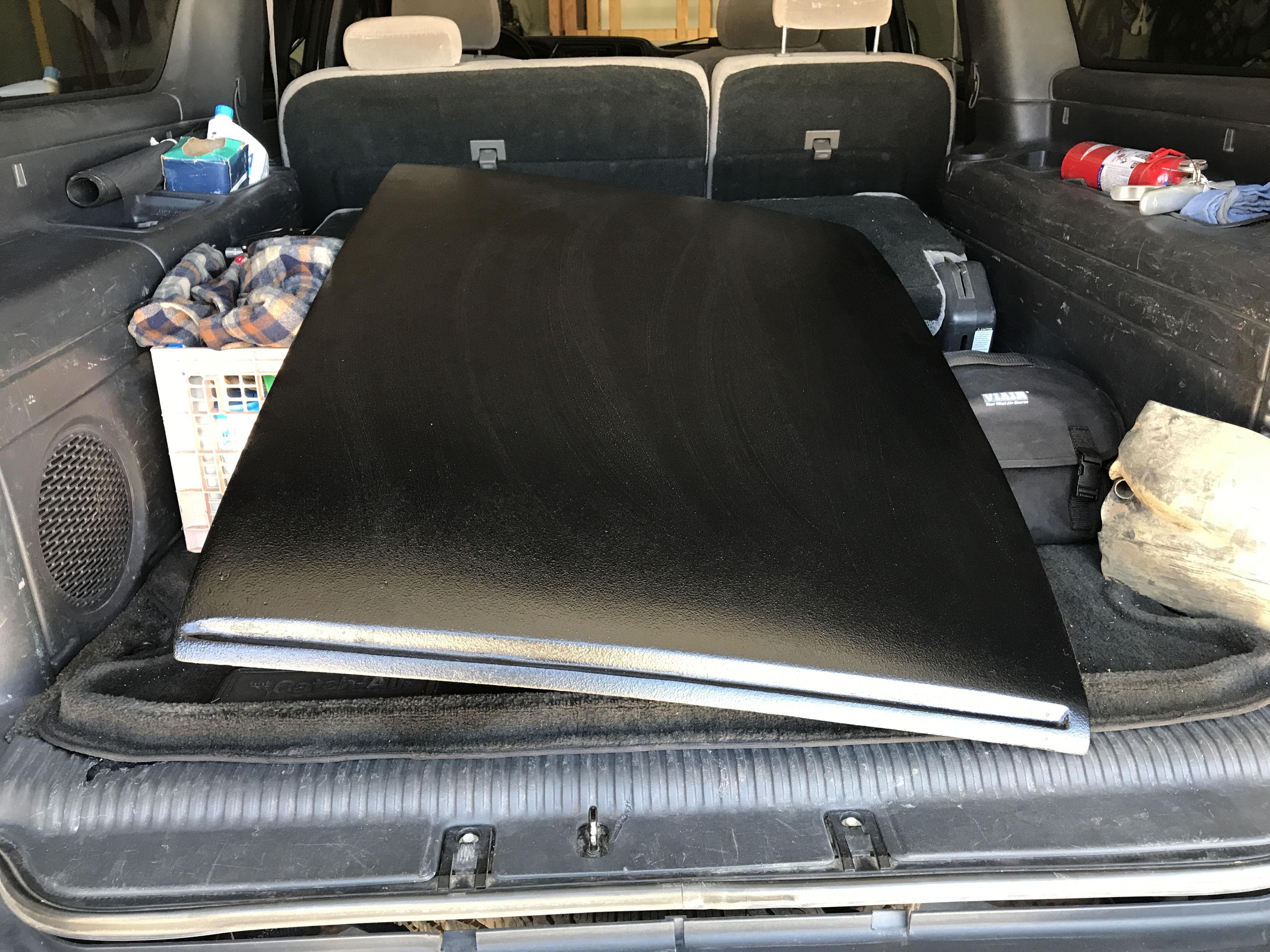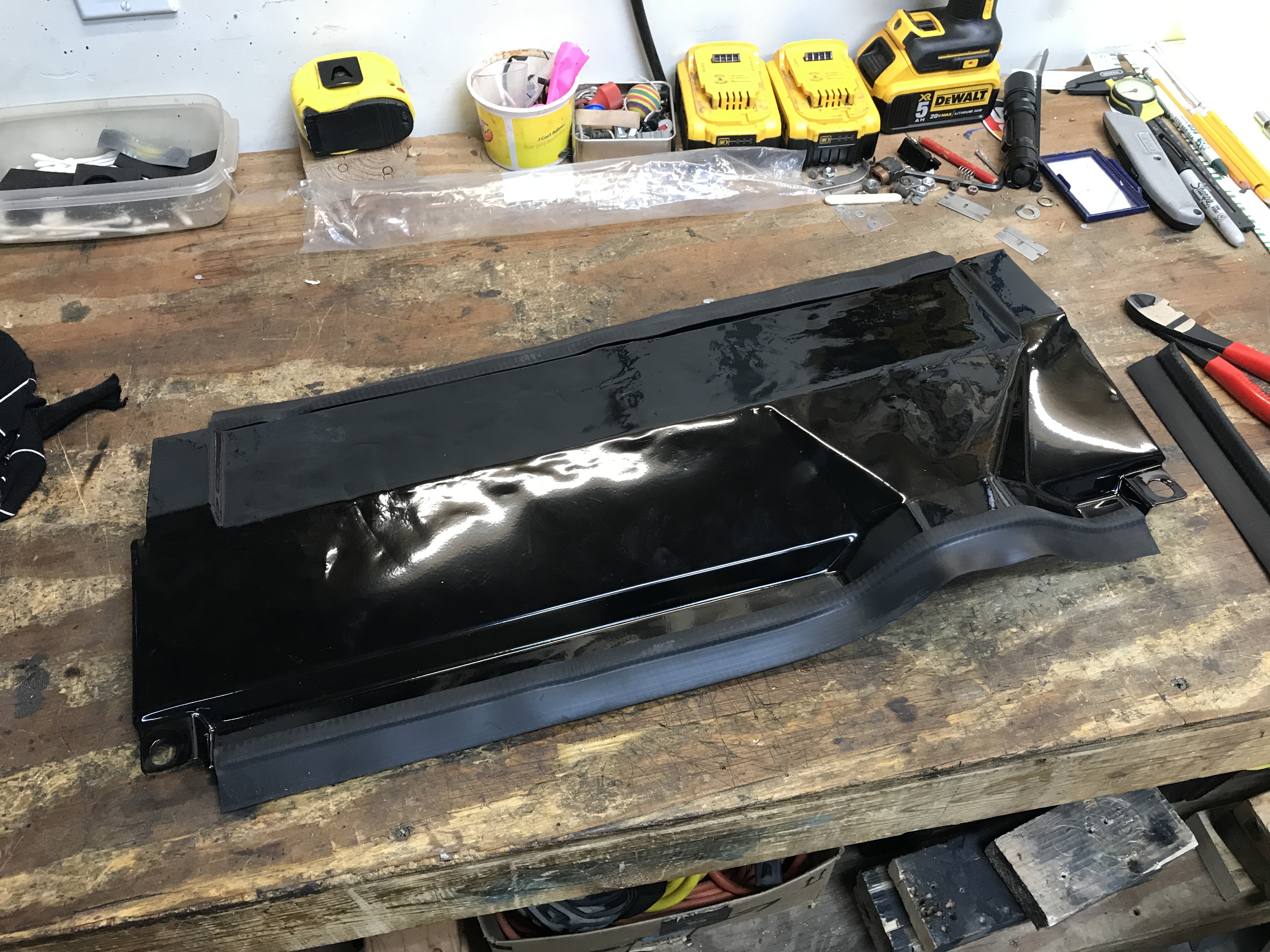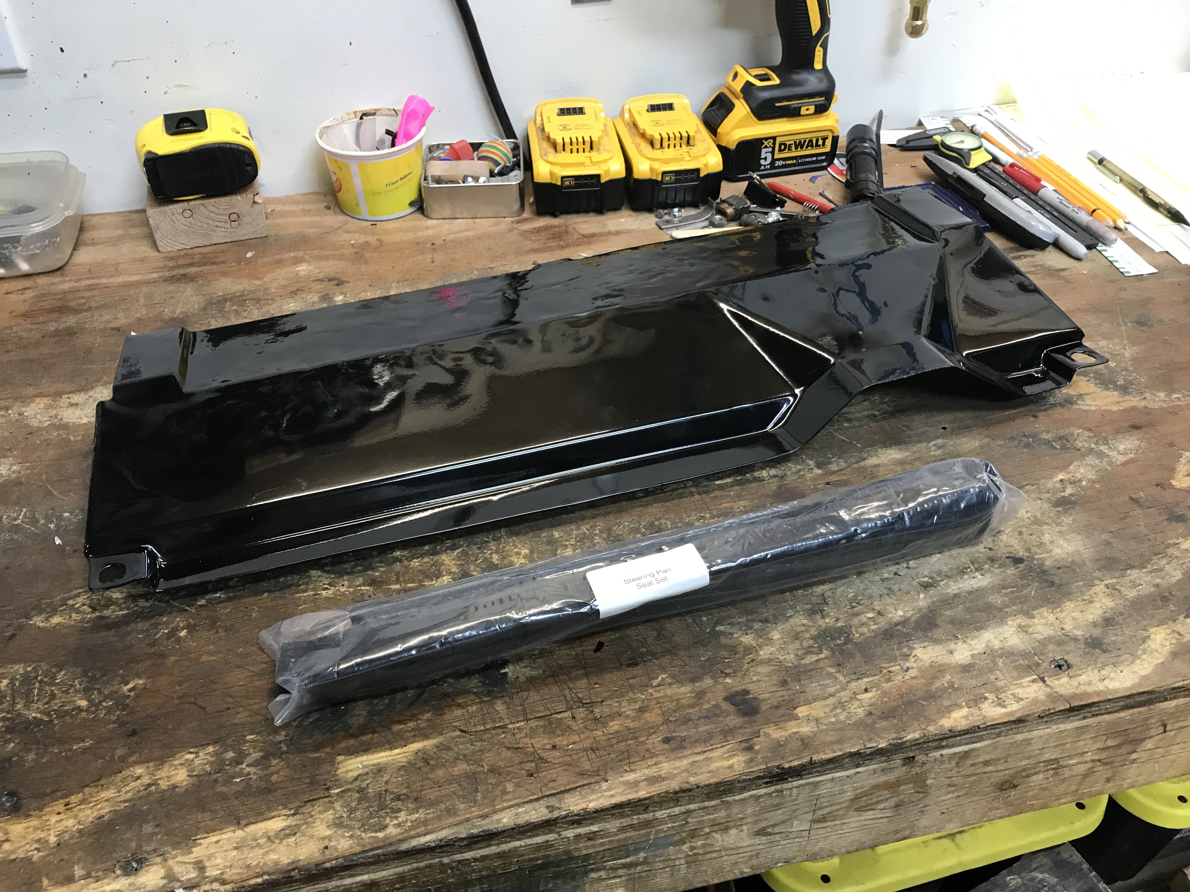 With my confidence high, I got out the front suspension under tray. Kinda lumpy, but nicely powder-coated. And new edge rubber.