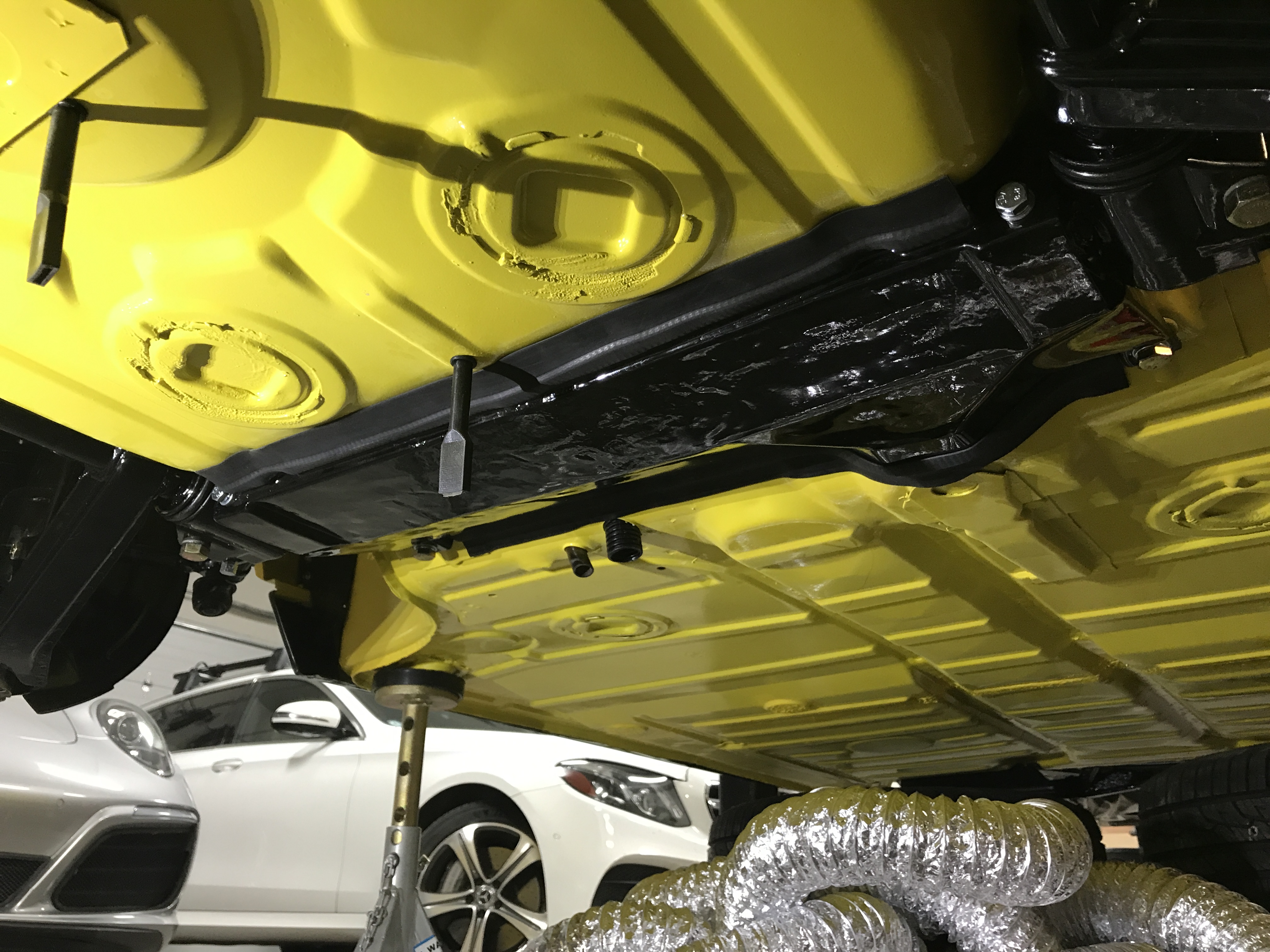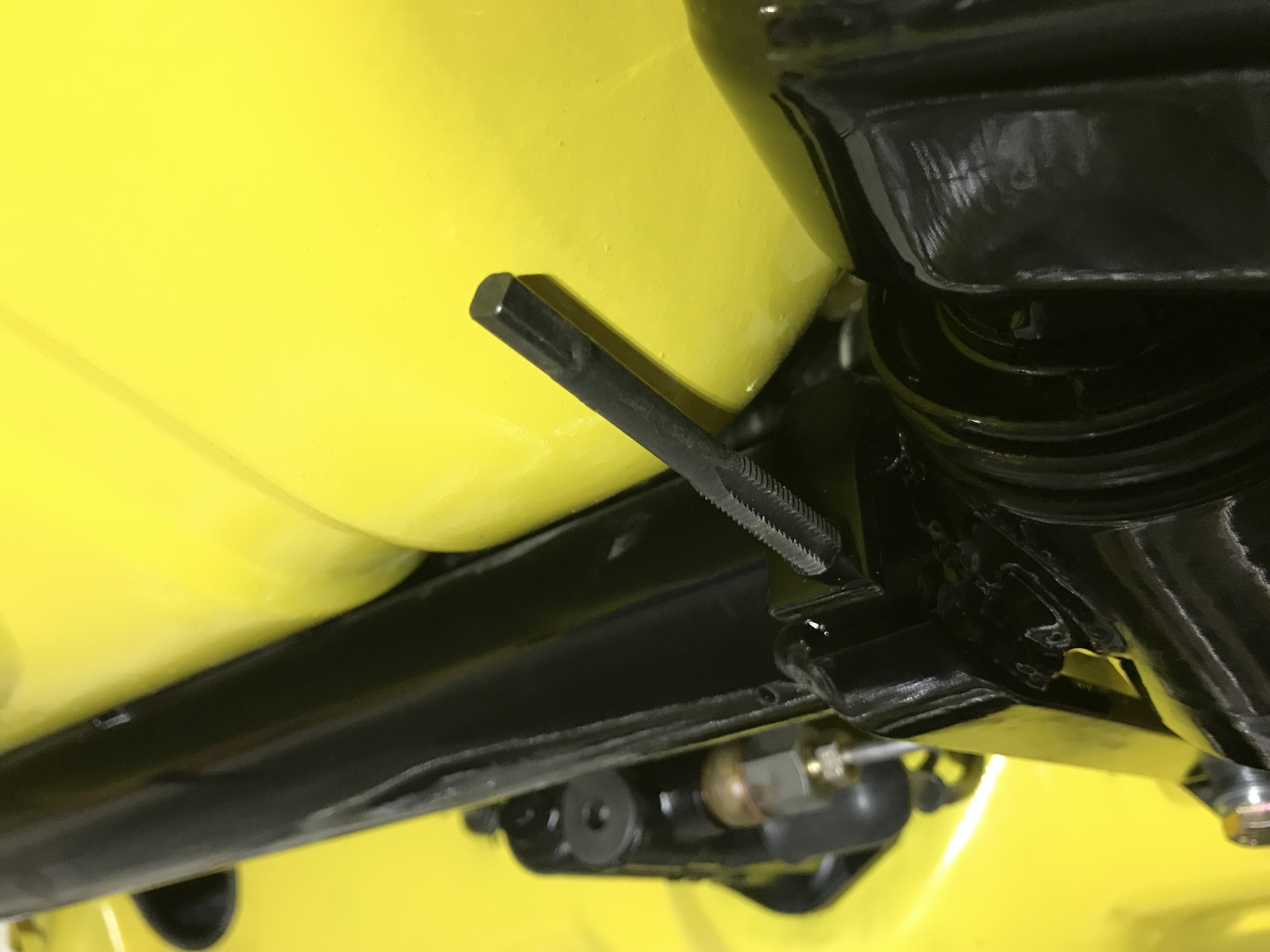 I had to chase the threads in the mounting tabs on the cross member. My powder coat shop was generally very good about protecting threads, but these got coated. Not much room to spin the tap.