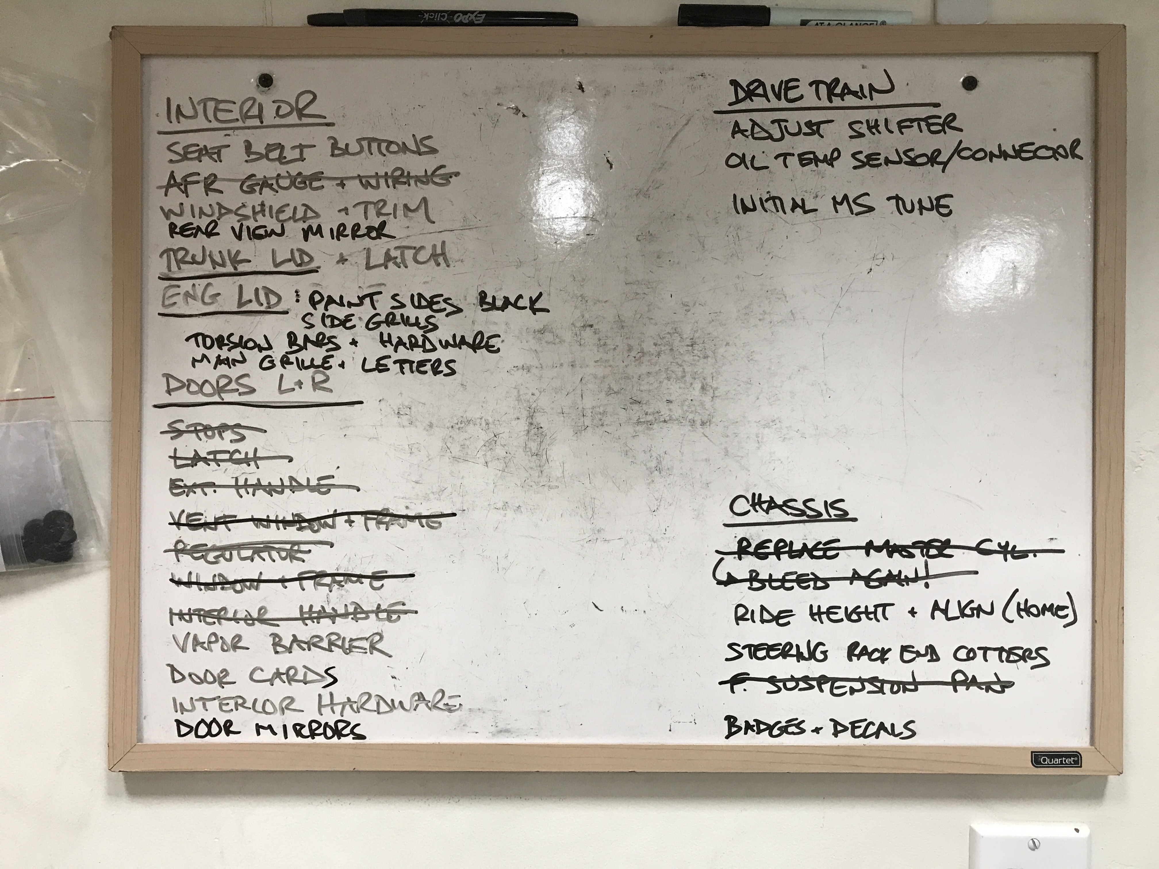 Latest white board check. When all this is done, the car should be ready for a first road test.