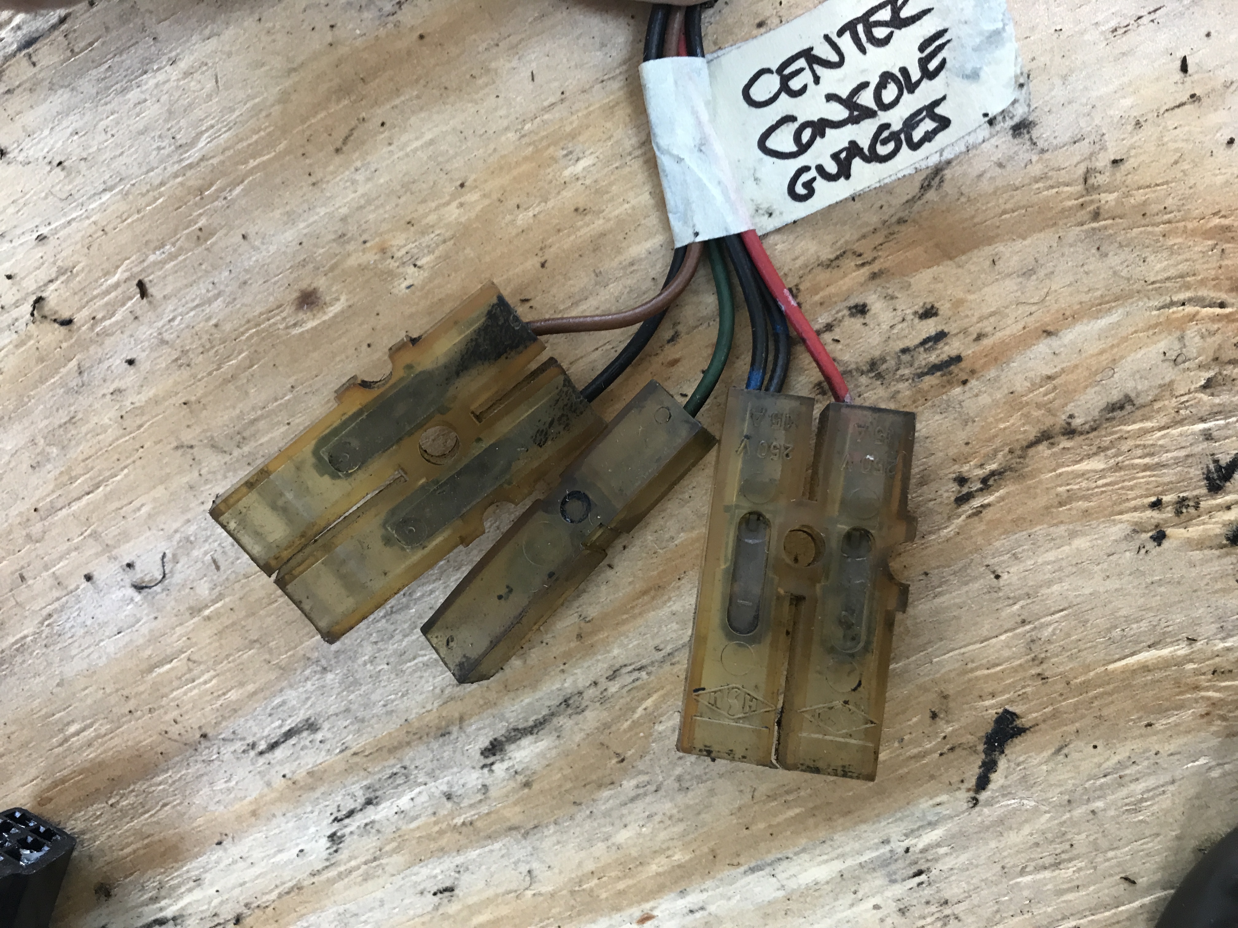 The green wire for the oil temp ducks into the harness below the battery, joins the other wires that enters the interior via the "snorkel", and comes out of the harness at the center console. It is the single connector between the doubles in the photo. The console gauge harness then connects these to the gauges. In my car, the gauge harness wire for the oil temp gauge is white. Attached thumbnail(s) |