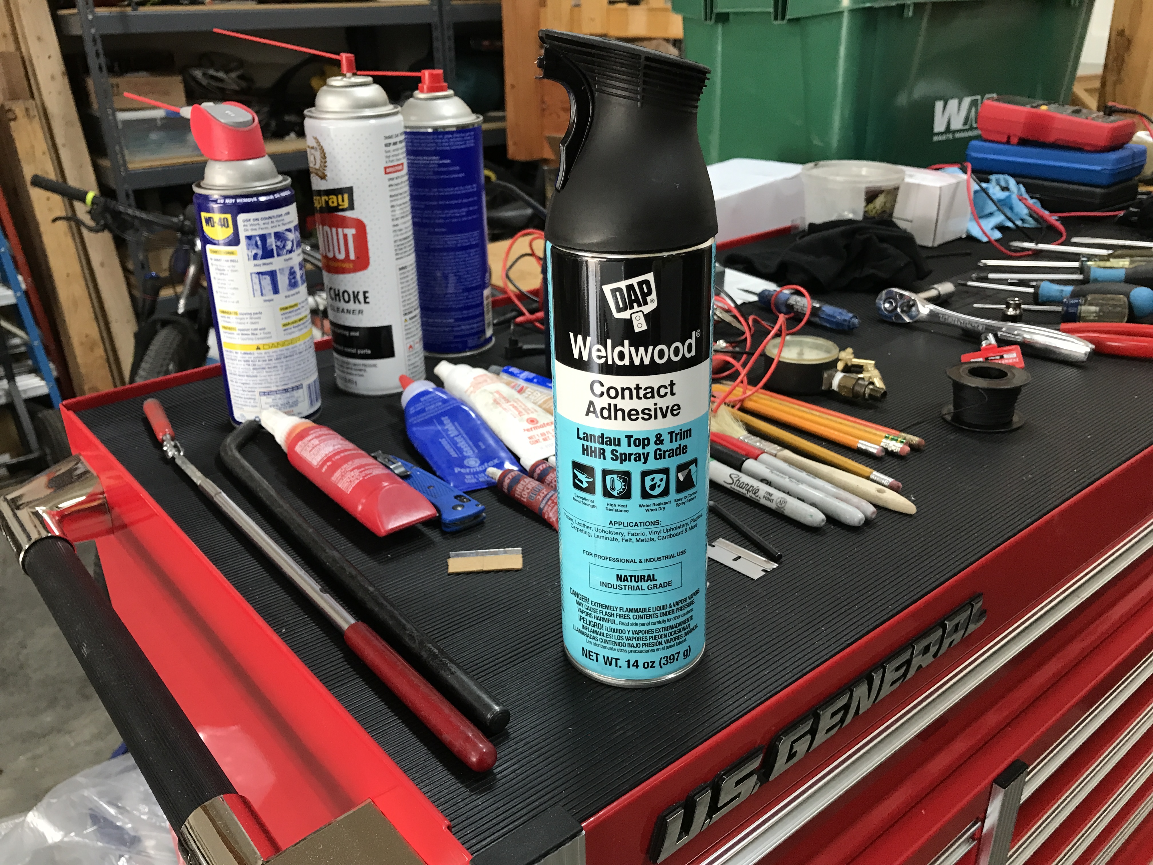Time once again for Weldwood adhesive spray. I spent almost an hour masking off the top, and then sprayed both the top (light coat) and perlon (heavy coat).