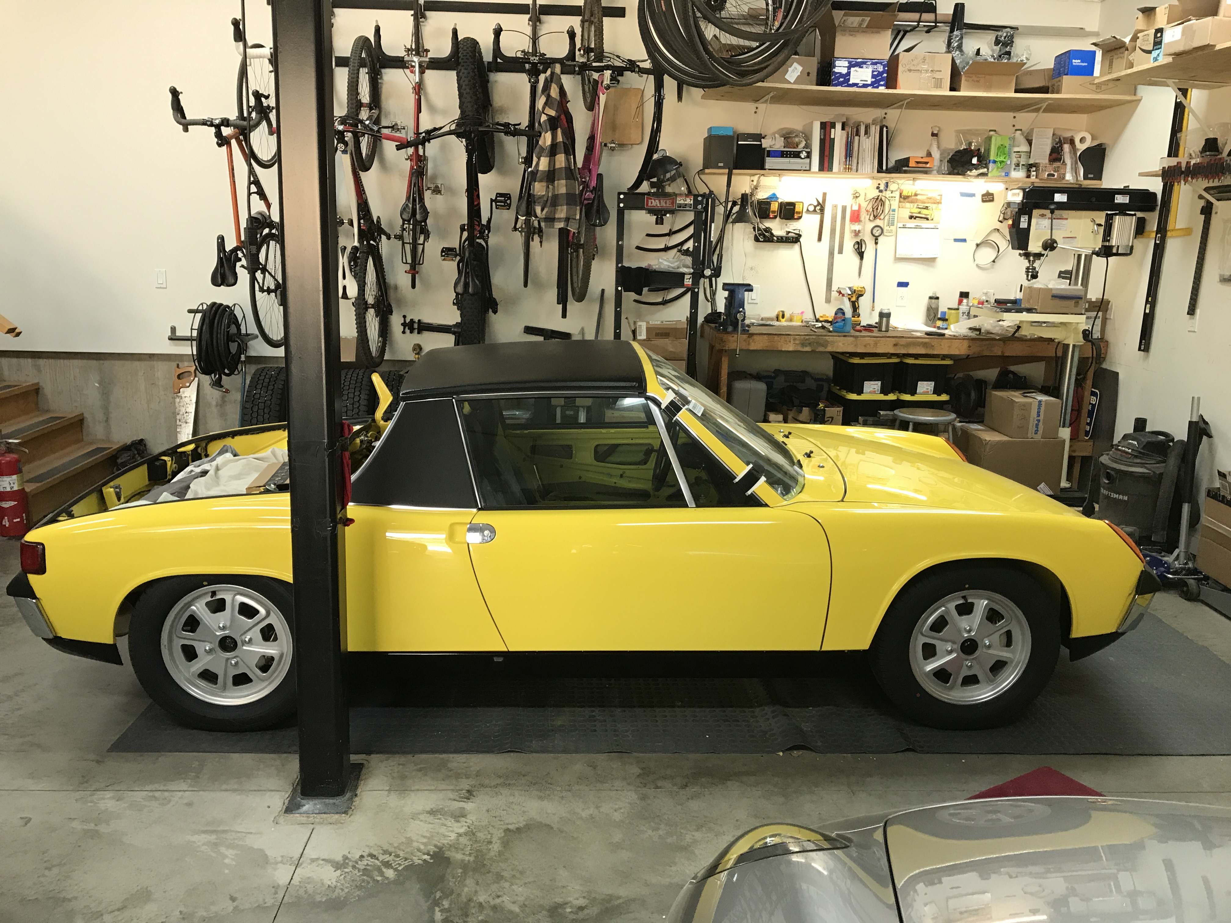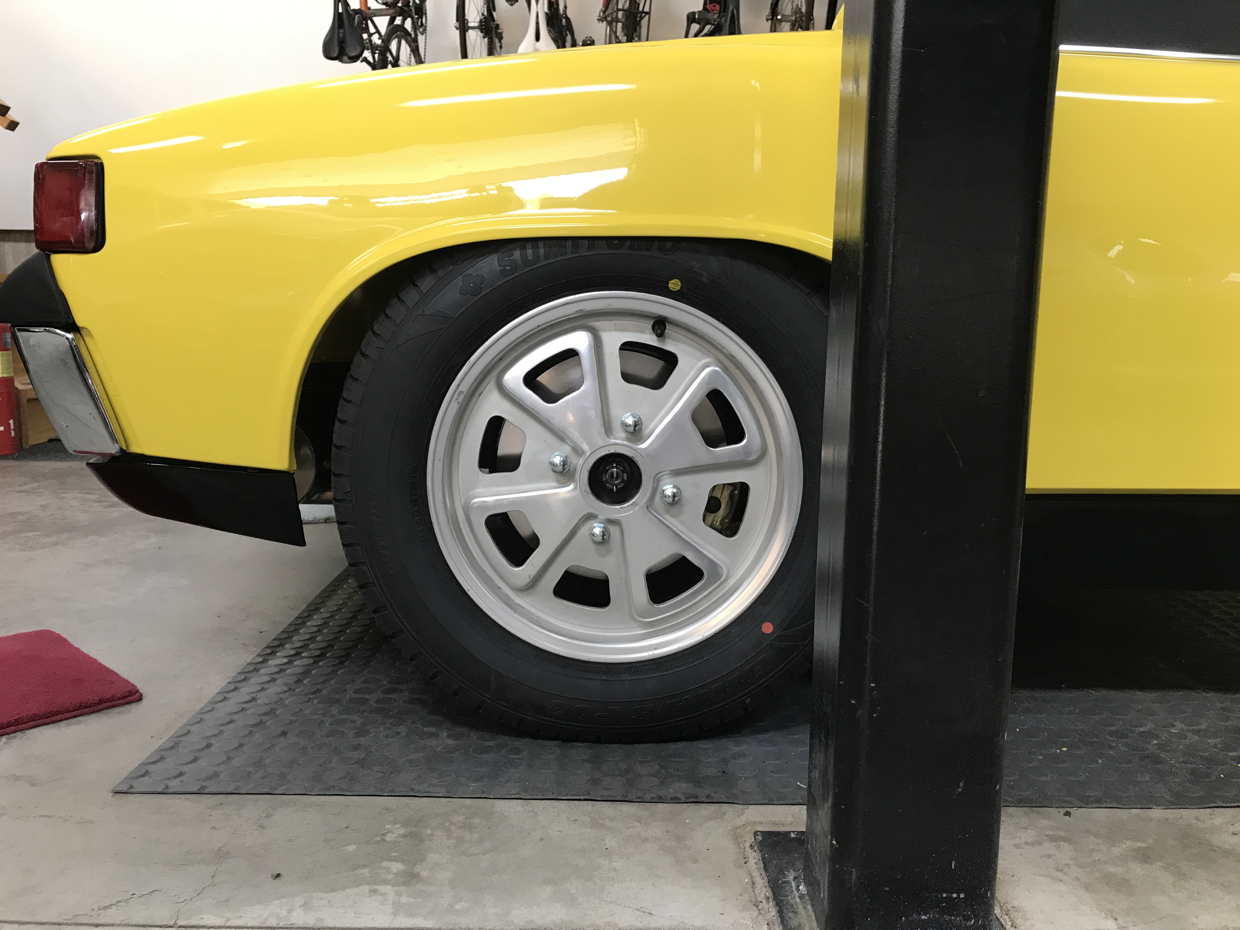 Is 1/8" enough clearance on the rear fender well lip? I am not sure how much these wheels move outward at the top when driving. I can slip my pinky finger between my tires and the rear lips. I was very concerned about tires rubbing anything painted when selecting tires. Here is mine sitting in the driveway Friday after a little drive. I do like the 914 low, but I do not want to be dragging over speed bumps. But they look so much better, in my mind, when lowered. BTW, I am running deep 6 wheels with 195x55x15 Yokohama tires. If I could have got 205x60x15 tires I would have. That looks good. I agree that 1/8" is not enough. I started working on that today. |