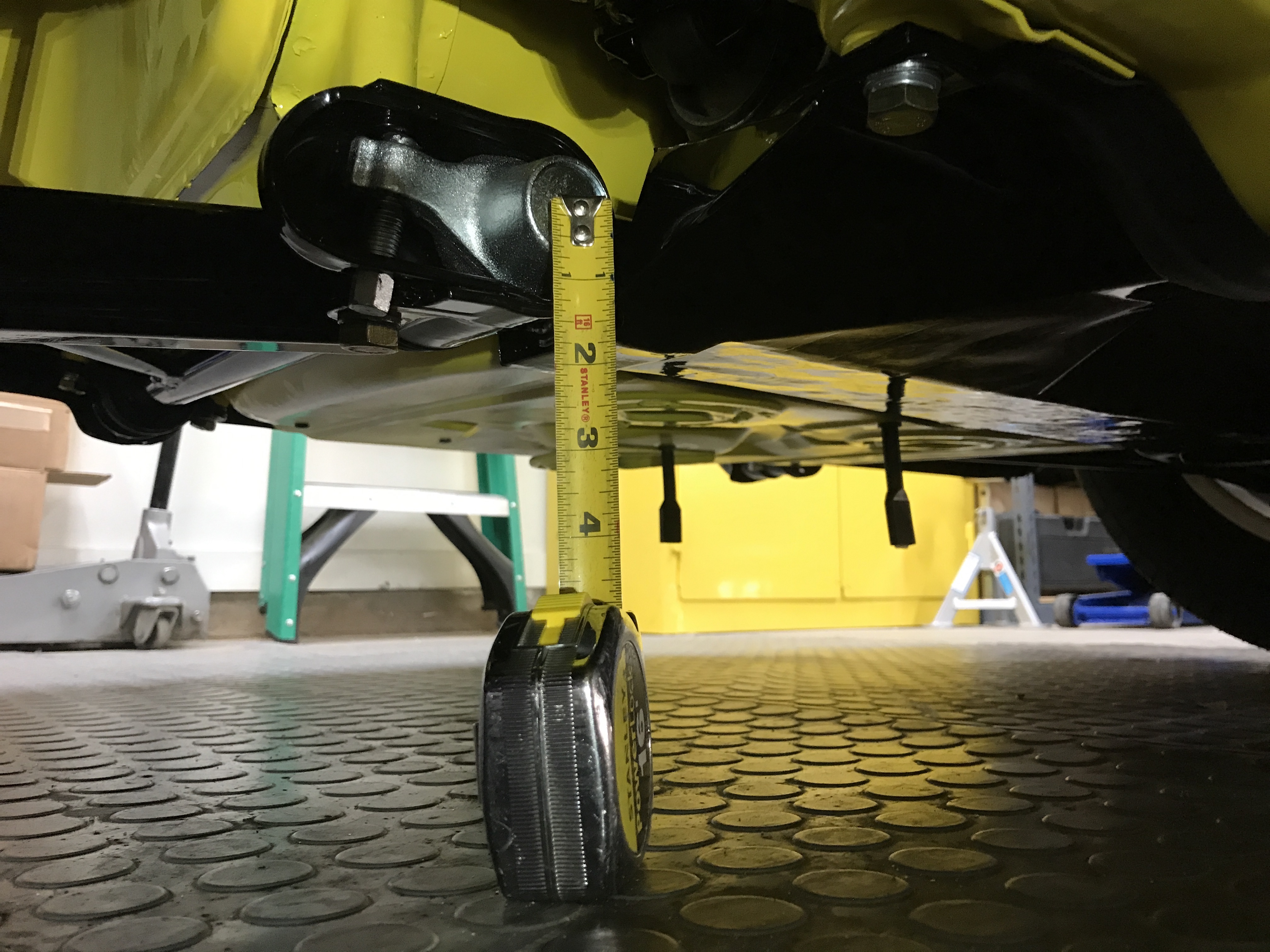 I also measured the height of the torsion bar centers about 7.4" on both sides. Subtracting this from the hub center height (11.8") gives 4.4". The factory spec is 3.5".