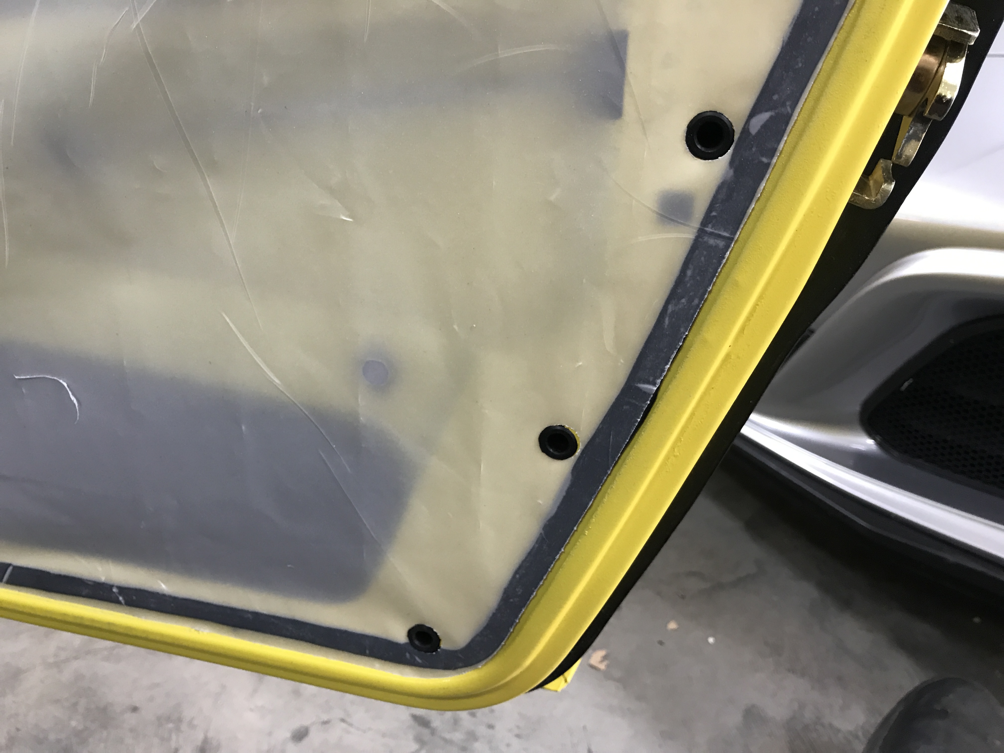 I aligned the plastic sheet with all the door card retaining plug holes. Fit is a bit big, but when I pulled it taut, the perimeter holes did not line up.