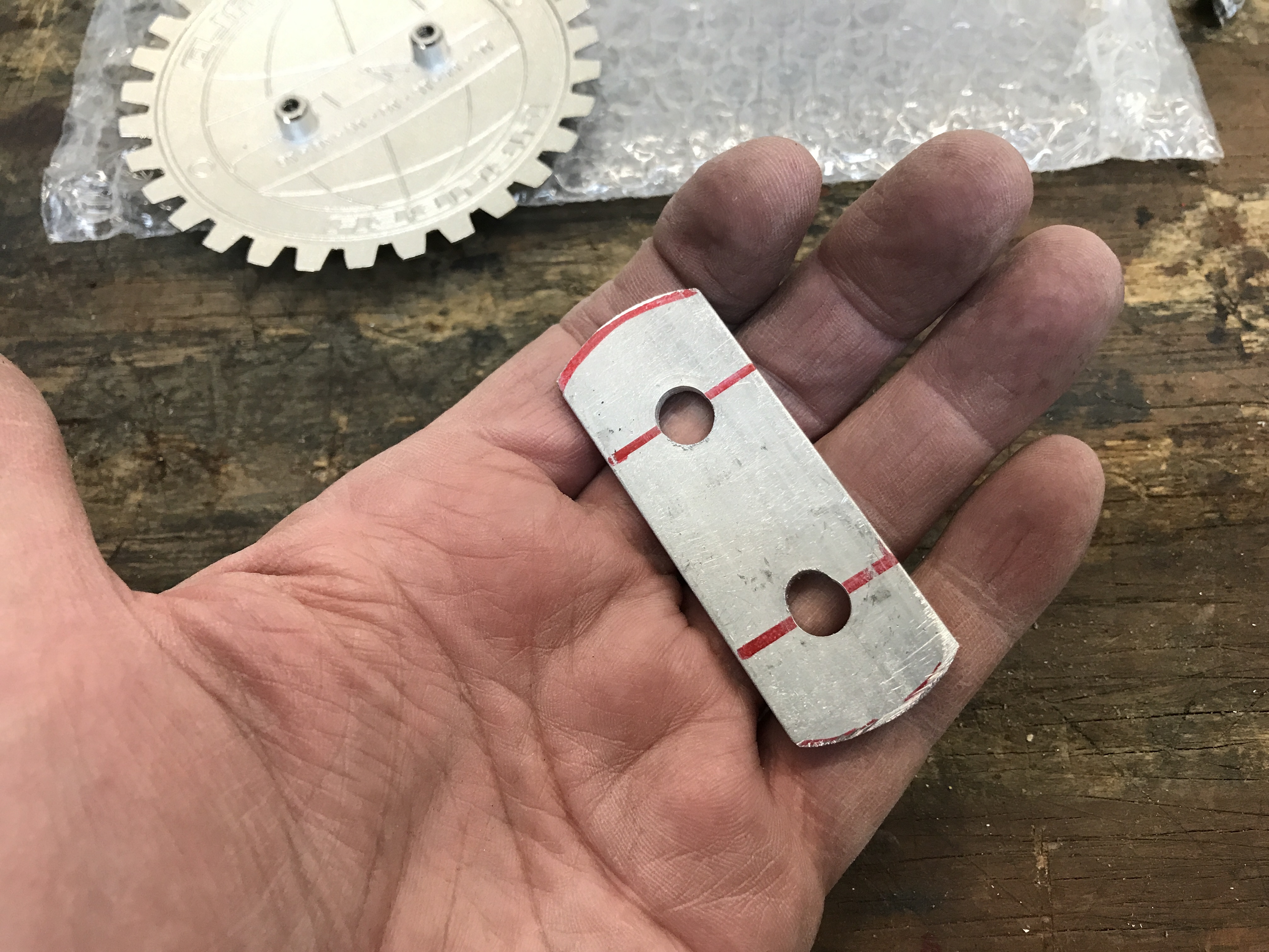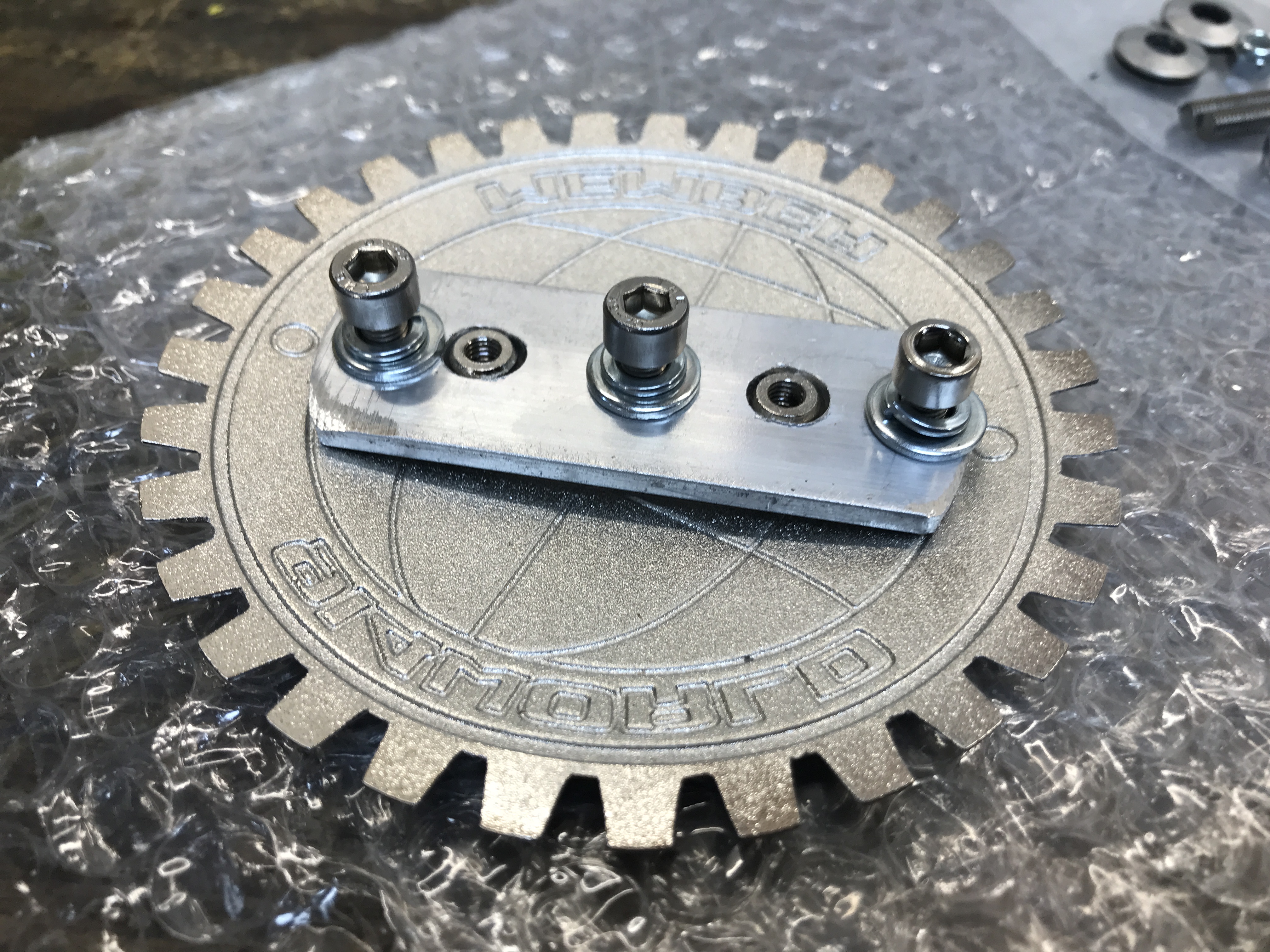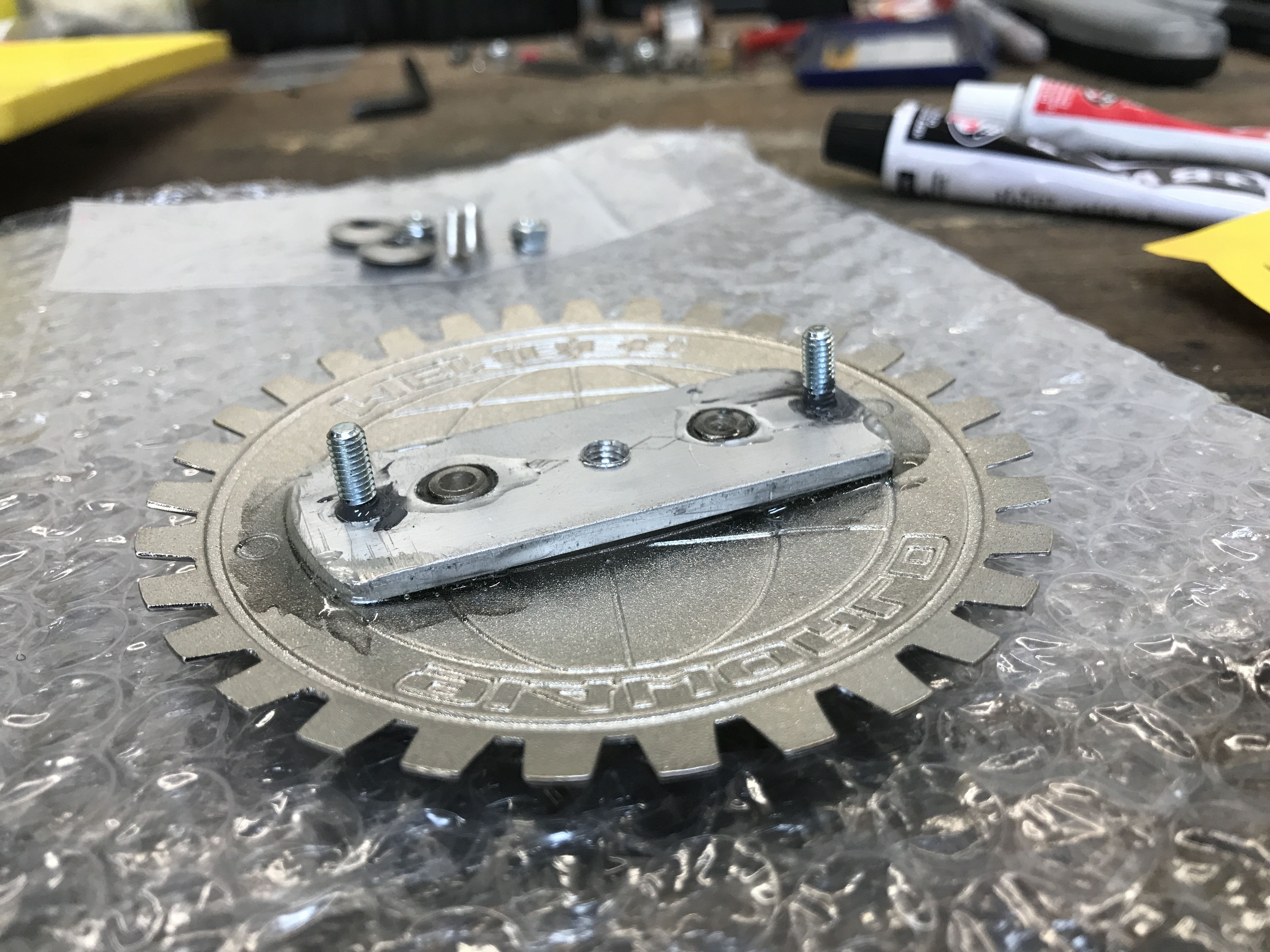 Pivot to another task: inventing a new attachment for the 914 World grille badge. As delivered, the stud holes on the back of the badge do not fit the spacing of the holes in the grille. This is a prototype for a mounting adapter.