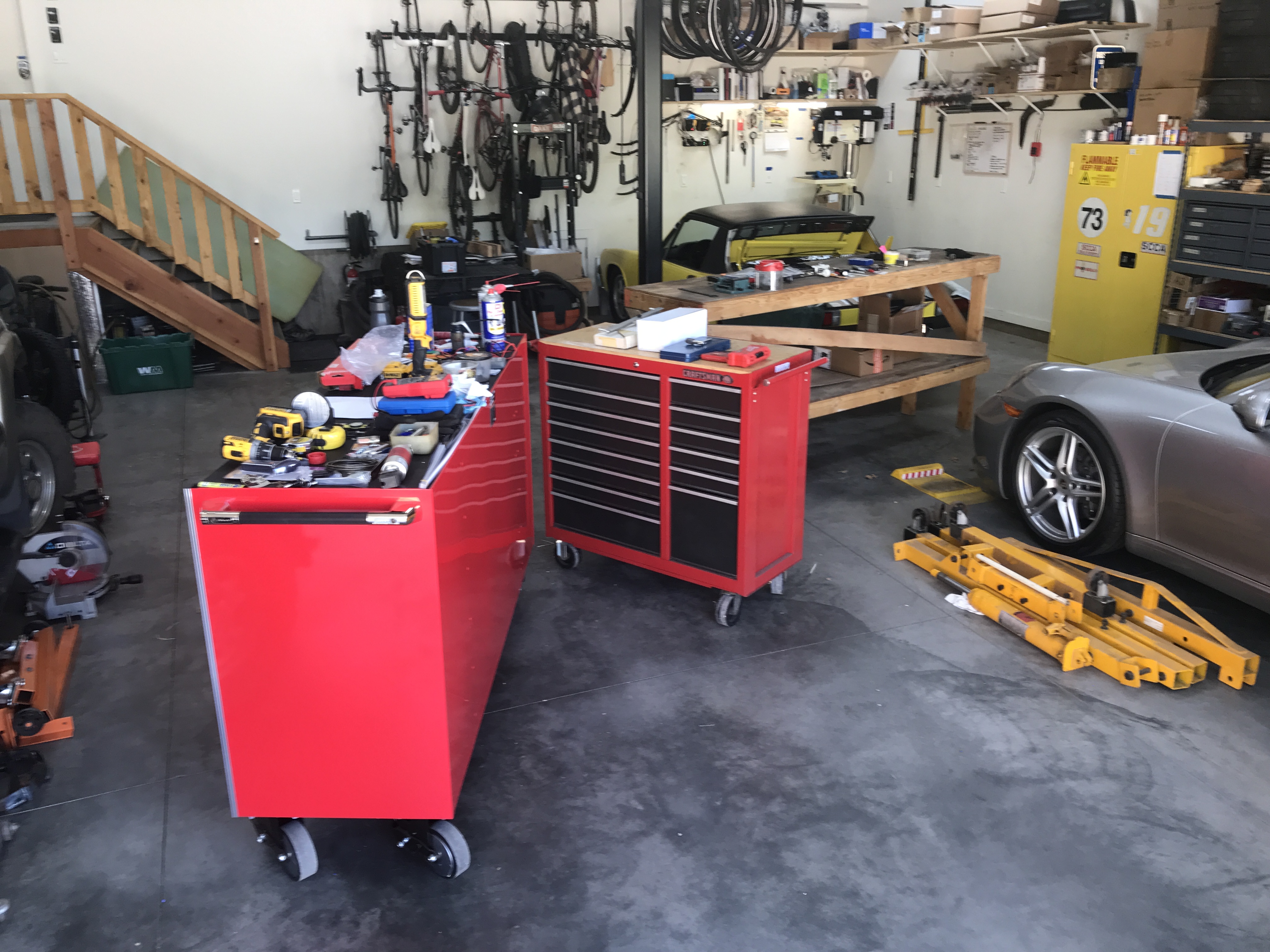 Then I started on something I did not plan for today. For almost 3 years of work, from wheels to jack stands to rotisserie to dolly to jack stands to wheels, the 914 has been sideways in my garage. I knew eventually it would go lengthwise, in front of my 911. Just for fun I started to move things around, including my workbench.